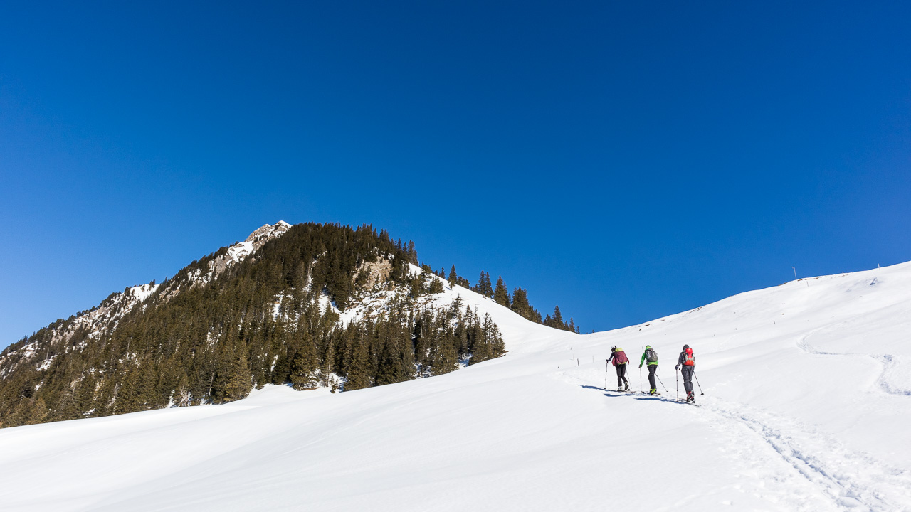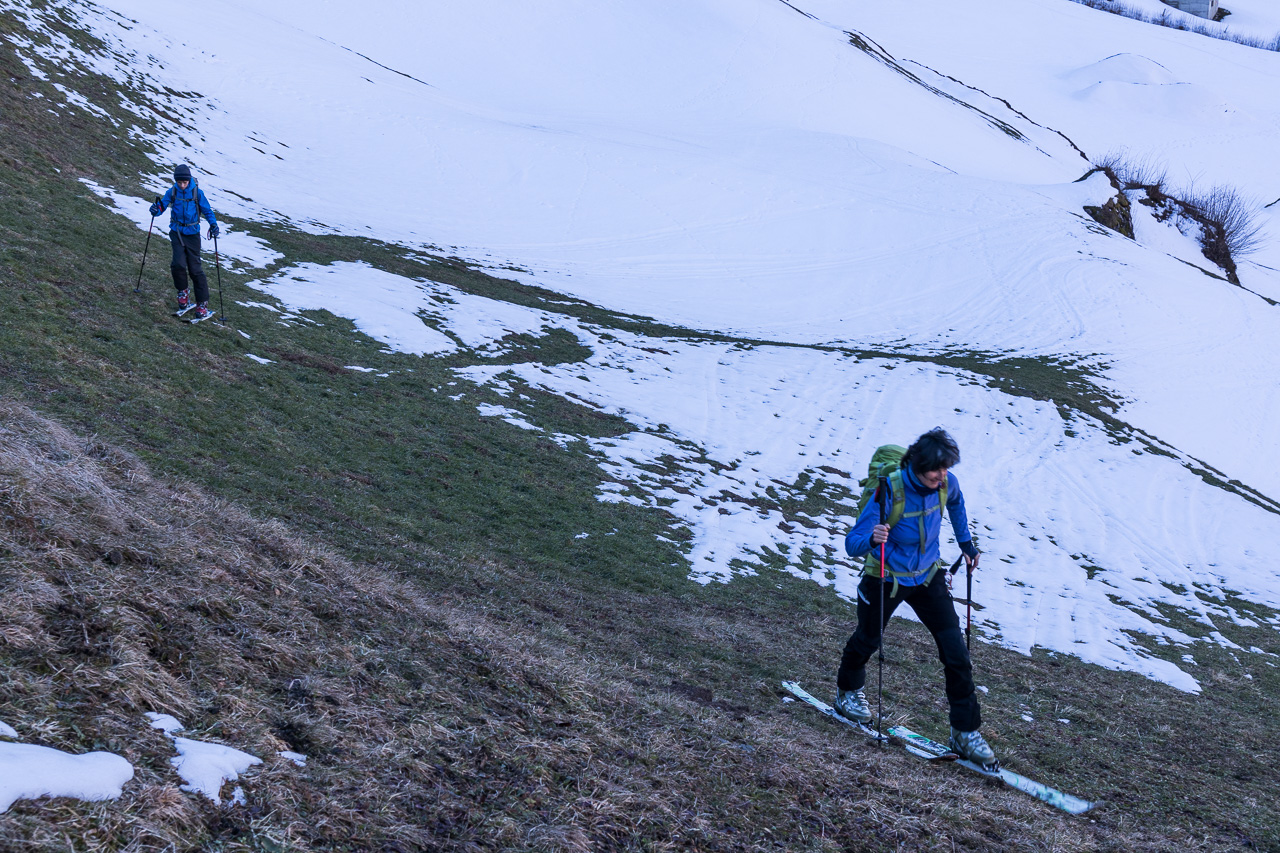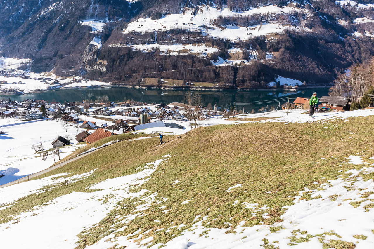 Während der Tourenvorbereitung prüfte ich eine Webcam in Lungern, um zu schauen, ob es überhaupt noch Schnee hat dort. Die Cam zeigte: Alles weiss. Vor Ort sieht es nun etwas anders aus, jedenfalls dort, wo wir hoch wollen, sind grüne Wiesen, versetzt mit weissen Flecken. Wir starten trotzdem, in der Hoffnung, dass dieser Schneemangel nur zuunterst ist. So ist es denn auch, bald ist die Schneedecke durchgehend, wir gewinnen schnell an Höhe. Wir sind gespannt, wie der Schnee in der Abfahrt sein wird. Jetzt jedenfalls ist er hart gefroren, aber ohne Harscheisen begehbar. Im Wald folgt die Route dem Sommerbergweg, das bedeutet, er ist ziemlich steil, aber ziemlich gut begehbar. Wir blicken auf die andere Talseite, lokalisieren die Rückenegg, wo wir geniale Verhältnisse hatten vor zwei Jahren. Daneben ist Lungern-Schönbühl, das ehemalige Skigebiet, das jetzt offen ist für Winterwanderer, Schneeschuhgänger und Tourenskifahrer. Zwischenziel der meisten ist das Restaurant, das einst mitten im Skigebiet stand, heute weit weg von der nächsten Bahn, aber offenbar trotzdem erfolgreich ist.