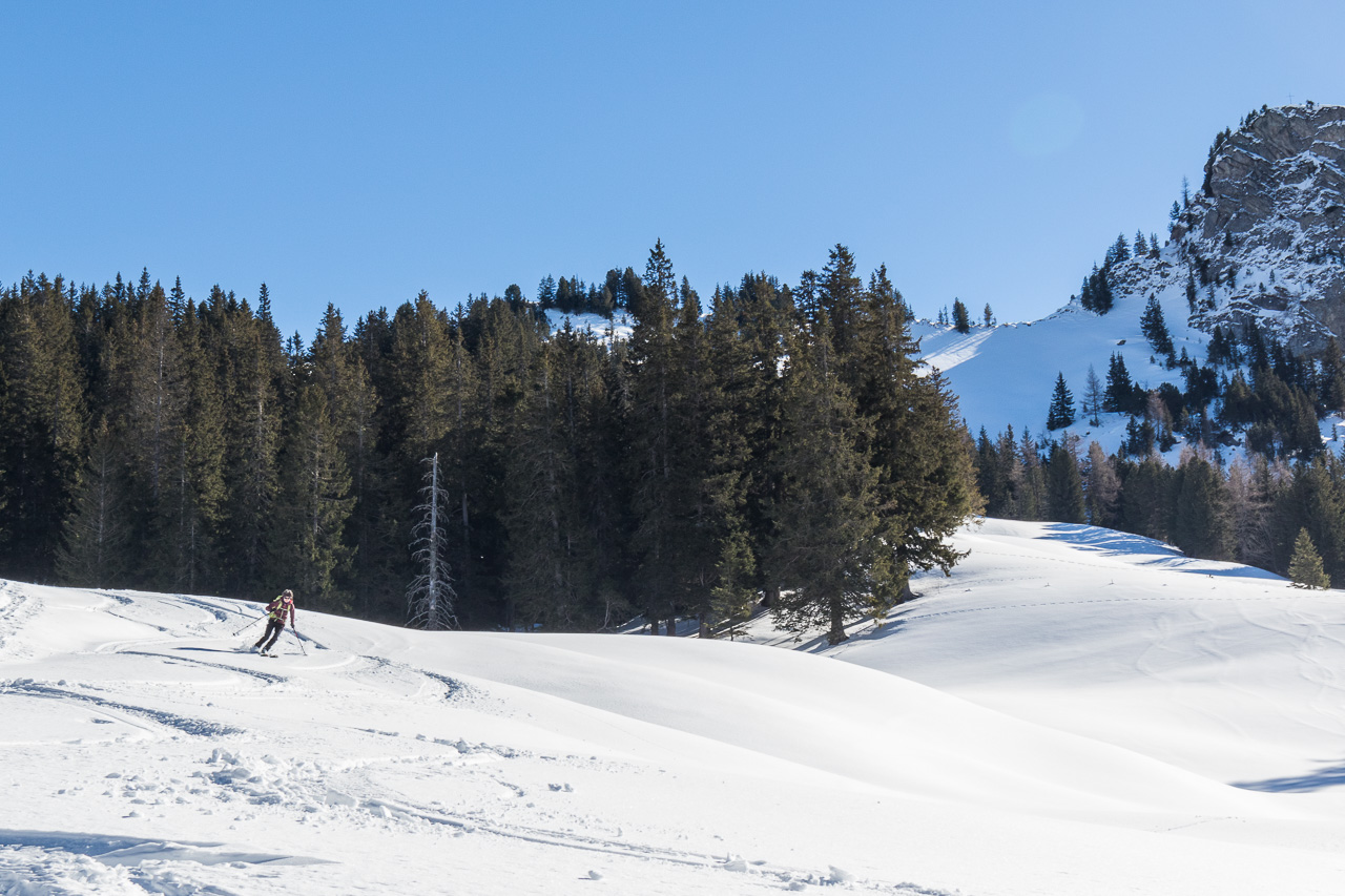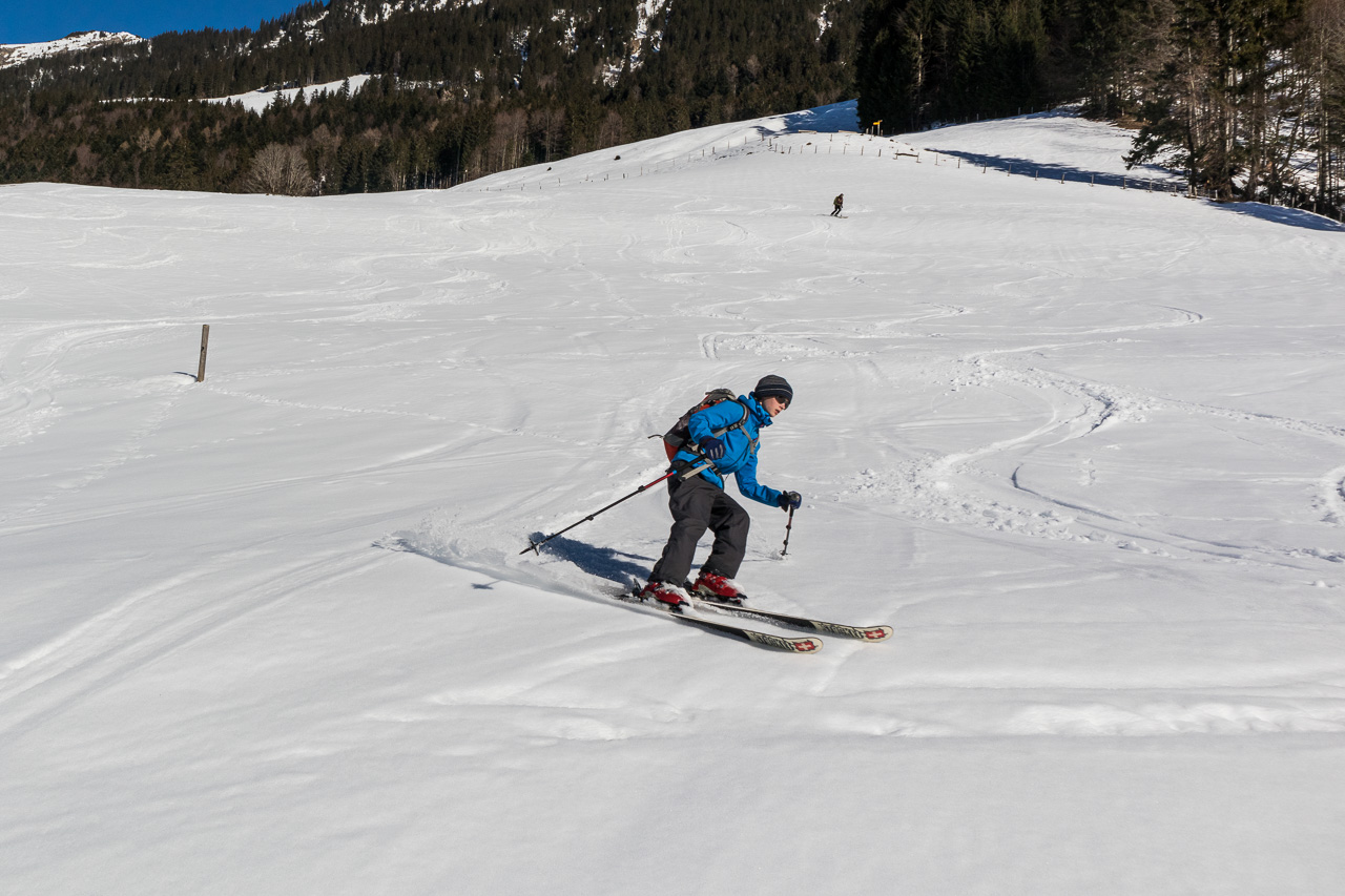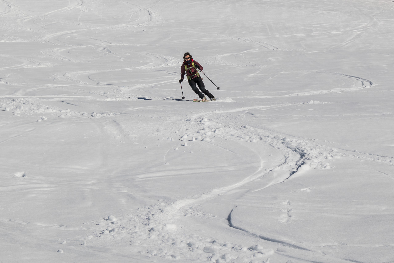 Also hoffentlich nicht so wie beim Start: Deckelschnee, auch bekannt als Bruchharst oder Carton de Blamage, fördert die Fahrfreude nicht. In grossen Bögen versuchen wir, möglichst sturzfrei Höhenmeter zu vernichten. Dann kommt aber ein etwas anders exponierter Hang, schon kurven wir durch feinen Pulverschnee. Dieser geht dann nahtlos über in Sulzschnee, leicht angeschmolzen, so wie er sein muss. Nur endet der ganze Fahrspass dann wieder im Bruchharst. Dann folgt eine Waldpassage, wie sie halt vorkommen kann auf Skitouren: Eng, kein Platz zum Bremsen. Also wird gerutscht, dort, wo es geht, und sonst dienen halt Bäumchen als Notbremse. Bald sind wir aber wieder im offenen Gelände. Der Schnee ist weiterhin abwechslungsreich.