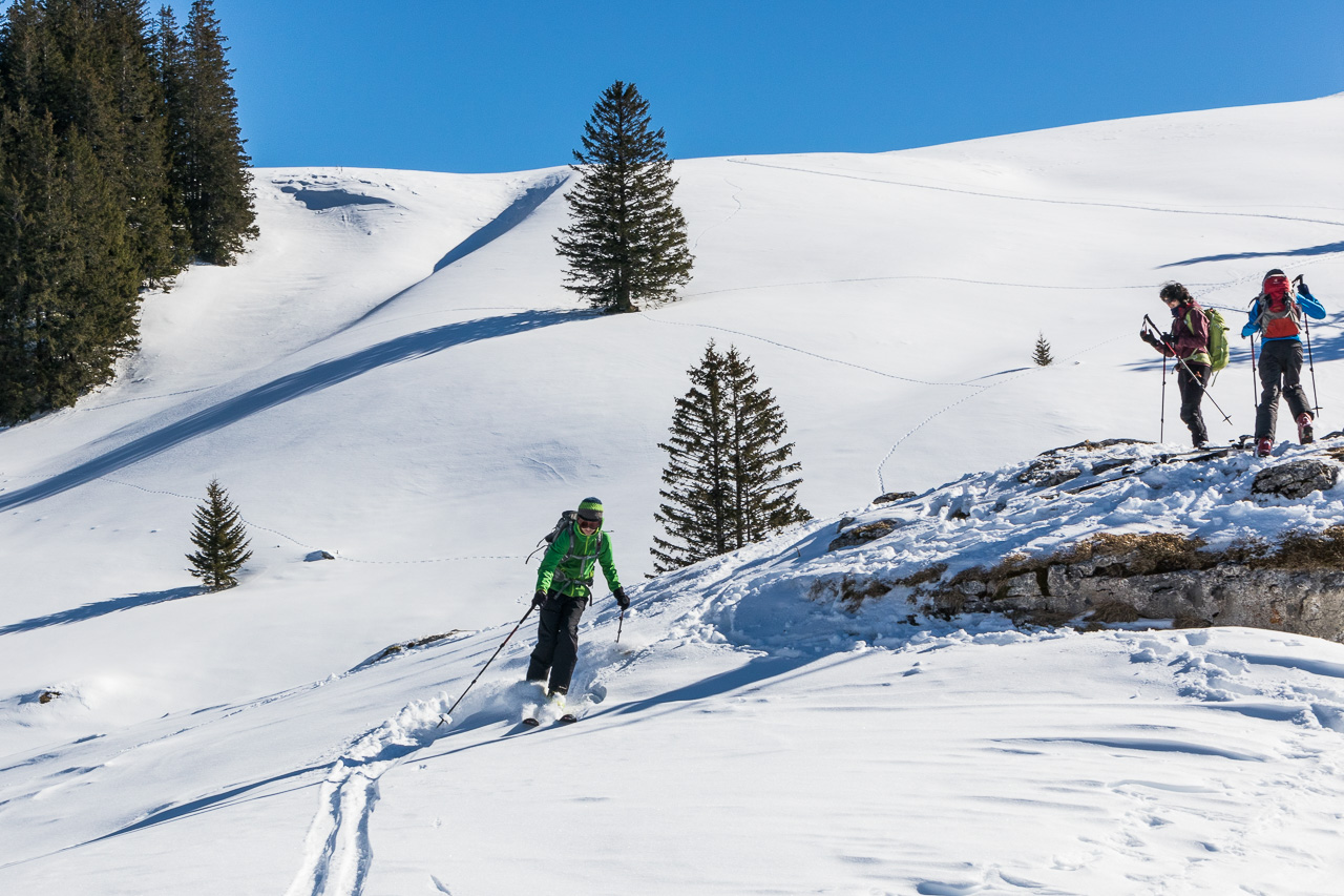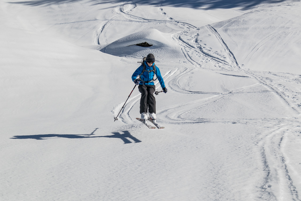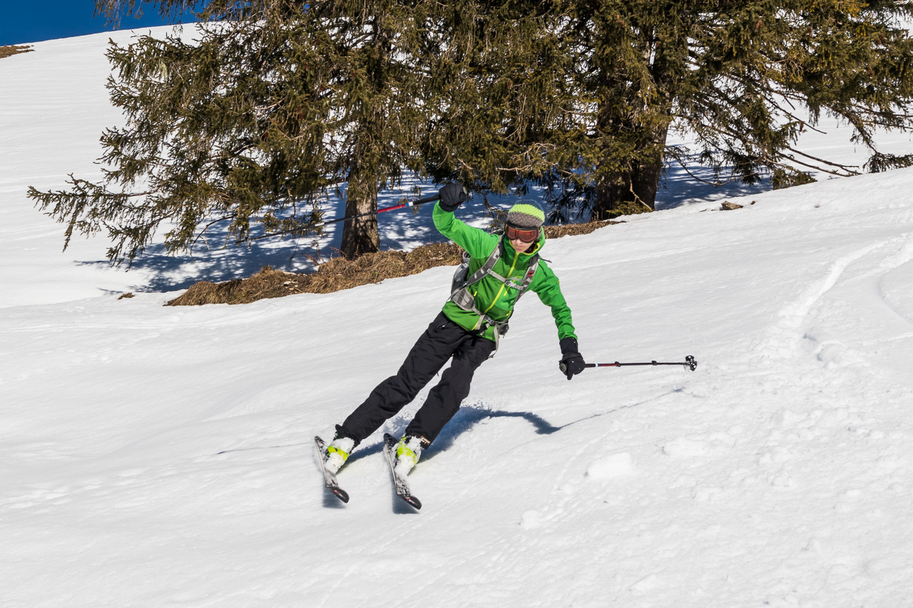 Also hoffentlich nicht so wie beim Start: Deckelschnee, auch bekannt als Bruchharst oder Carton de Blamage, fördert die Fahrfreude nicht. In grossen Bögen versuchen wir, möglichst sturzfrei Höhenmeter zu vernichten. Dann kommt aber ein etwas anders exponierter Hang, schon kurven wir durch feinen Pulverschnee. Dieser geht dann nahtlos über in Sulzschnee, leicht angeschmolzen, so wie er sein muss. Nur endet der ganze Fahrspass dann wieder im Bruchharst. Dann folgt eine Waldpassage, wie sie halt vorkommen kann auf Skitouren: Eng, kein Platz zum Bremsen. Also wird gerutscht, dort, wo es geht, und sonst dienen halt Bäumchen als Notbremse. Bald sind wir aber wieder im offenen Gelände. Der Schnee ist weiterhin abwechslungsreich.