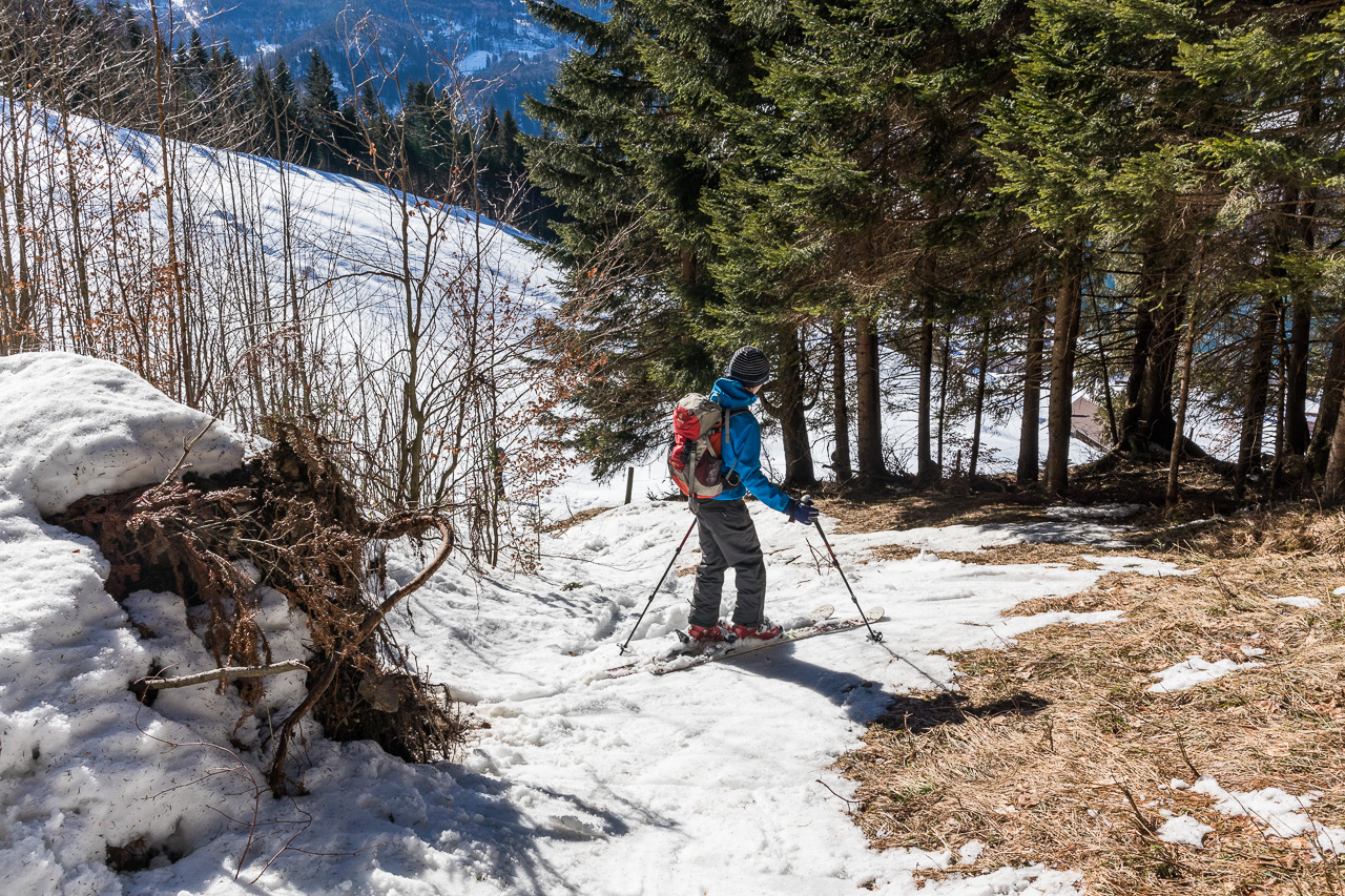 Nun erreichen wir den Punkt, der uns zur Abfahrt weiter verweist, siehe Bild 4. Das ist eine Strasse, schon vorgespurt. Zwei Kurven fahren wir, bevor wir wieder in den Wald stechen, um die freien Hänge zu erreichen. Das ist etwas tricky, denn je weiter wir nach unten kommen, desto mehr wird der Schnee zur Mangelware. Aber wir erreichen die letzten Hänge. Wie wohl die zu fahren sind? Gut! Nein, super! Hier finden wir definitiv Frühlingsverhältnisse vor, feiner Sulzschnee. Wir geniessen die Abfahrt nochmals, bevor wir zu den Stellen gelangen, wo bereits am Morgen kein Schnee mehr lag, tappen und rutschen darüber hinweg, fahren wieder bis zur nächsten Grasnarbe. Die letzten paar Meter zum Bahnhof können wir noch fahren, dann ist endgültig fertig. Nächster Halt: Restaurant Bahnhöfli. Und nach dieser tollen Abfahrt ist auch Silvan wieder versöhnt mit der Welt.
