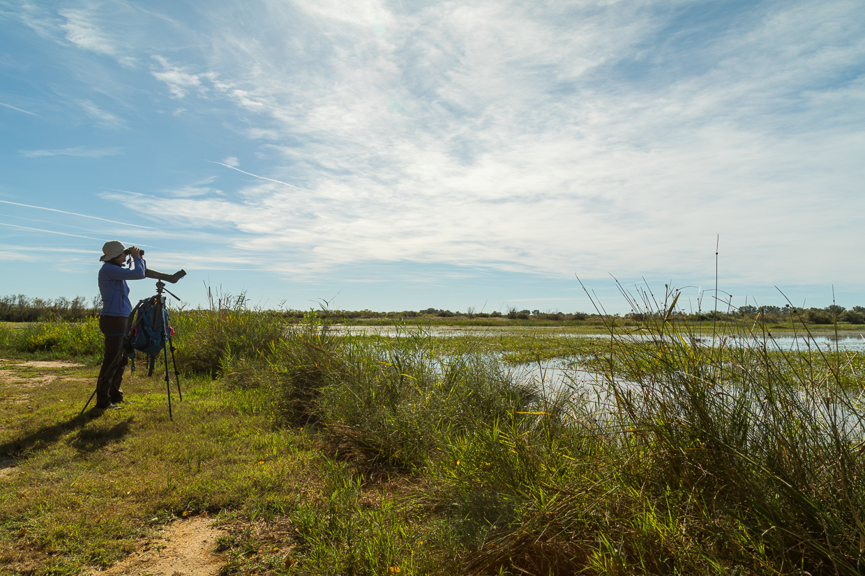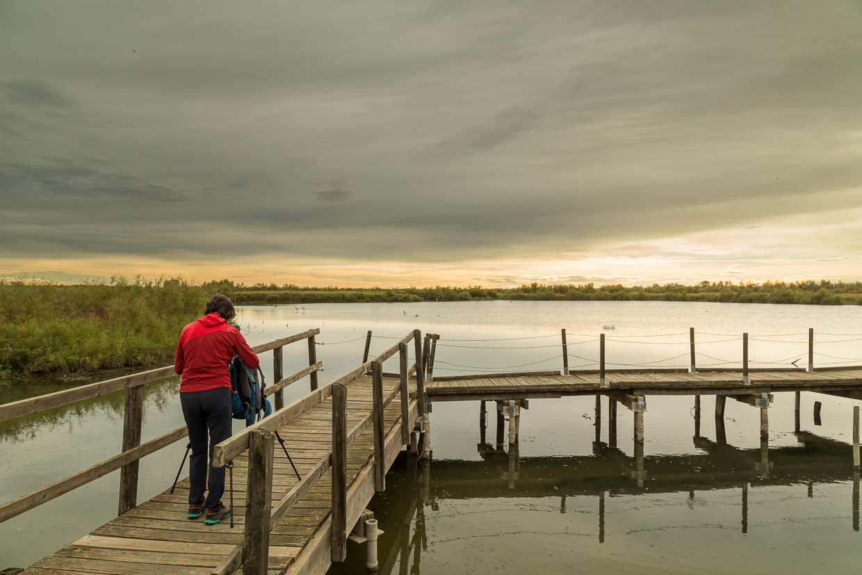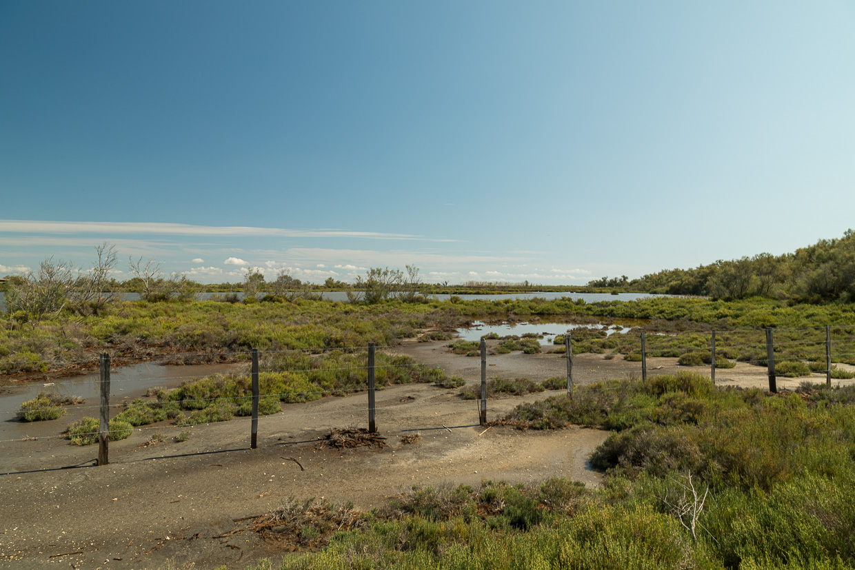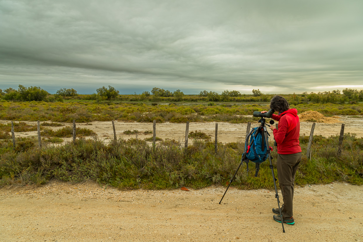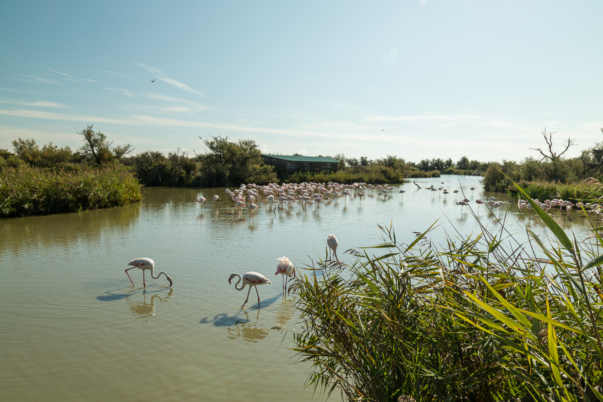 Beim Gebiet handelt es sich dabei um die Uferzone am Étang de Monro. Es gibt keine ausgeschilderten Wege, man geht dort, wo es möglich ist. Nur in der Brutzeit ist das Betreten verboten, Schilder weisen darauf hin. Man kann bis zur Wasserlinie gehen, je nach Zustand des Bodens. Manchmal ist es auch so schmierig und sumpfig, dass man nicht bis dorthin kommt. Die Vögel versammeln sich gestaffelt, je nach Beinlänge: Im Schlick suchen die kleinen Limikolen wie Sandregenpfeifer, Alpenstrandläufer, Seeregenpfeifer und Zwergstrandläufer nach Nahrung, die Möwen stehen im Wasser, danach folgen die Säbelschnäbler und weit draussen seihen die Flamingos das Wasser.
