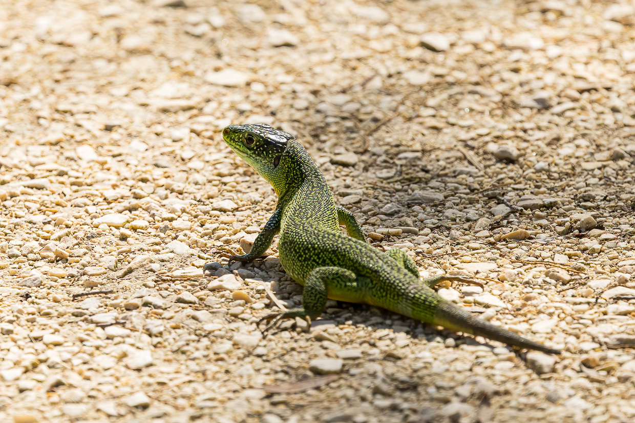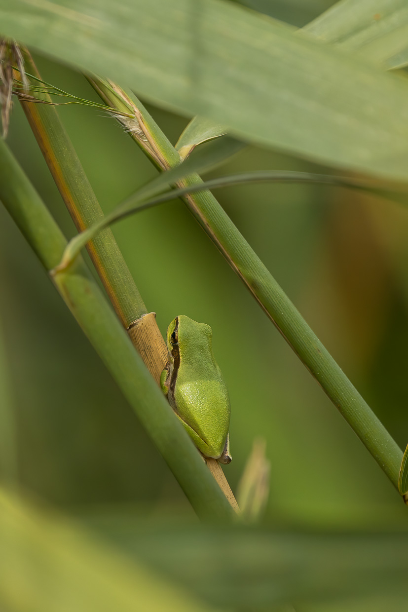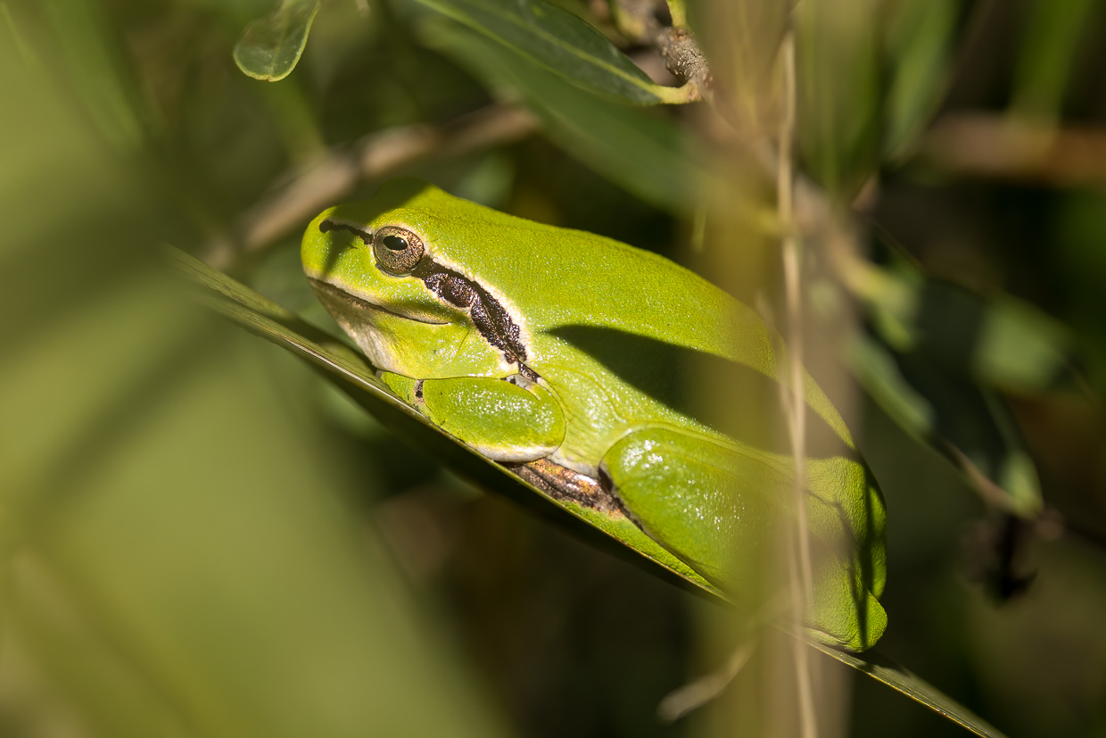 Der zweite Teil führte uns zum Restaurant Le Mazet du Vaccarès, das allerdings geschlossen war wegen Umbauarbeiten. Das interessierte uns aber nicht, denn wir waren ja wegen der Natur hier. Gleich am Strassenrand, auf Brombeerranken und Schilf, fanden wir zahlreiche Mittelmeer-Laubfrösche, zum Teil nicht mal daumennagelgross.