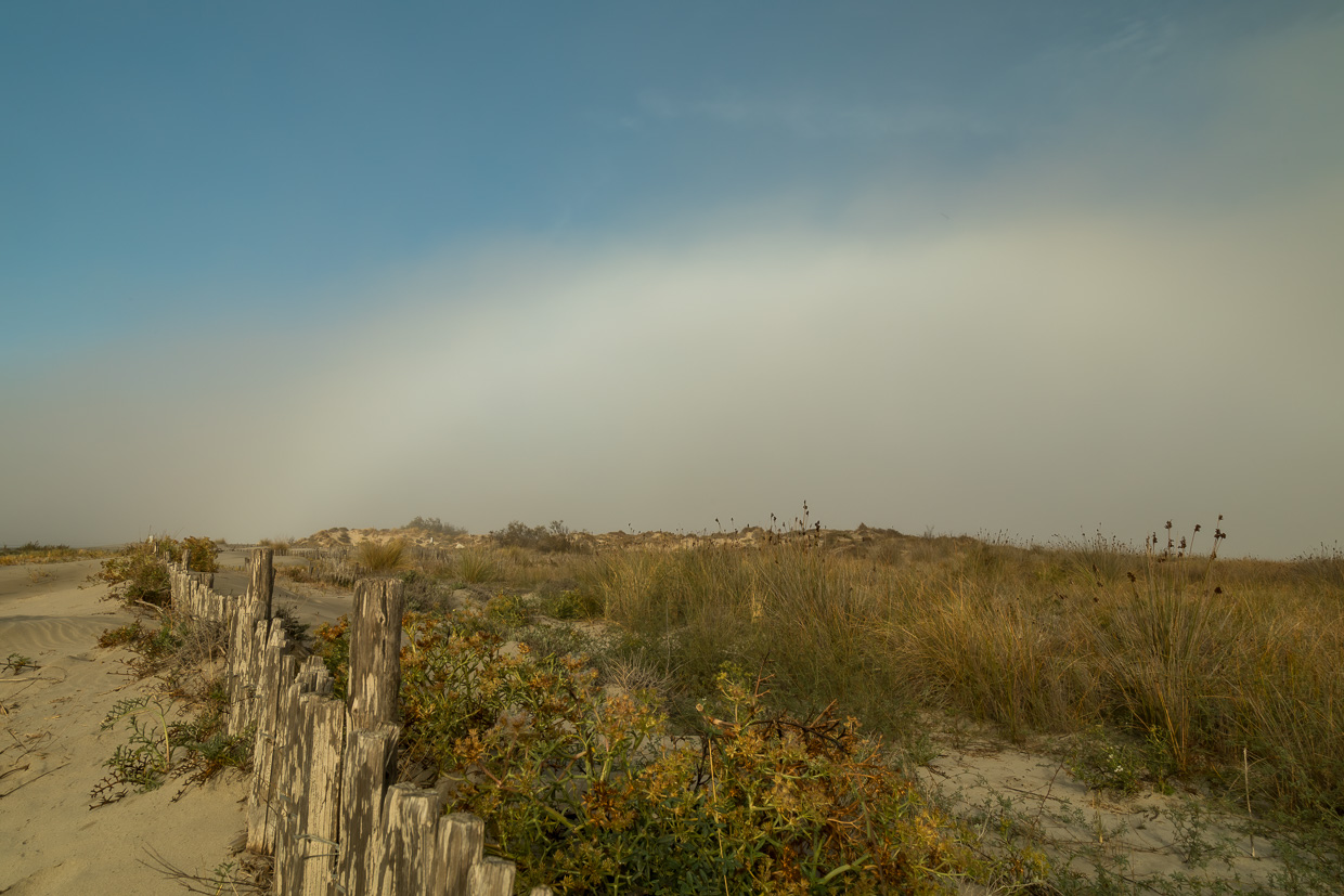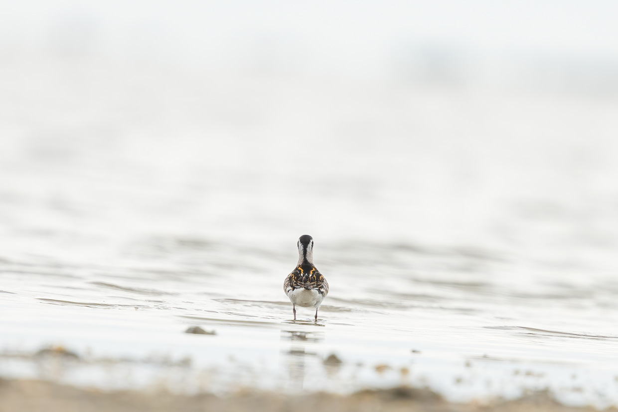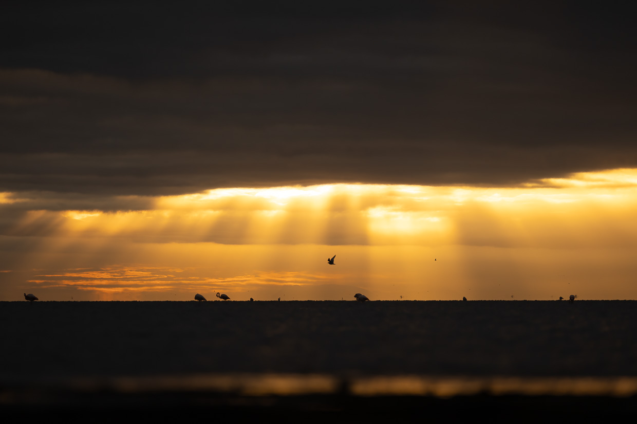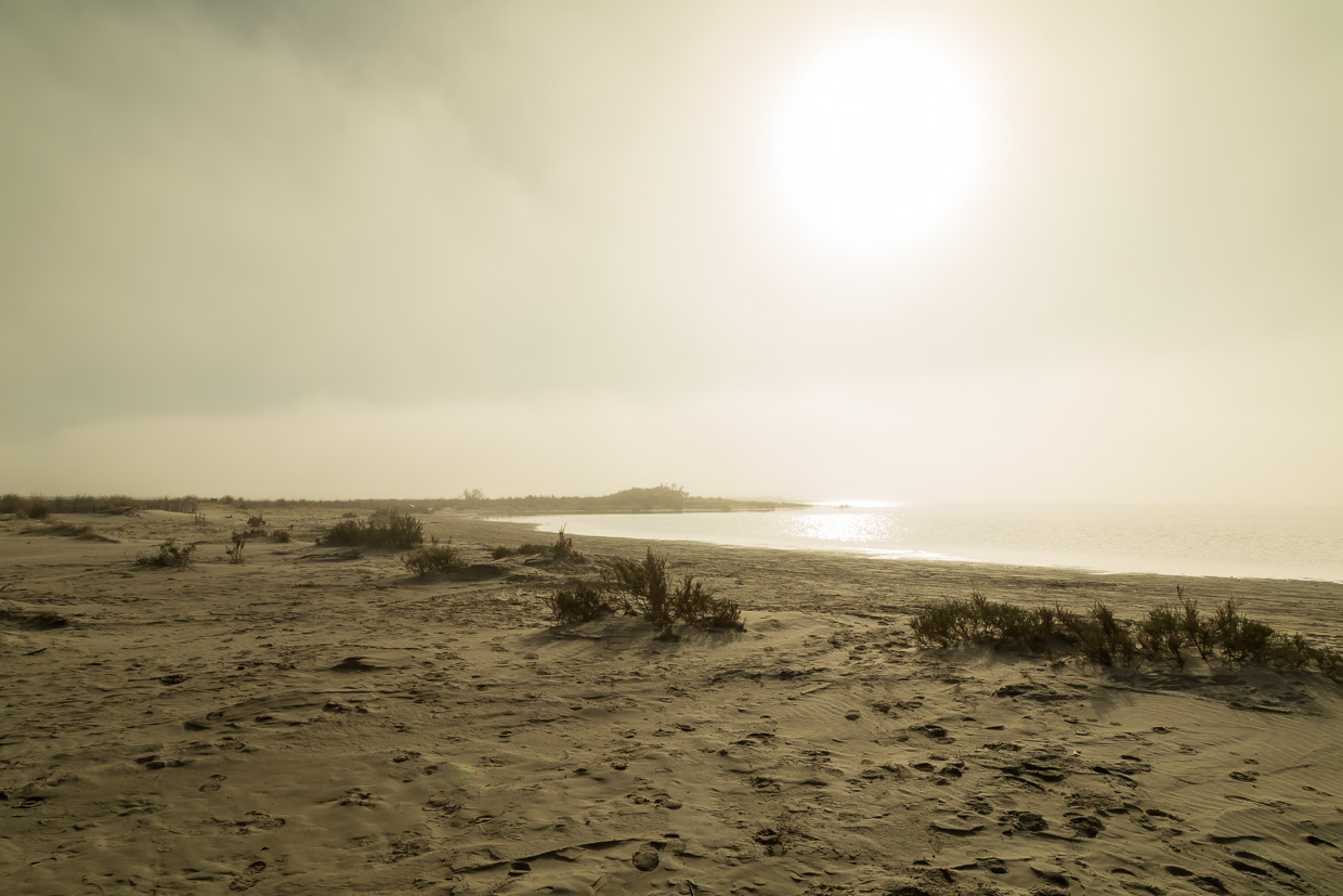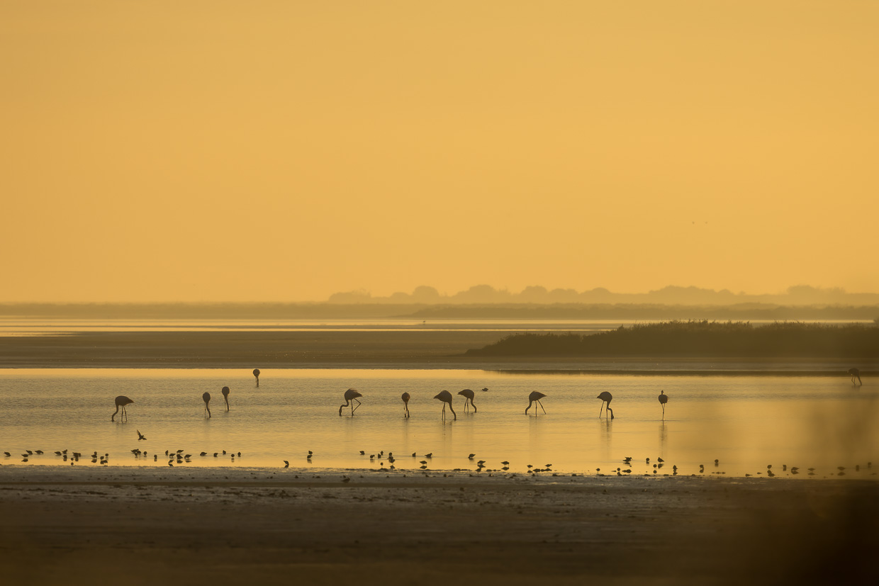 Wir hielten immer wieder an, um den Alpenstrandläufern, Sandregenpfeifern und Flamingos zuzuschauen. Ein Abstecher führte zu einem Sandstrand, der um diese Zeit noch menschenleer war. Mit dem Nebel ergab das eine wunderschöne Stimmung.