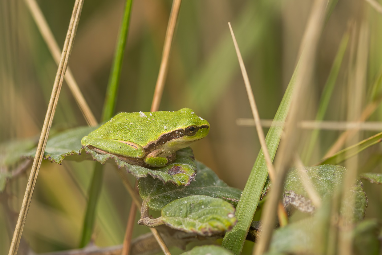 Wir pirschten weiter auf den Wegen rund um die Étang. Aus dem nächsten Hide erblickten wir nebst anderen Limikolen drei Stelzenläufer, diese Vögel mit den unglaublich langen, dünnen Beinen. In den Brombeeren entdeckte ich Laubfrösche, sie scheinen sich da sicher zu fühlen.