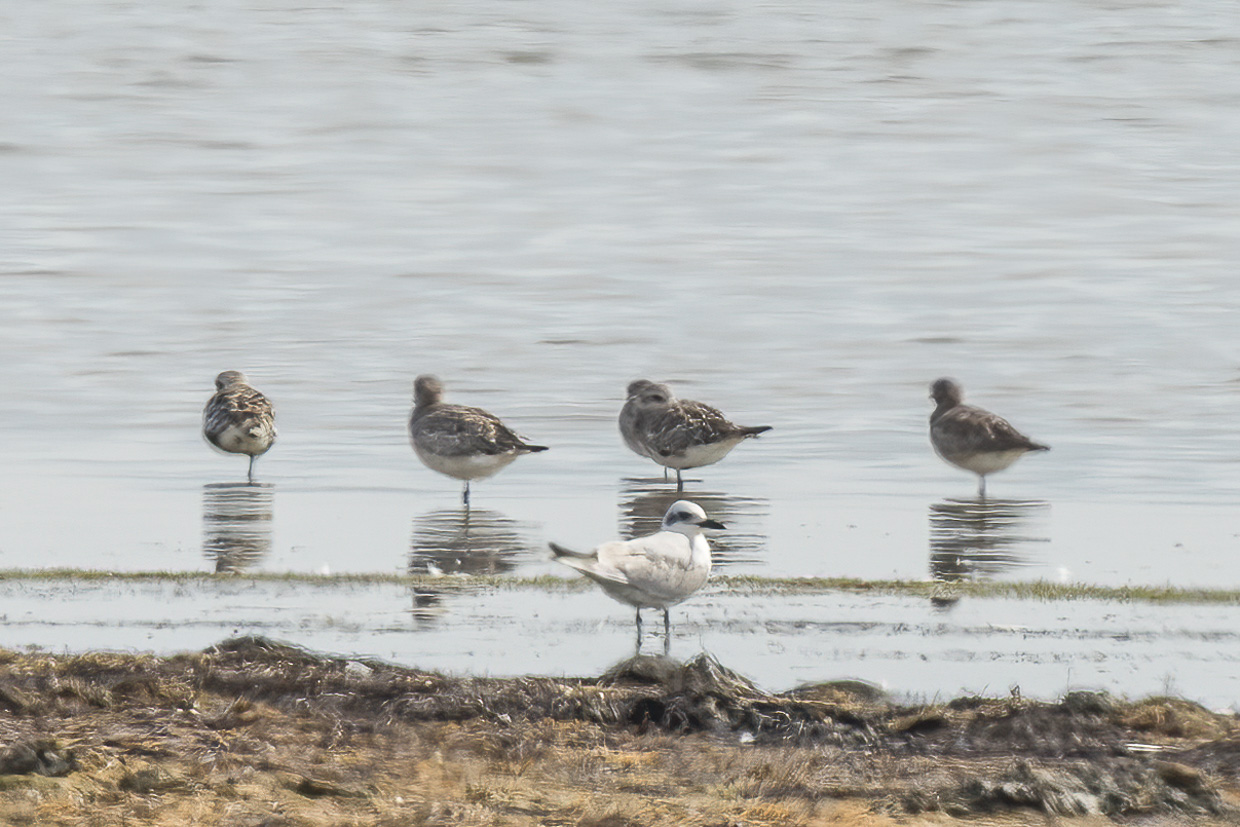 Wir durchwanderten auf der unbefestigten Strasse diese wunderbare Landschaft. In einer Gruppe Kiebitzregenpfeifer fiel uns eine Möwe auf, die wir nicht bestimmen konnten. Auch zurück im Häuschen half das Möwenbuch nicht weiter. Wir fragten im Chat unseres Feldornithologiekurses, ob jemand wisse, was für eine Möwe das sein könnte. Prompt kam die Antwort: Keine Möwe, sondern eine Lachseeschwalbe. Tatsächlich, das passte.