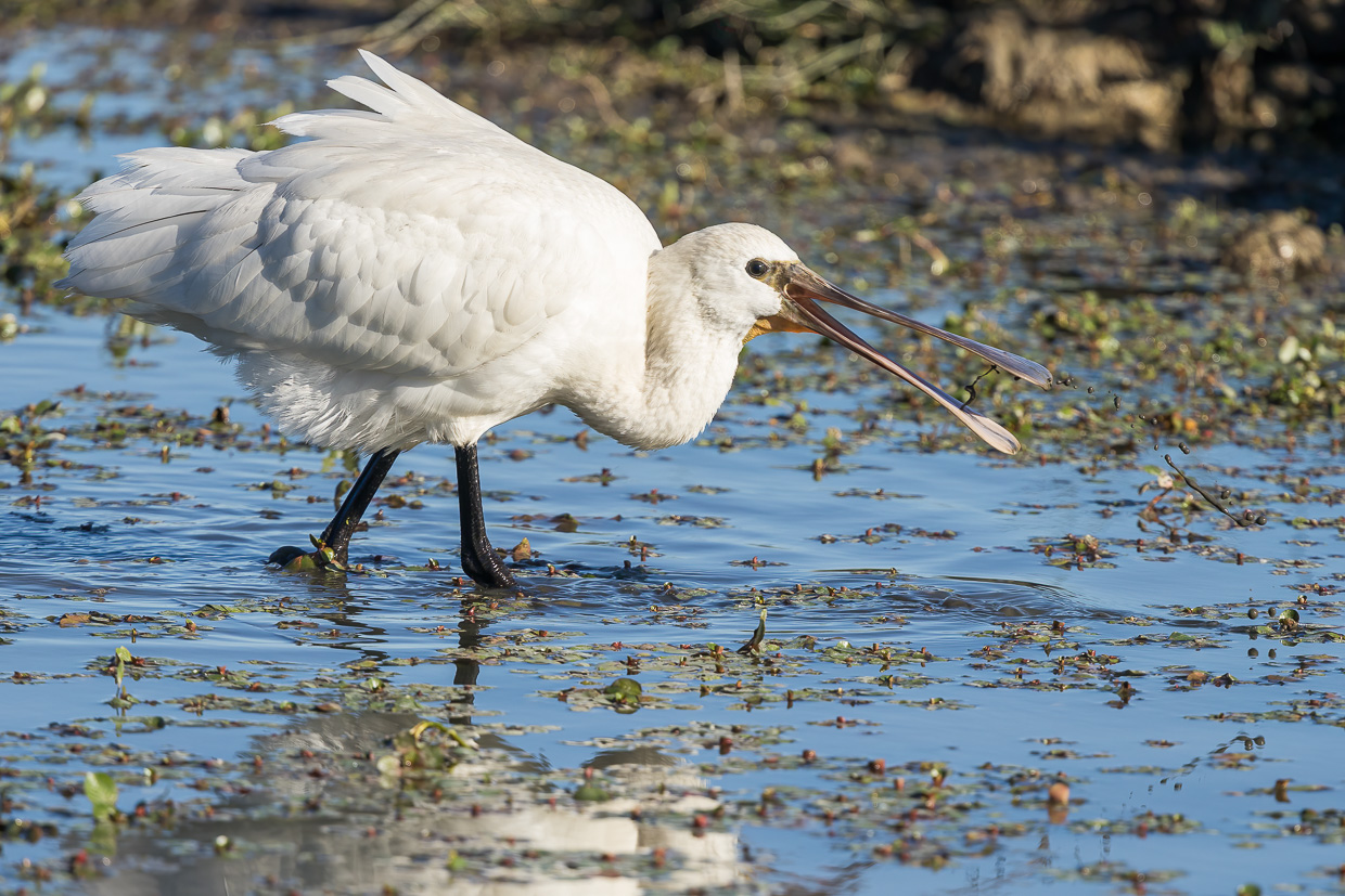 Gleich am Start sahen wir zwei Heilige Ibisse, Neozoen, die sich allmählich breit machen. Da sie Nester von Seevögeln plündern, werden sie dezimiert. Im Gebüsch hören wir immer wieder Seidensänger. Es gibt verschiedene Hides und Sichtschutzwände, die ein getarntes Beobachten ermöglichen. Von der ersten Wand aus sahen wir einen Rallenreiher. Keine Erstbeobachtung, aber er war viel näher als im Kaltbrunner Riet, wo wir den ersten sahen. Ein Stück weiter endete der Weg in einem Hide, der einen guten Blick auf den Teich zuliess. Und was für ein Blick! Gleich davor durchpflügte ein Löffler mit seinem Schnabel das Wasser. Auch keine Erstsichtung, aber ebenfalls noch nie so nah.