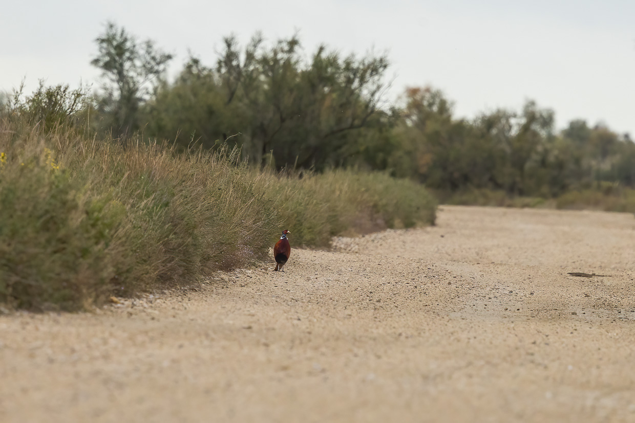 Nach der Stärkung starteten wir. Links und rechts der Strasse befanden sich die Weiden der Stiere und Pferde. Und wo diese sind, sind auch die Kuhreiher nicht weit. Camargue pur. Es gibt viele Hecken und Gebüsche, daraus erschallt immer wieder der Gesang des Seidensängers. Mönchsgrasmücken, die hier überwintern, treten gleich schwarmweise auf. Auf der Strasse entdeckte ich einen grösseren Vogel. Mit dem Blick durchs Fernglas erkannte ich einen Jagdfasan.
