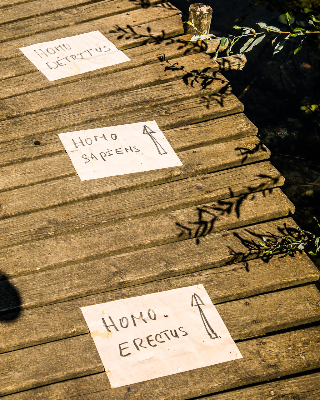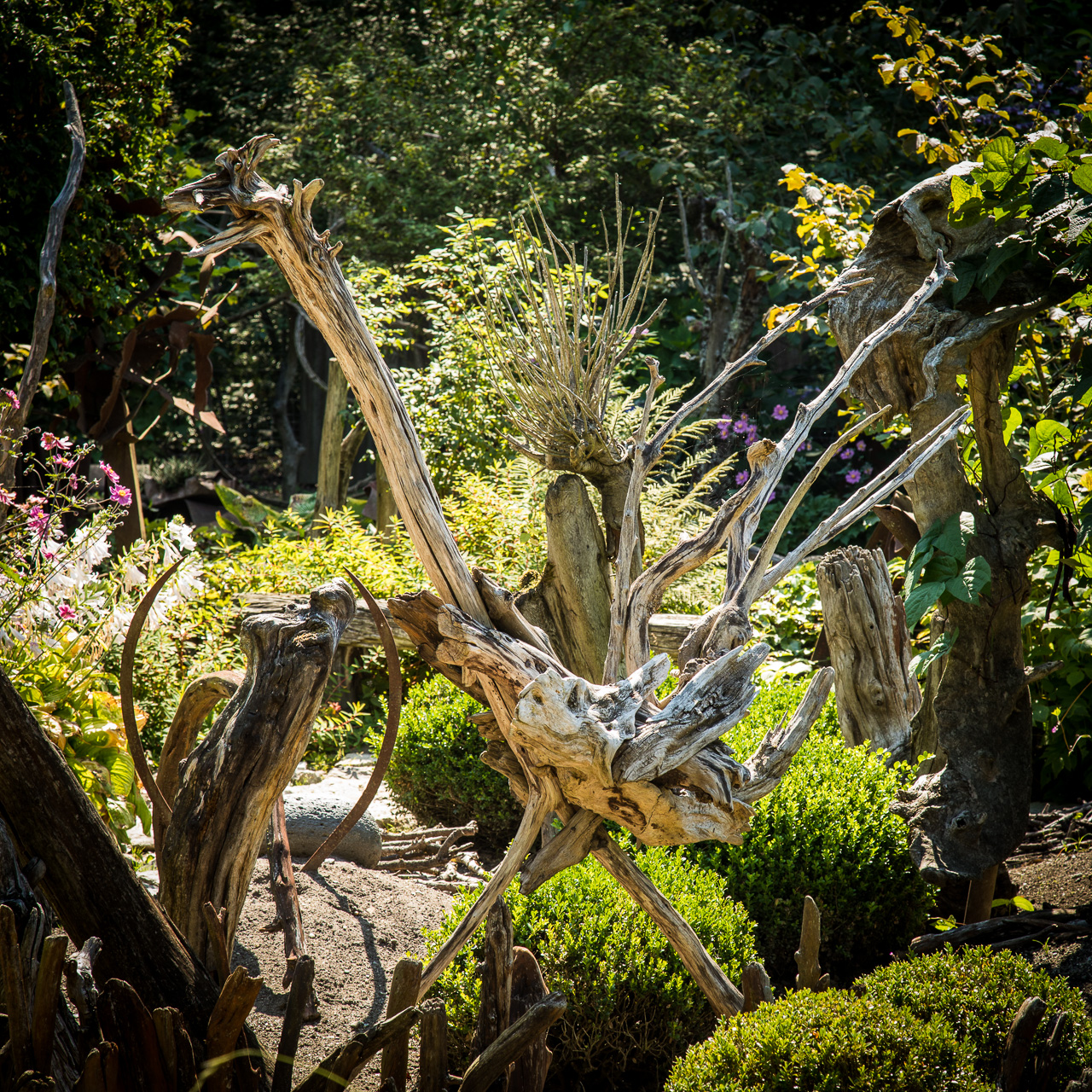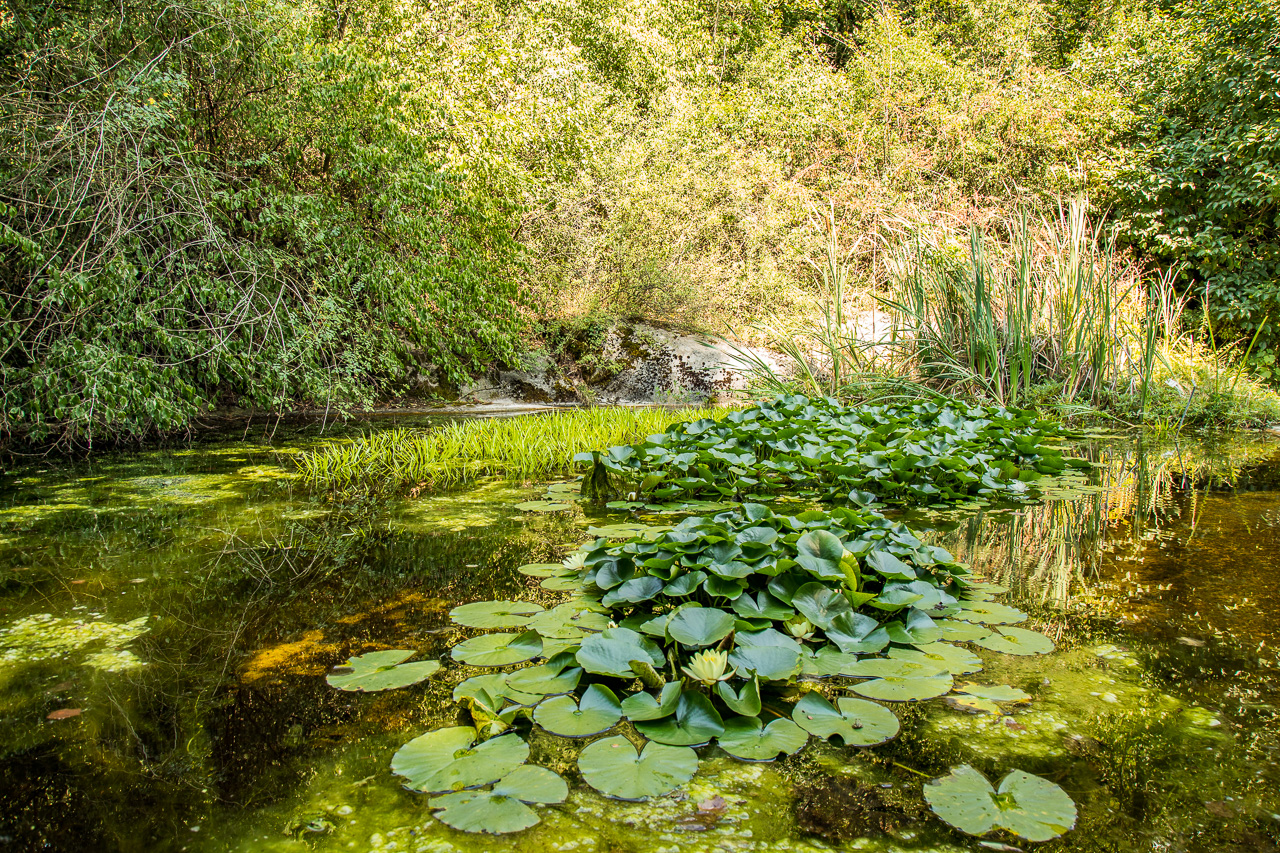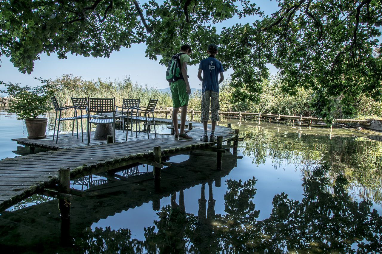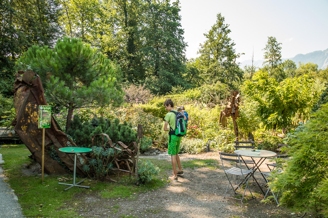 Am ersten Tag erkunden wir die Auen vom Zeltplatz aus Richtung Villeneuve. Mittendrin liegt der „Jardin instinctif“, ein Blumengarten mit Kunstobjekten, die zum Nachdenken anregen. Ein geschwungener Steg führt in den See, darauf eine kleine Plattform mit Stühlen und Tischchen zum Verweilen. Ein Eisvogel zischt vorbei. Nicht zu glauben, dass diese schönen Vögel nur zwei bis drei Jahre alt werden.