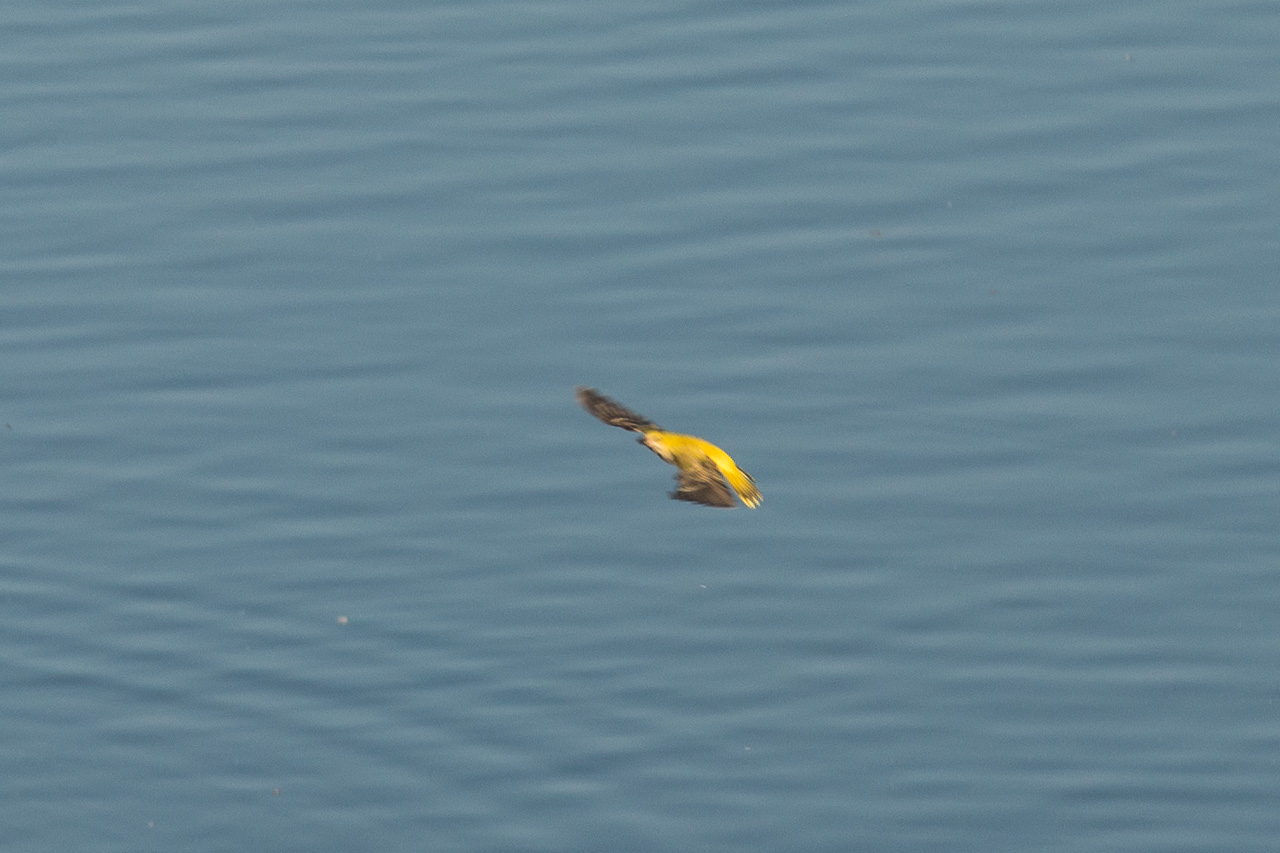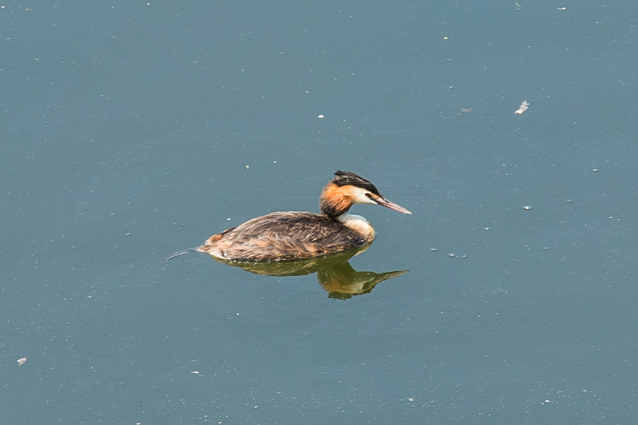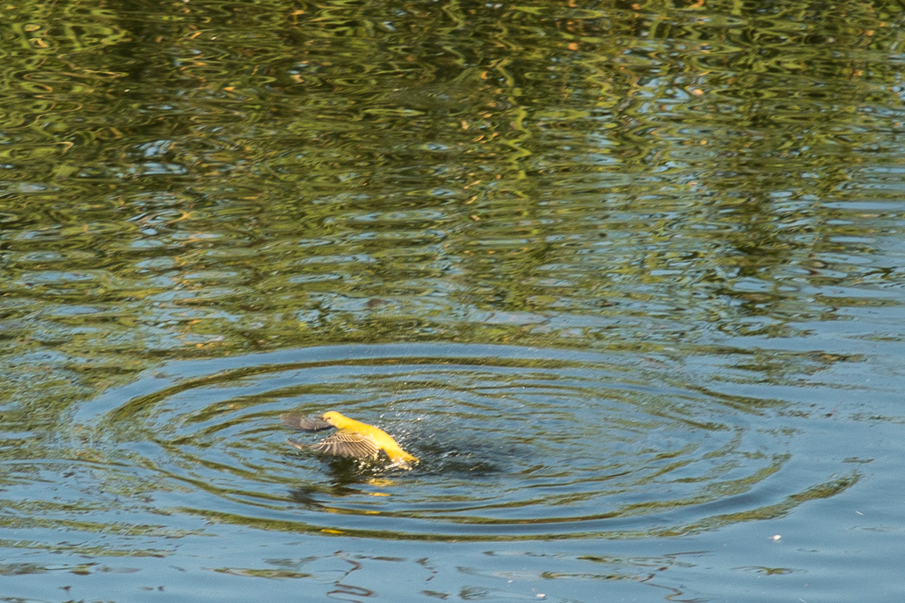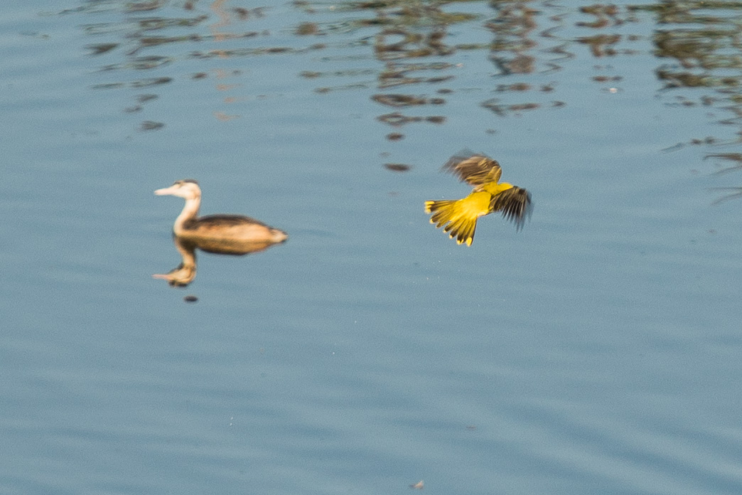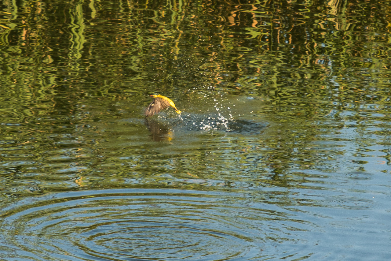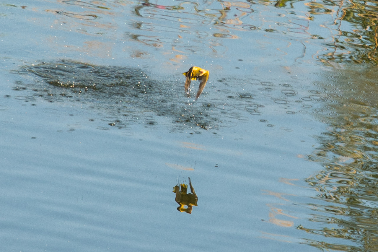 Inzwischen ist die Sonne hinter den Bergen hervor gekommen, wir wechseln zum Turm rüber. Im ersten Moment ist nichts Spannendes zu sehen, halt viele Haubentaucher, Blässhuhner und andere Entenvögel. Bis dann drei amselgrosse Vögel daher kommen: Pirole! Männlein, Weiblein und ein Jungvogel setzen sich im Strauch, fliegen wieder auf, tauchen kurz ins Wasser, fliegen zurück auf den Strauch und putzen sich. Sie machen also gerade ihre Morgentoilette. Wir schauen ihnen zu, bis sie wieder verschwinden.
