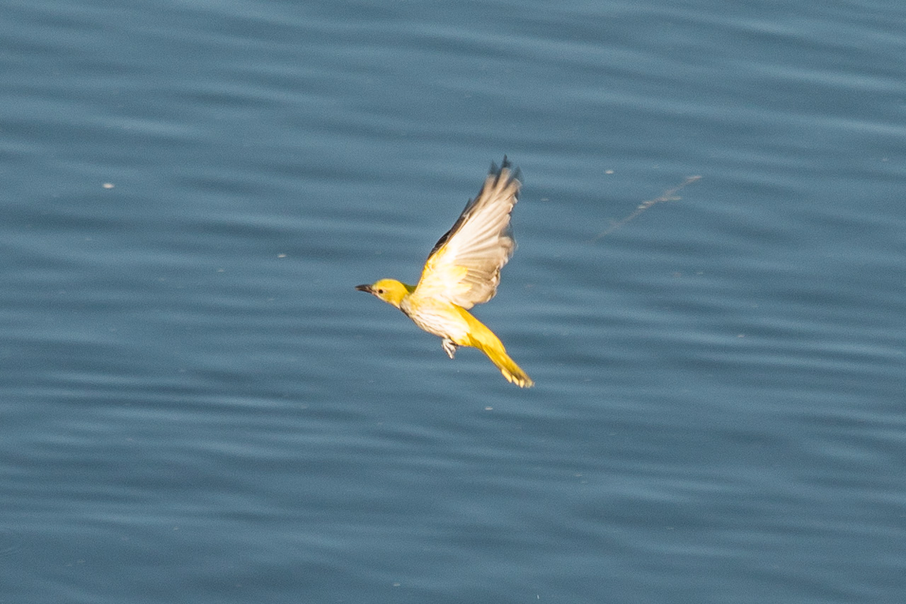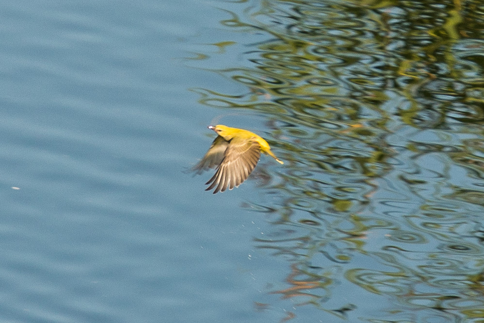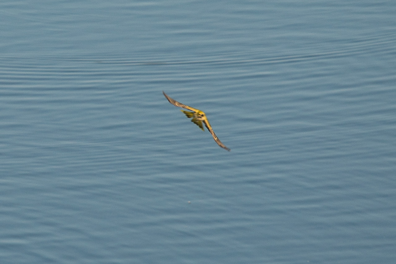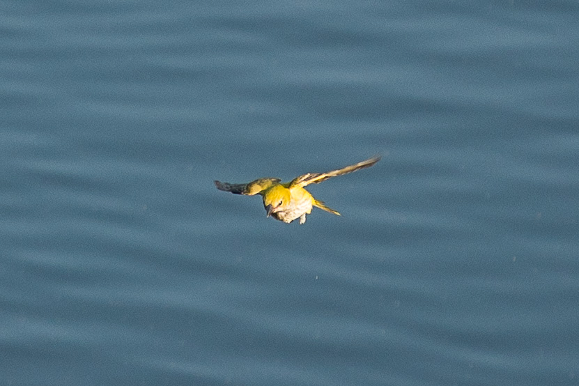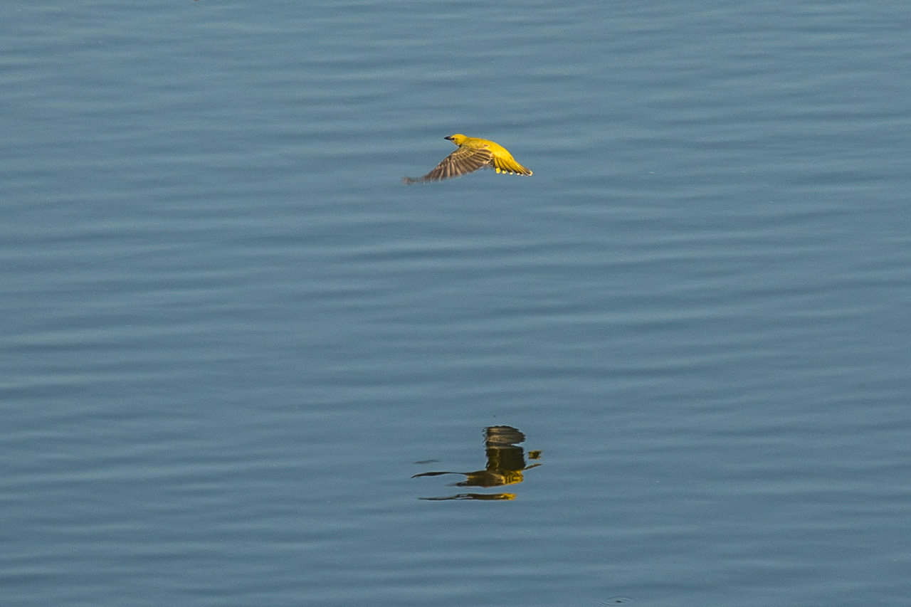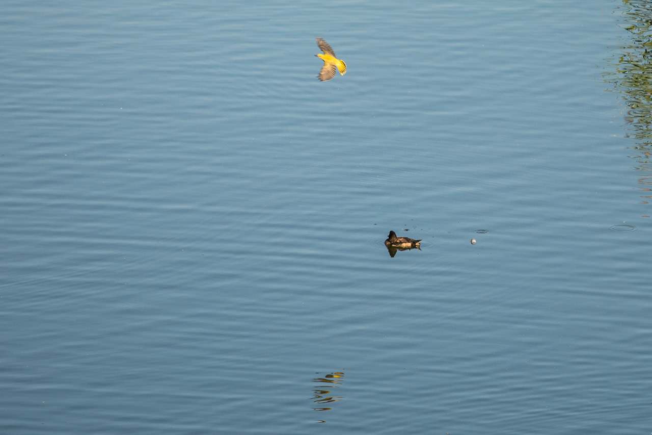 Inzwischen ist die Sonne hinter den Bergen hervor gekommen, wir wechseln zum Turm rüber. Im ersten Moment ist nichts Spannendes zu sehen, halt viele Haubentaucher, Blässhuhner und andere Entenvögel. Bis dann drei amselgrosse Vögel daher kommen: Pirole! Männlein, Weiblein und ein Jungvogel setzen sich im Strauch, fliegen wieder auf, tauchen kurz ins Wasser, fliegen zurück auf den Strauch und putzen sich. Sie machen also gerade ihre Morgentoilette. Wir schauen ihnen zu, bis sie wieder verschwinden.