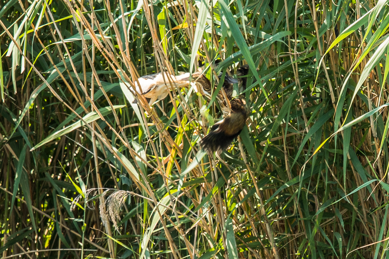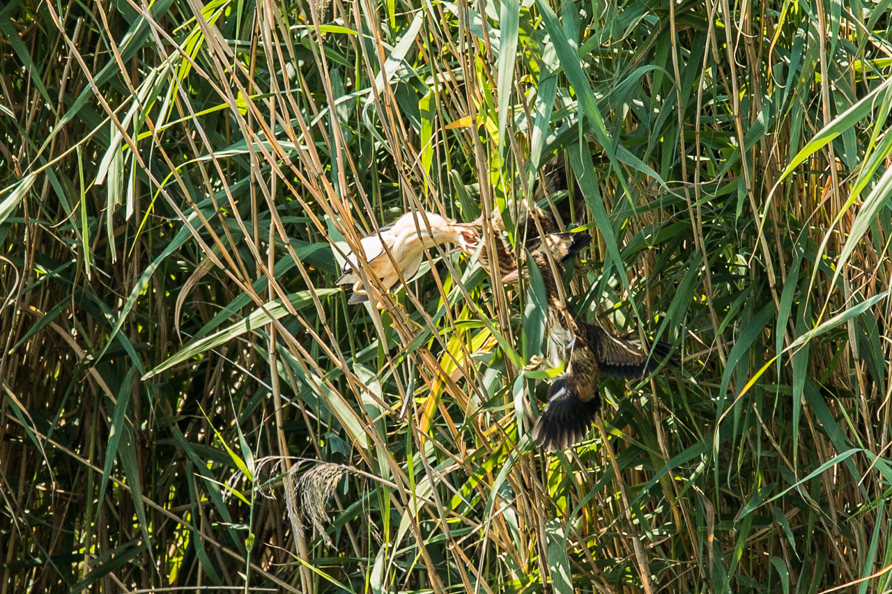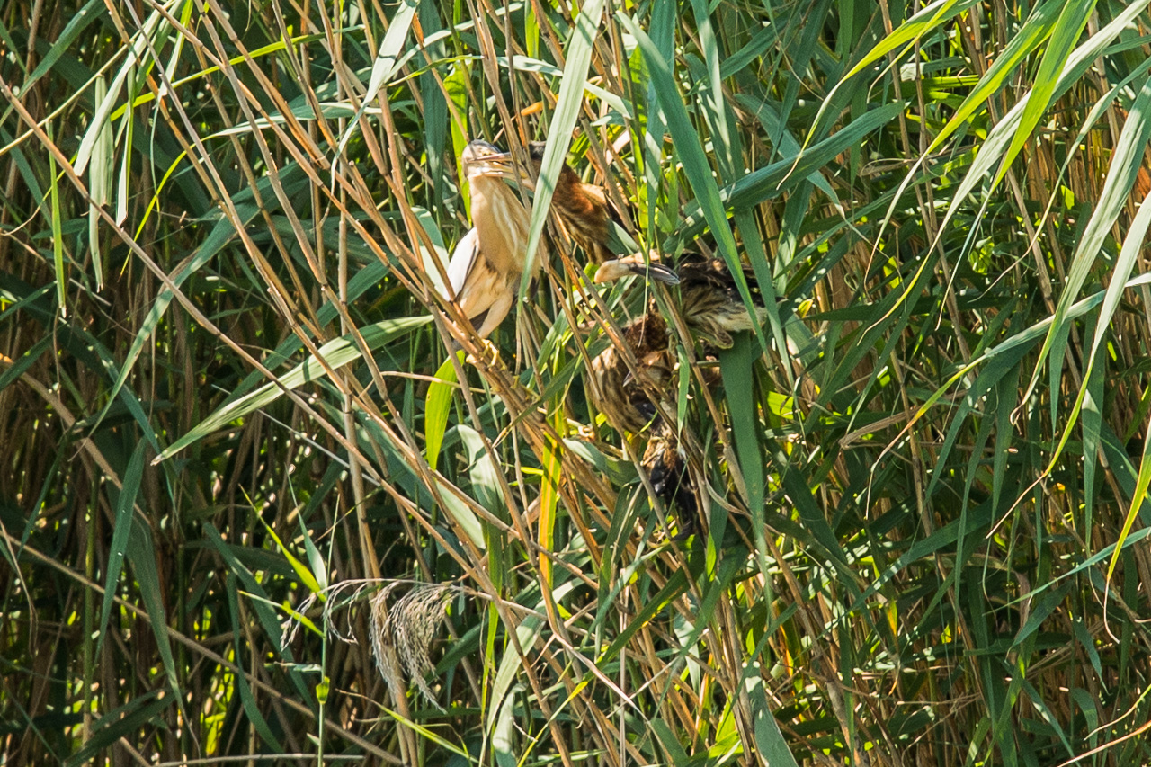Bei der weiter entfernten Beobachtungswand sind wir näher am Schilfgürtel dran. Dort machen wir eine faszinierende Entdeckung: Junge Zwergdommeln! Das ist in der Schweiz sehr selten. Der Altvogel füttert sie, sie sind unersättlich und bedrängen das Elterntier, bis dieser genug hat und davon fliegt.