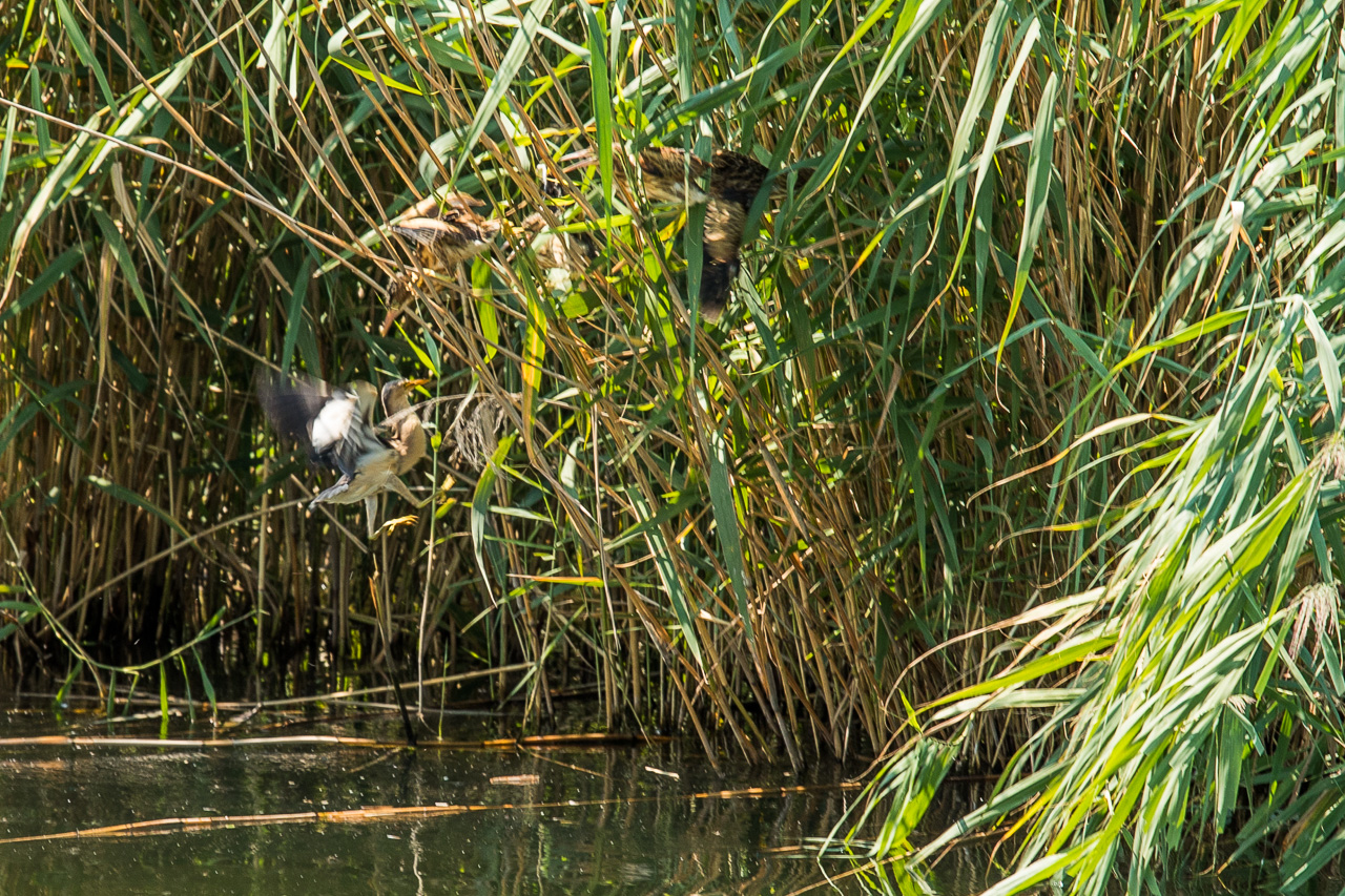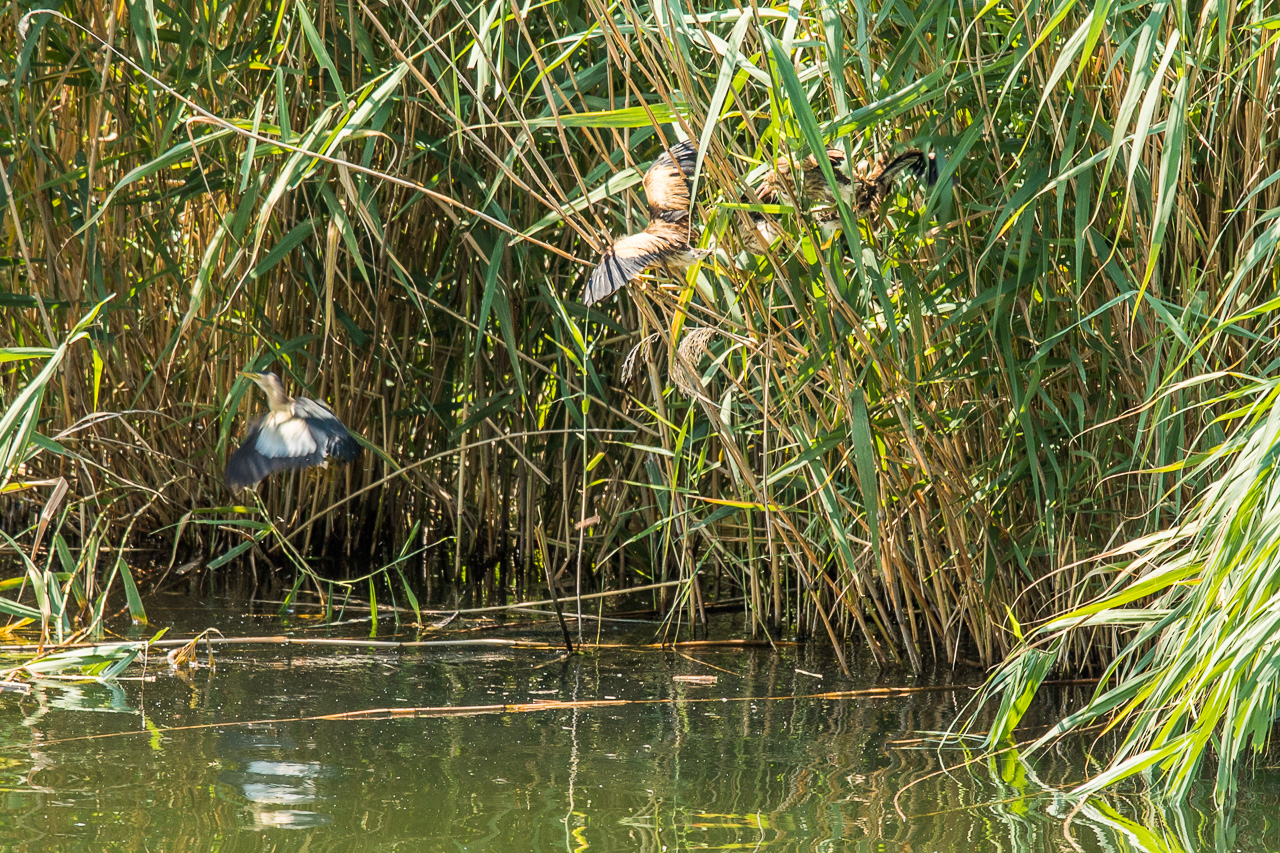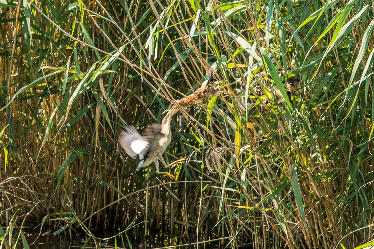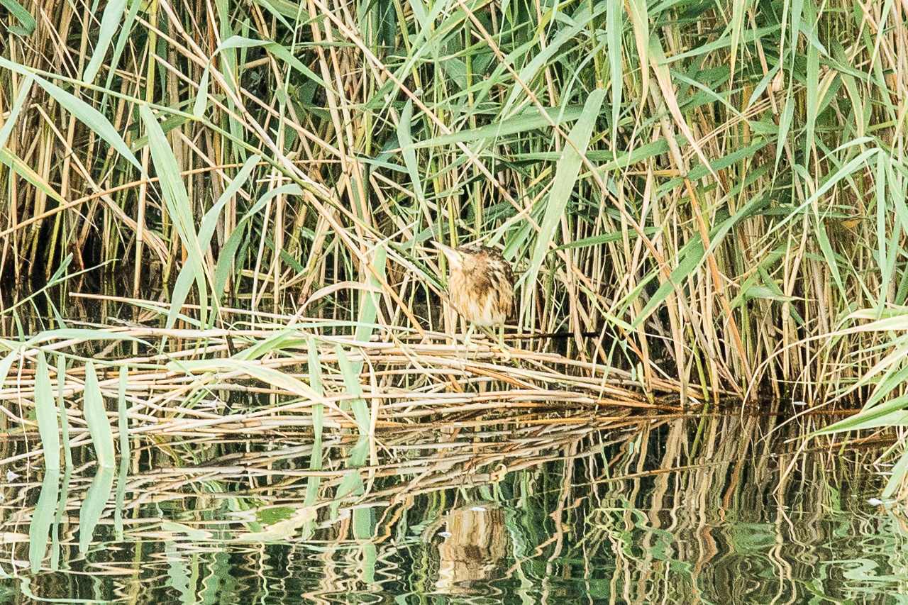 Bei der weiter entfernten Beobachtungswand sind wir näher am Schilfgürtel dran. Dort machen wir eine faszinierende Entdeckung: Junge Zwergdommeln! Das ist in der Schweiz sehr selten. Der Altvogel füttert sie, sie sind unersättlich und bedrängen das Elterntier, bis dieser genug hat und davon fliegt.