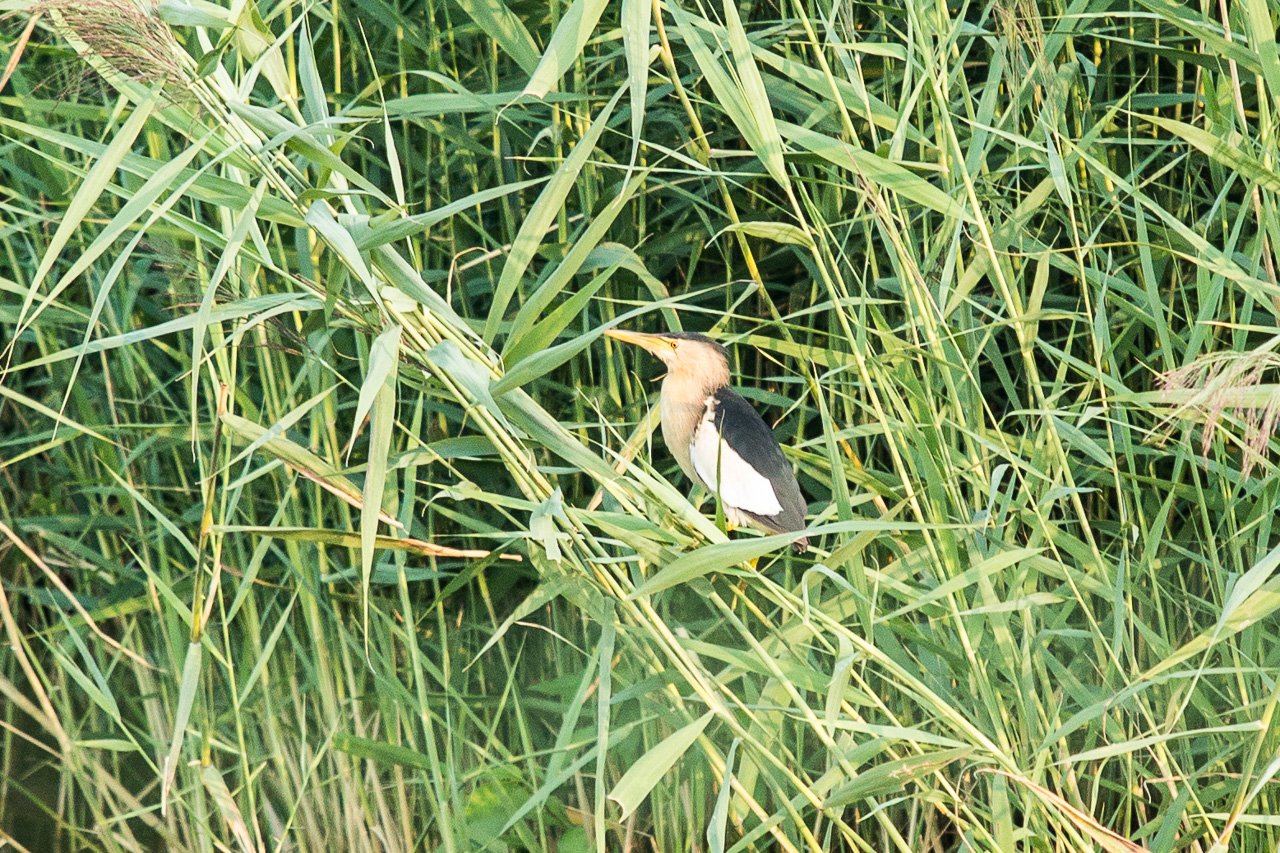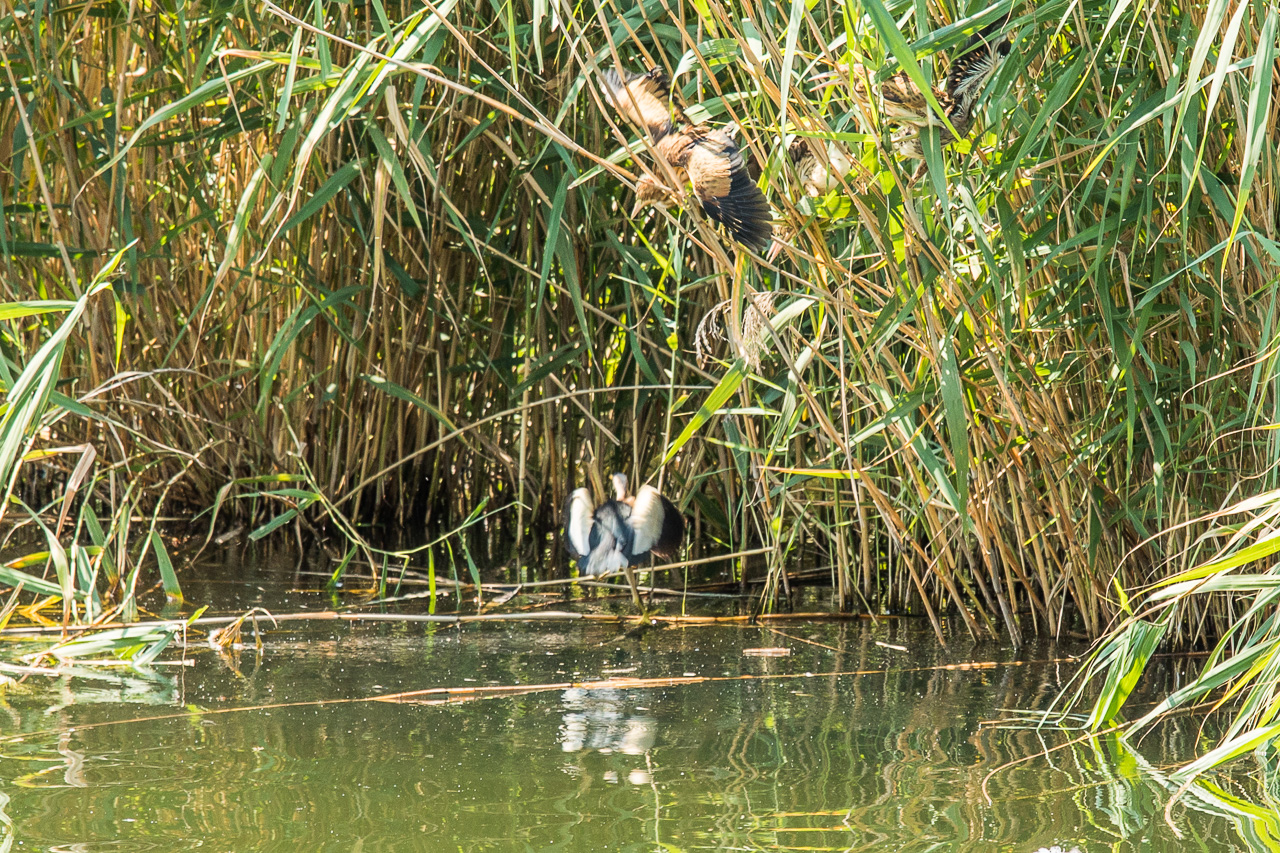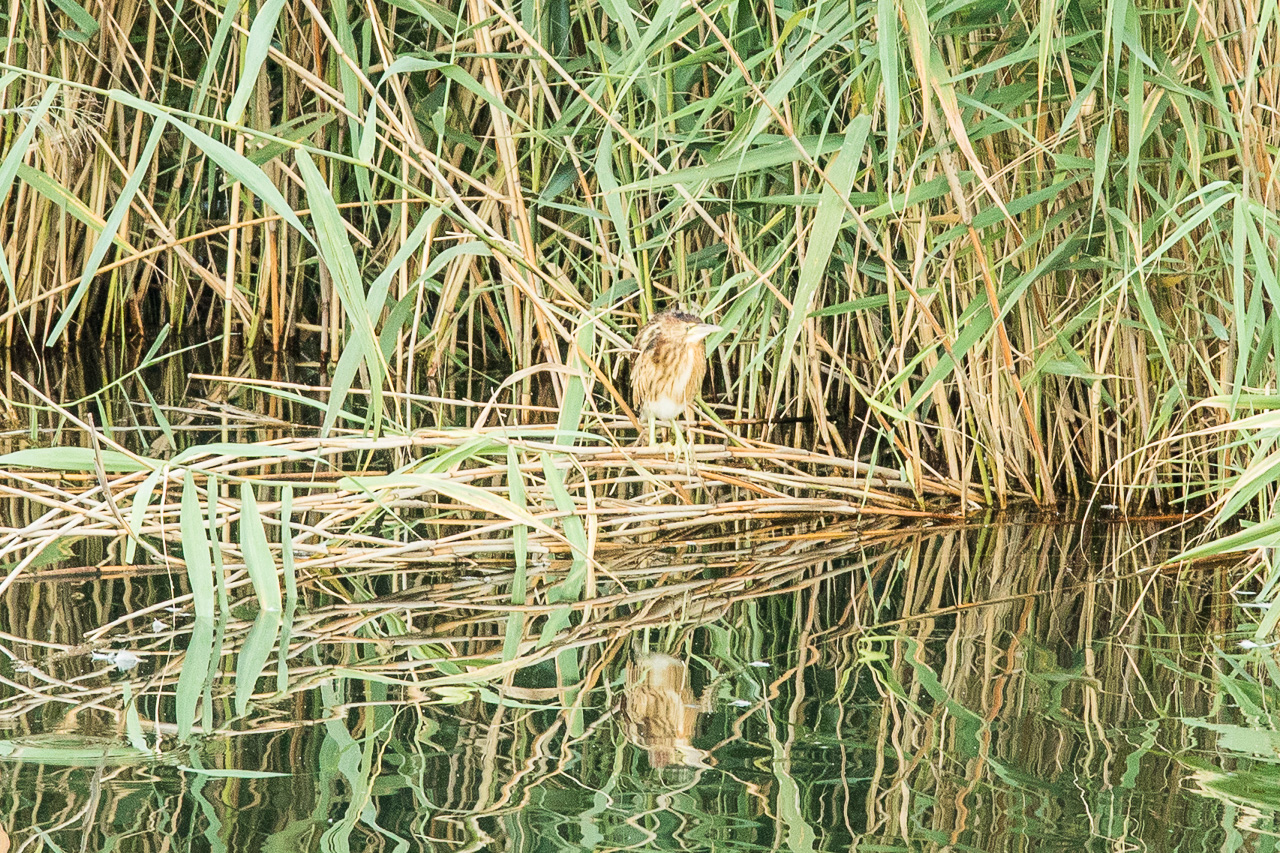 Wir gehen weiter zum Beobachtungsturm, der eine schöne Übersicht bietet über das Gebiet. Grosse Schilfgürtel dominieren diese Zone, dutzende Haubentaucher schwimmen herum. Kein Wunder, beheimatet die Grangettes doch die zweitgrösste Haubentaucherkolonie der Schweiz mit über 200 Brutpaaren. Auf dem Turm ist es angenehm kühl, ein leichter Wind weht vom See her. Weiter draussen sind drei Flosse vertäut, sie dienen den Flussseeschwalben als Brutinsel. Wir können zum ersten Mal diese seltenen Vögel beobachten. Da fliegt unten plötzlich ein Vogel vorbei, den wir ebenfalls noch nie gesehen haben: Eine Zwergdommel! Silvan strahlt beim Anblick dieses Reihervogels.