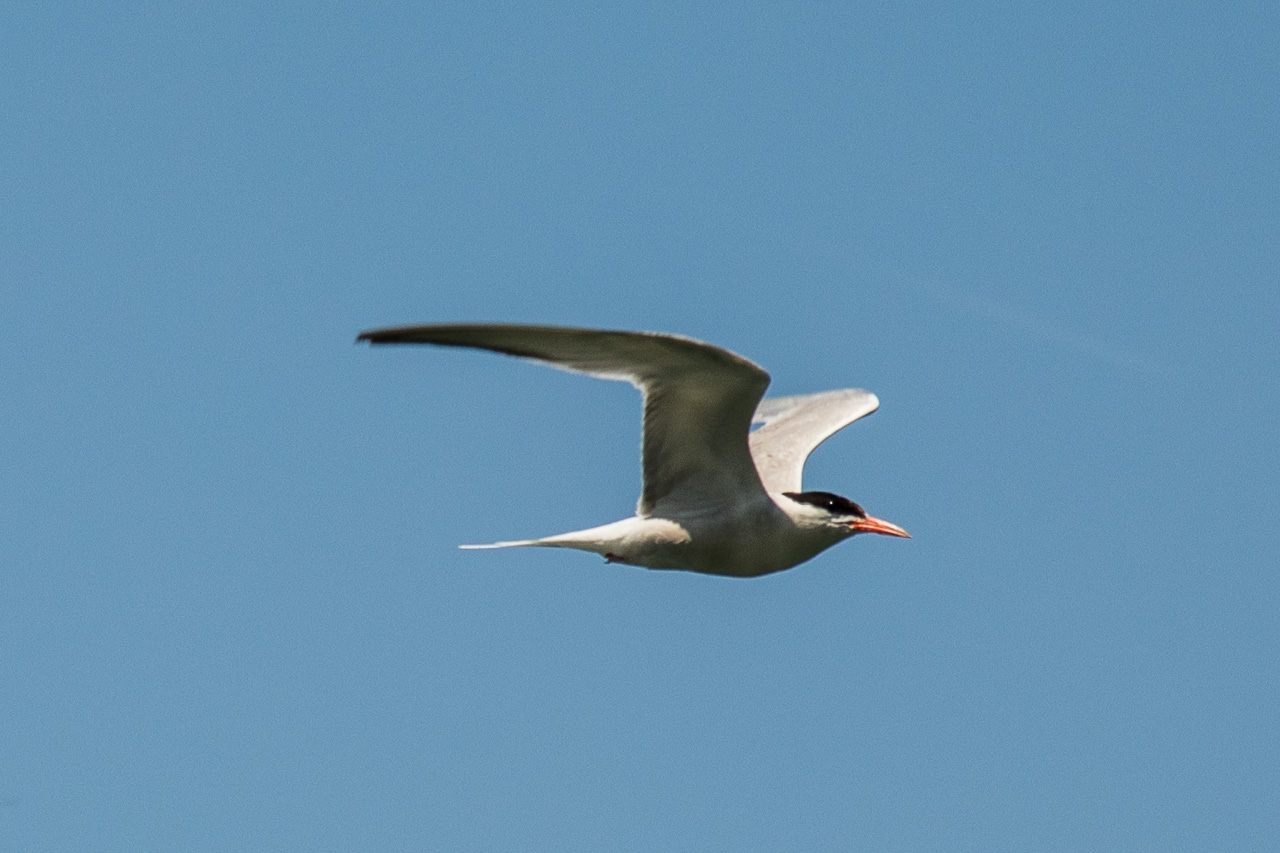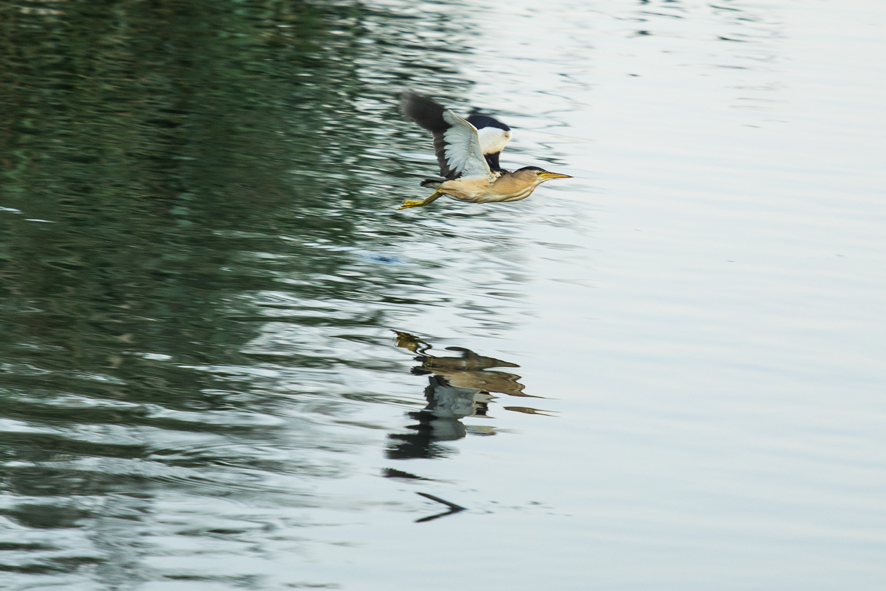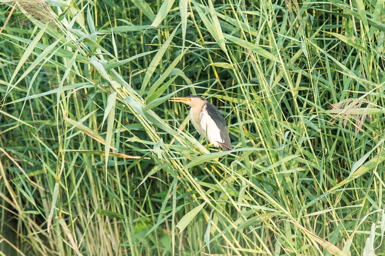 Wir gehen weiter zum Beobachtungsturm, der eine schöne Übersicht bietet über das Gebiet. Grosse Schilfgürtel dominieren diese Zone, dutzende Haubentaucher schwimmen herum. Kein Wunder, beheimatet die Grangettes doch die zweitgrösste Haubentaucherkolonie der Schweiz mit über 200 Brutpaaren. Auf dem Turm ist es angenehm kühl, ein leichter Wind weht vom See her. Weiter draussen sind drei Flosse vertäut, sie dienen den Flussseeschwalben als Brutinsel. Wir können zum ersten Mal diese seltenen Vögel beobachten. Da fliegt unten plötzlich ein Vogel vorbei, den wir ebenfalls noch nie gesehen haben: Eine Zwergdommel! Silvan strahlt beim Anblick dieses Reihervogels.