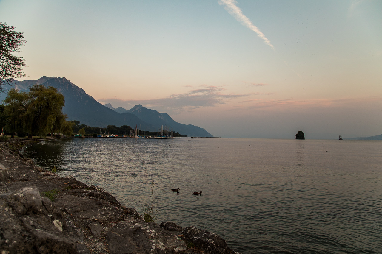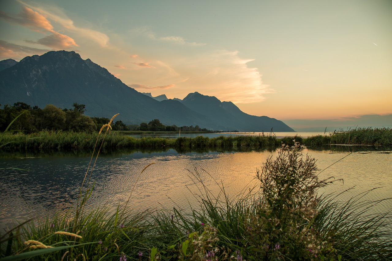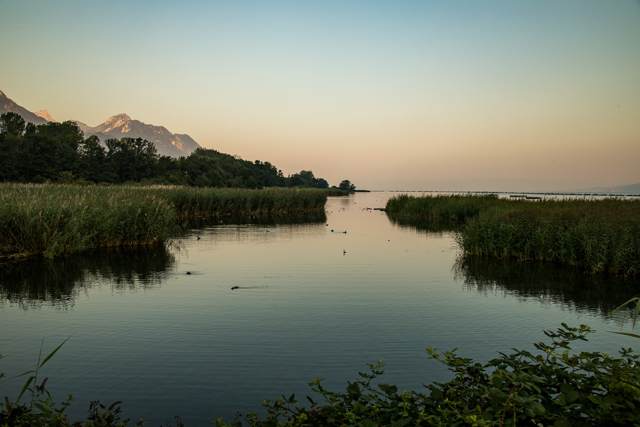 Ein Morgen- oder Abendspaziergang lohnt sich fast immer, es gibt fantastische Sonnenuntergänge und Morgenstimmungen. Also ich vermisse das Meer überhaupt nicht. Wir sind jeweils Richtung Le Bouveret zum Kanal spaziert.