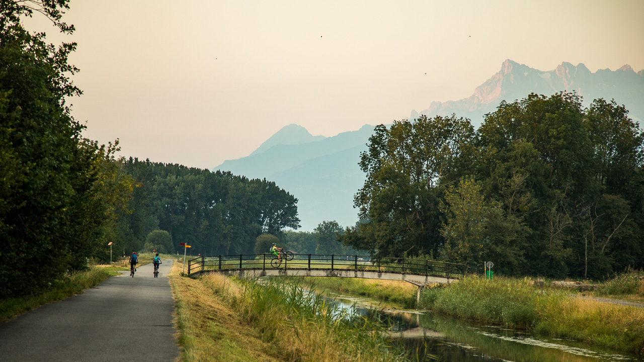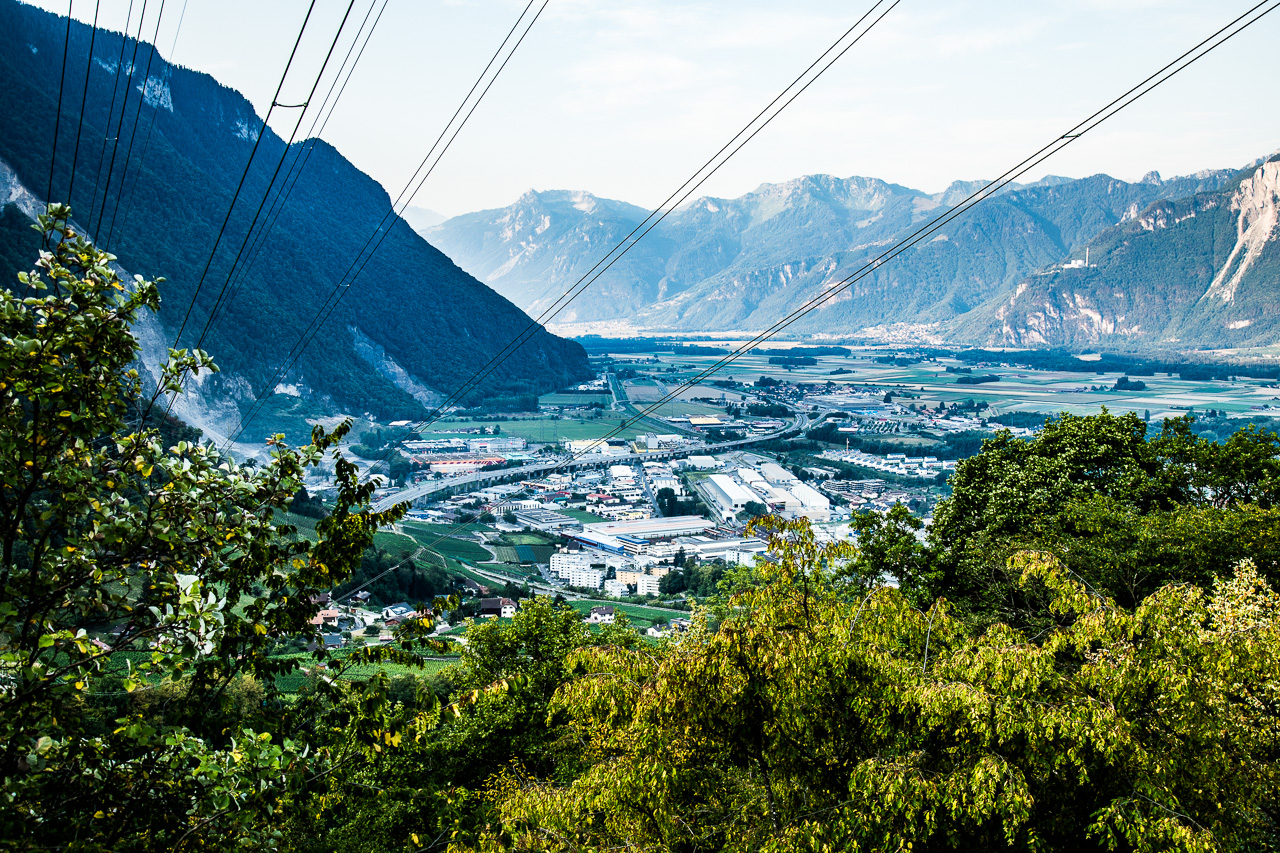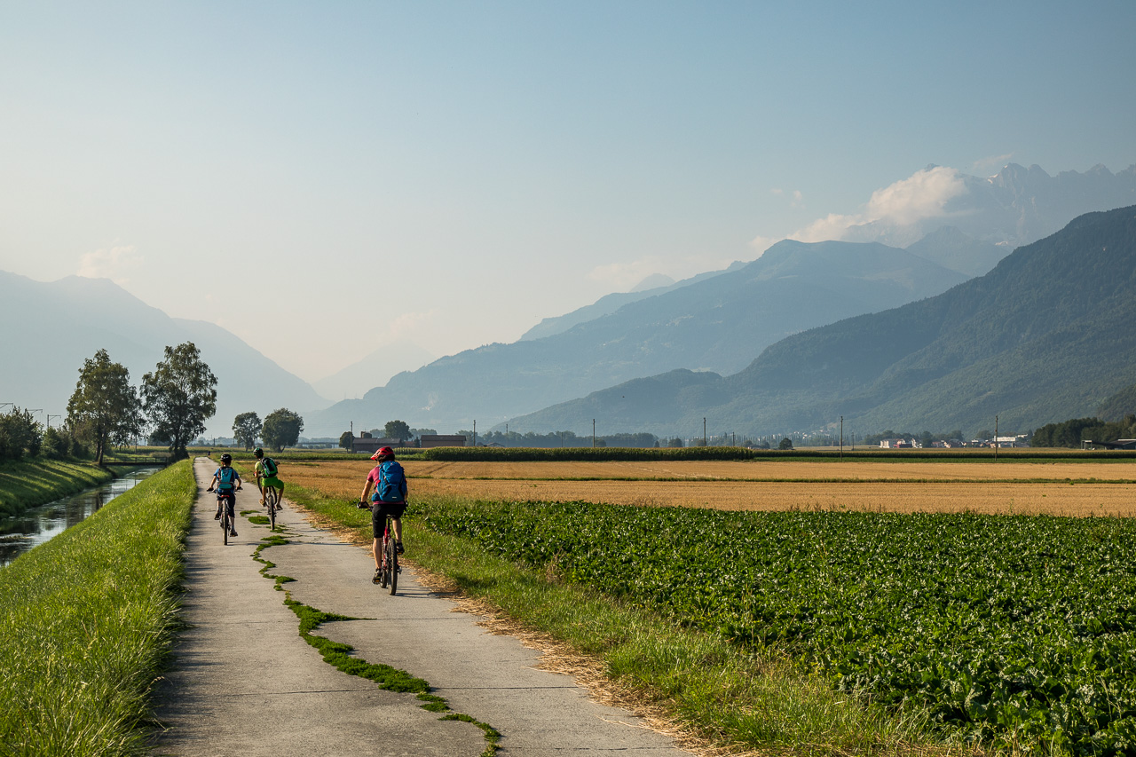Wir fahren weiter dem Stockalper-Kanal entlang, es ist immer noch wunderbar still und menschenleer. Über der anderen Talseite erhebt sich ein alter Bekannter, der Tour d’Aï. Die Route zweigt immer wieder ab in die Dörfer und führt uns durch die alten Dorfkerne. Wie toll ist doch so eine Velotour, mit dem Auto würde man diese Schmuckstücke nie kennenlernen. Und auch die Namen wie Vouvry, Vionnaz und Muraz erwecken eher Fragezeichen. Bei Colombey verlassen wir die ausgeschilderte Route, überqueren die Rhone und fahren nach St-Triphon, wo wir den Botanischen Garten besuchen wollen.