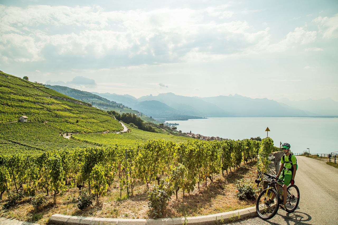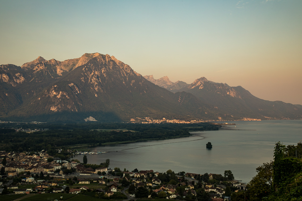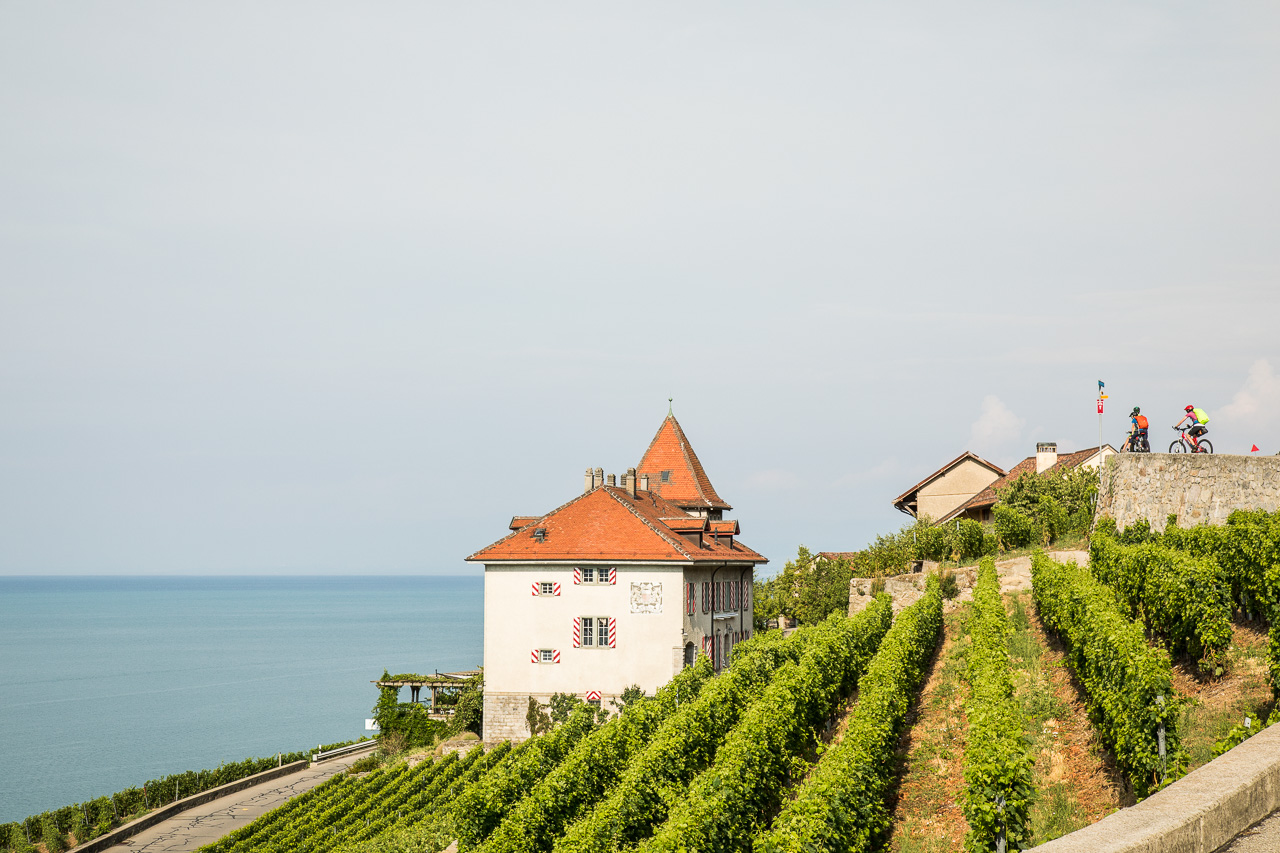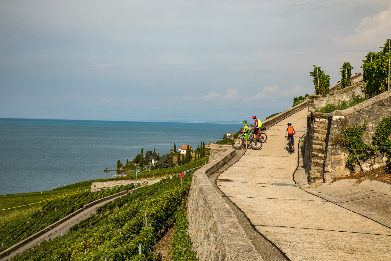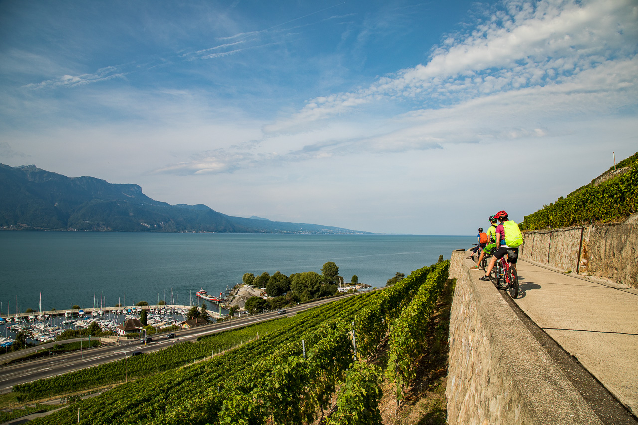 Weiter geht es dem See entlang nach La Tour-de-Peilz, wo wir auf die Hauptstrasse wechseln müssen. Erst in Vevey können wir wieder dem See entlang radeln. Aber hier beginnt auch die Lavaux, das heisst, der Weg steigt hoch in die Rebberge. Hier gibt es auch keinen Autoverkehr mehr, dafür umso mehr Aussicht. Reben, soweit das Auge reicht, der See, die Berge. Es sieht wirklich sehr schön aus.