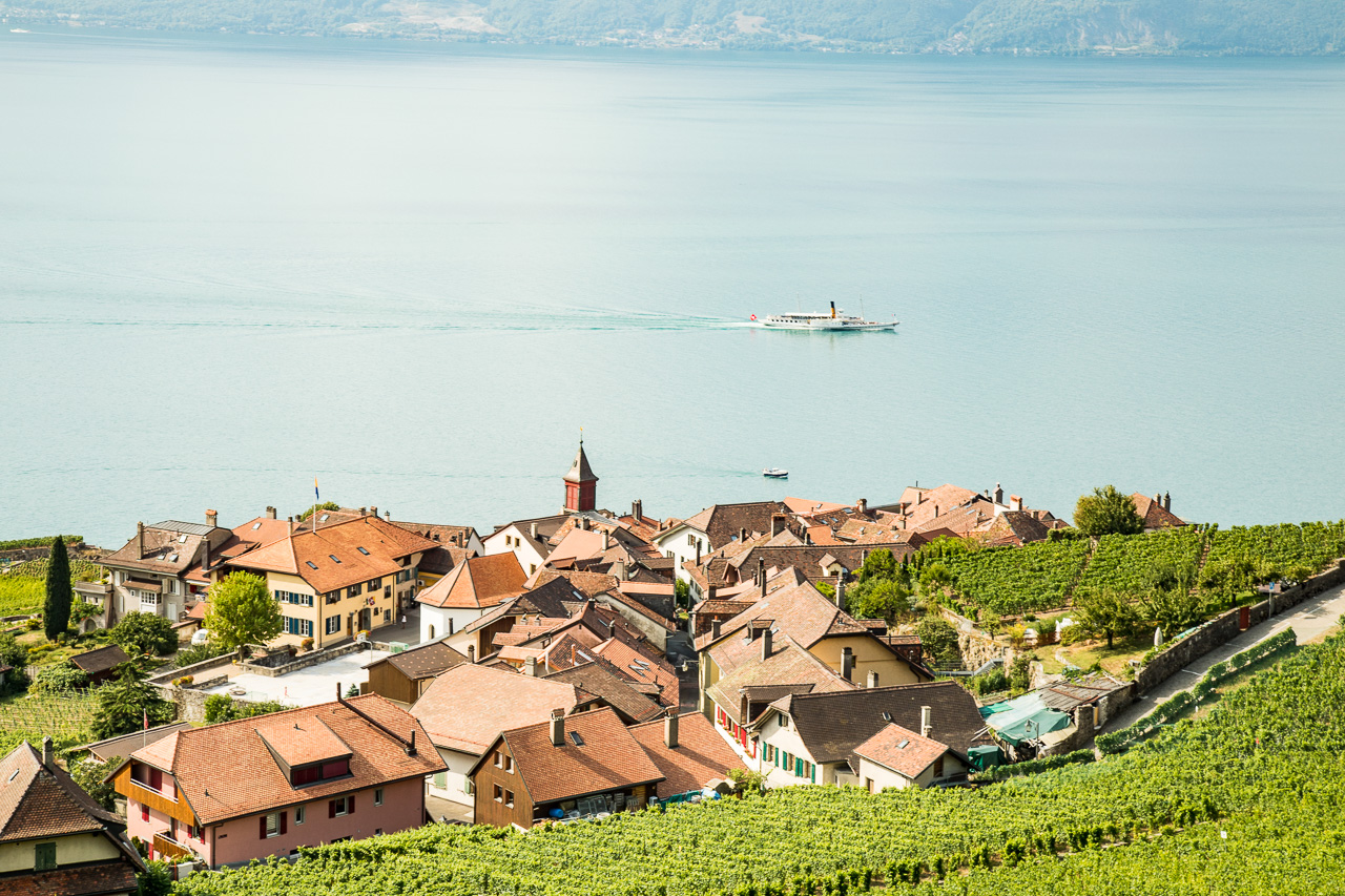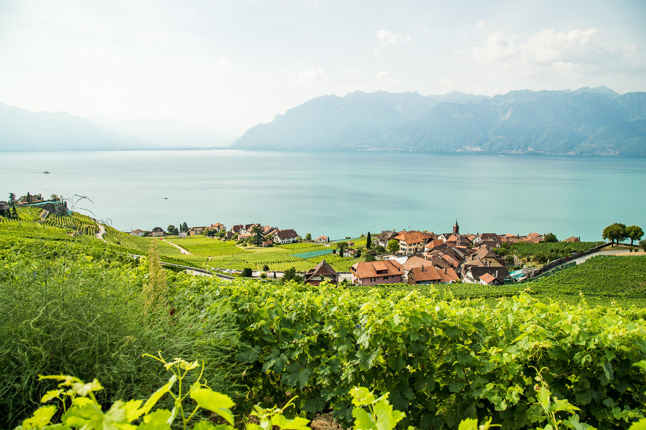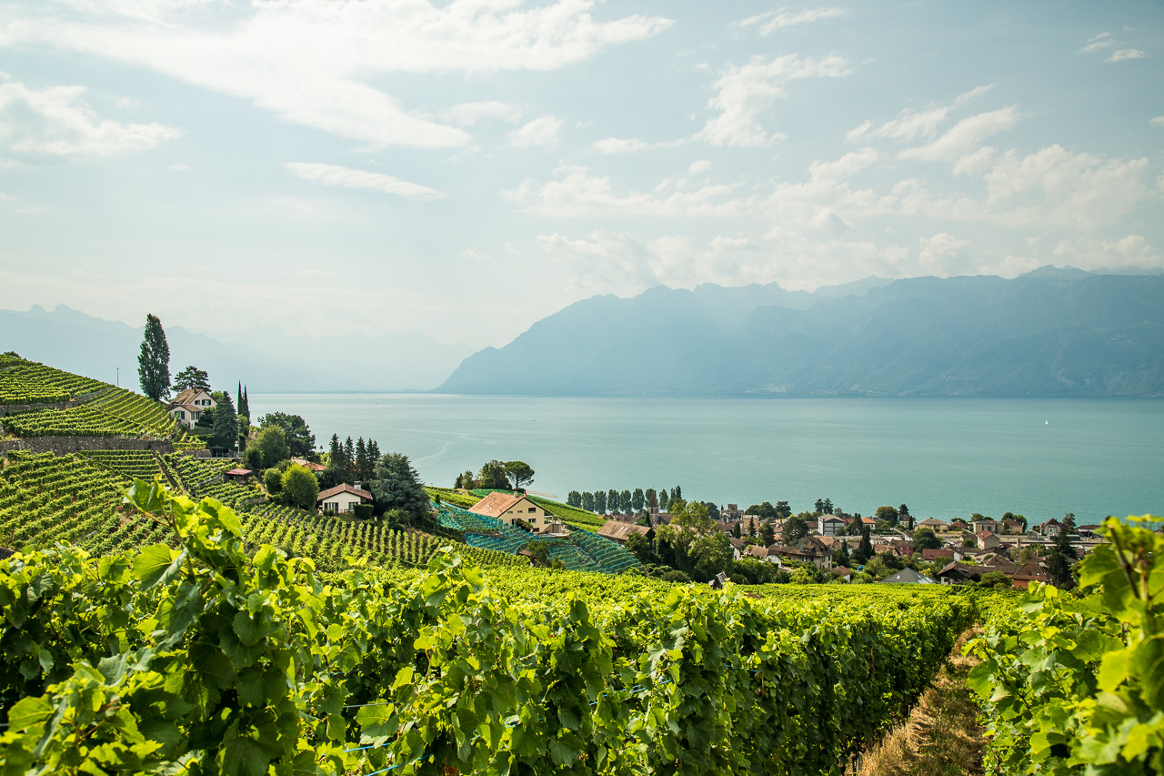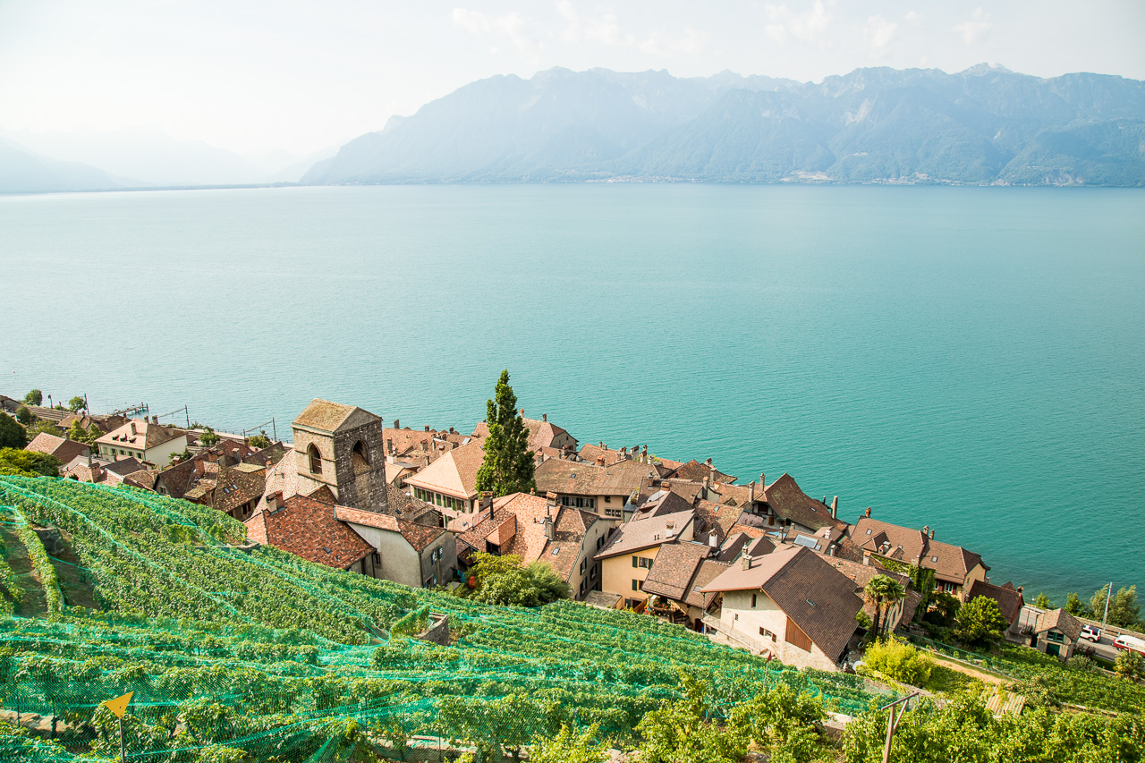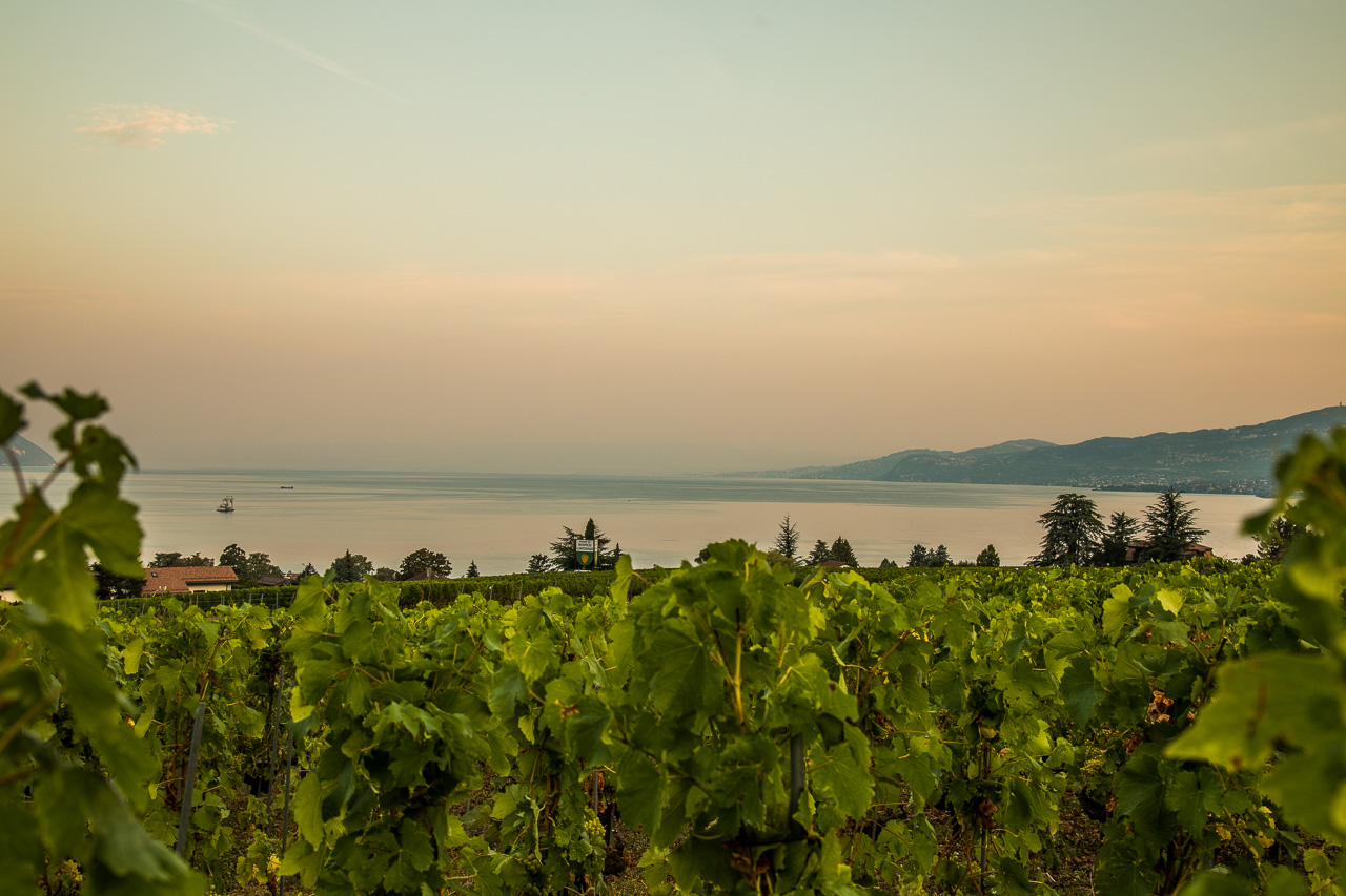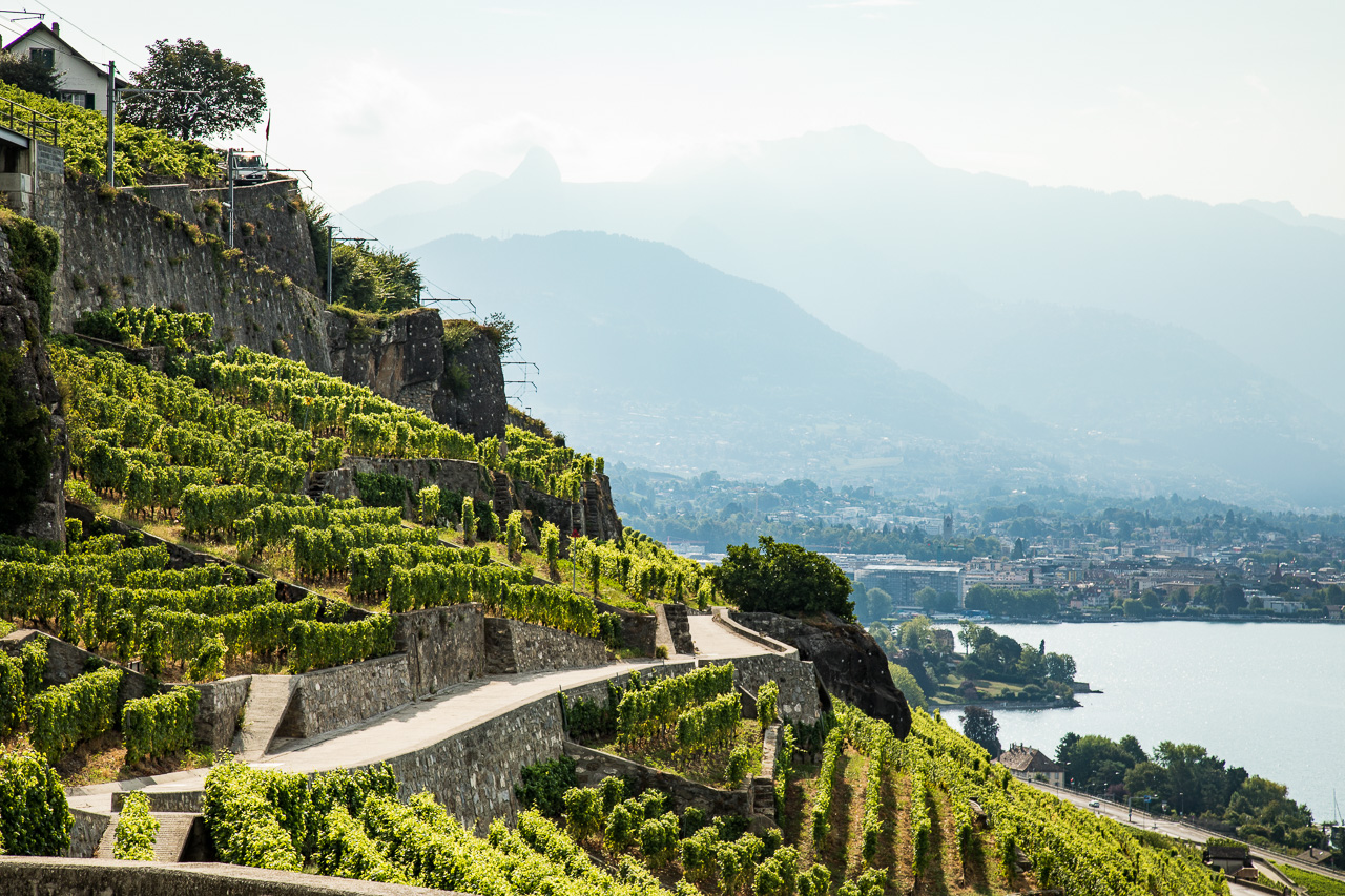 Weiter geht es dem See entlang nach La Tour-de-Peilz, wo wir auf die Hauptstrasse wechseln müssen. Erst in Vevey können wir wieder dem See entlang radeln. Aber hier beginnt auch die Lavaux, das heisst, der Weg steigt hoch in die Rebberge. Hier gibt es auch keinen Autoverkehr mehr, dafür umso mehr Aussicht. Reben, soweit das Auge reicht, der See, die Berge. Es sieht wirklich sehr schön aus.