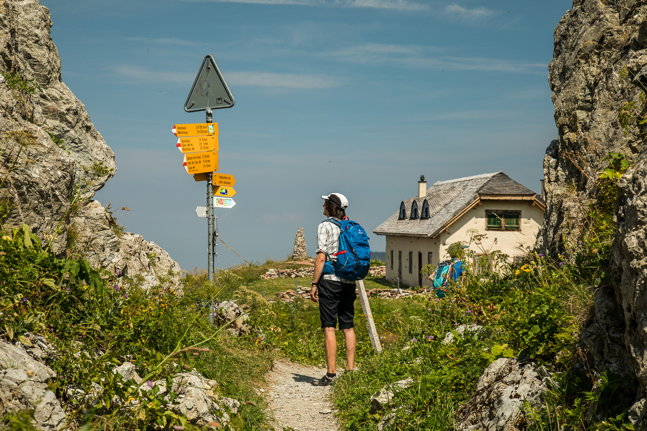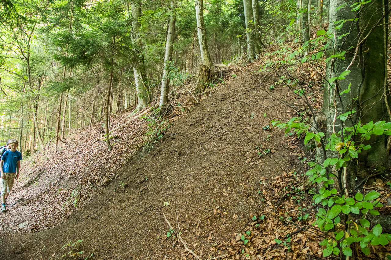 Wir gehen schnell weiter, erreichen den Wald, wo es nach dem flachen Abschnitt endlich hoch geht. Und wie. Der Weg steigt steil an durch den Wald, kreuzt immer wieder die Strasse nach Sonchaux, unserem ersten Etappenziel. Dafür gewinnen wir schnell an Höhe. Irgendwo unterwegs werden die Ameisen auf dem Weg immer zahlreicher. Bis wir vor ihrem Haufen stehen: Bestimmt drei Meter hoch! So einen riesigen Ameisenhaufen haben wir noch nie gesehen. Inzwischen ist die Sonne da, wir können aber im schattigen Wald wandern. In der Auberge de Sonchaux legen wir nach den ersten 900 Höhenmetern eine wohlverdiente Pause ein.