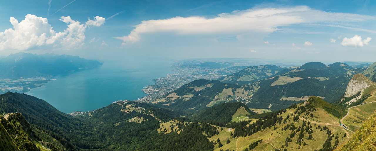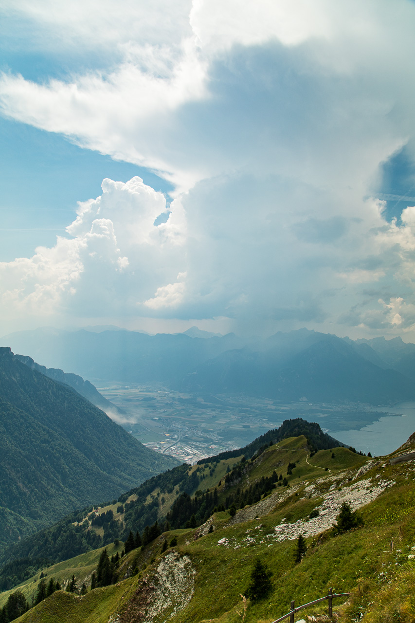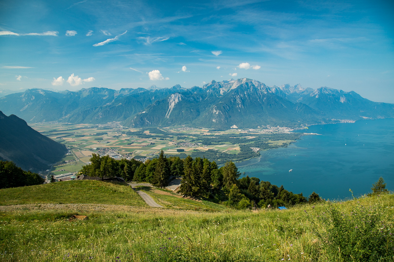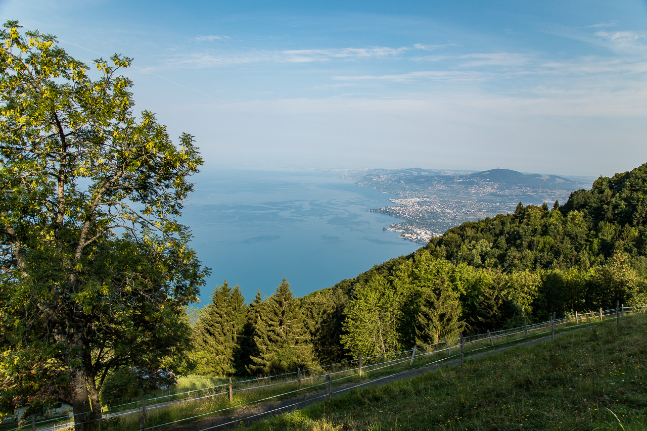 Die Rochers de Naye sind ein beliebter Aussichtsberg, der bequem mit dem Zug von Montreux aus erreicht werden kann. „Das kann jeder“, dachten wir uns, und starten noch vor sechs Uhr auf dem Zeltplatz. Wir wandern durch den inzwischen bekannten Auenwald nach Villeneuve. Plötzlich ein Rascheln und Quicken im Gebüsch: Wildschweine! Sie waren wohl genau so überrascht wie wir. Nach Villeneuve steigen wir durch die Rebberge hoch, die durch die Autobahn zerschnitten sind. Ein furchtbarer Lärm!