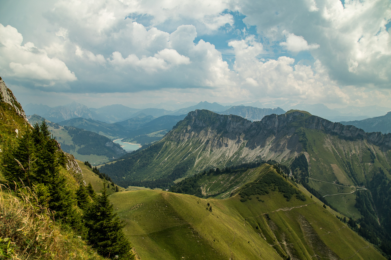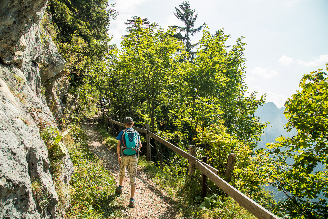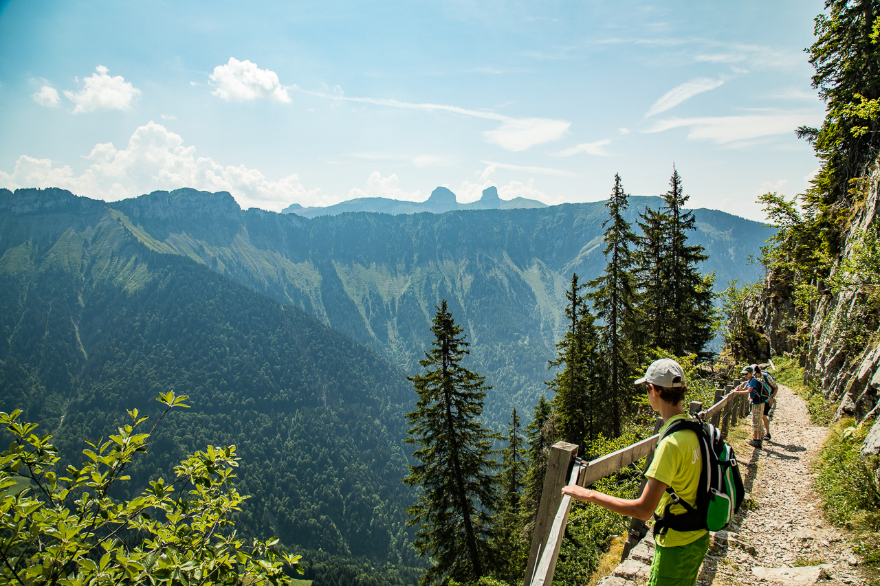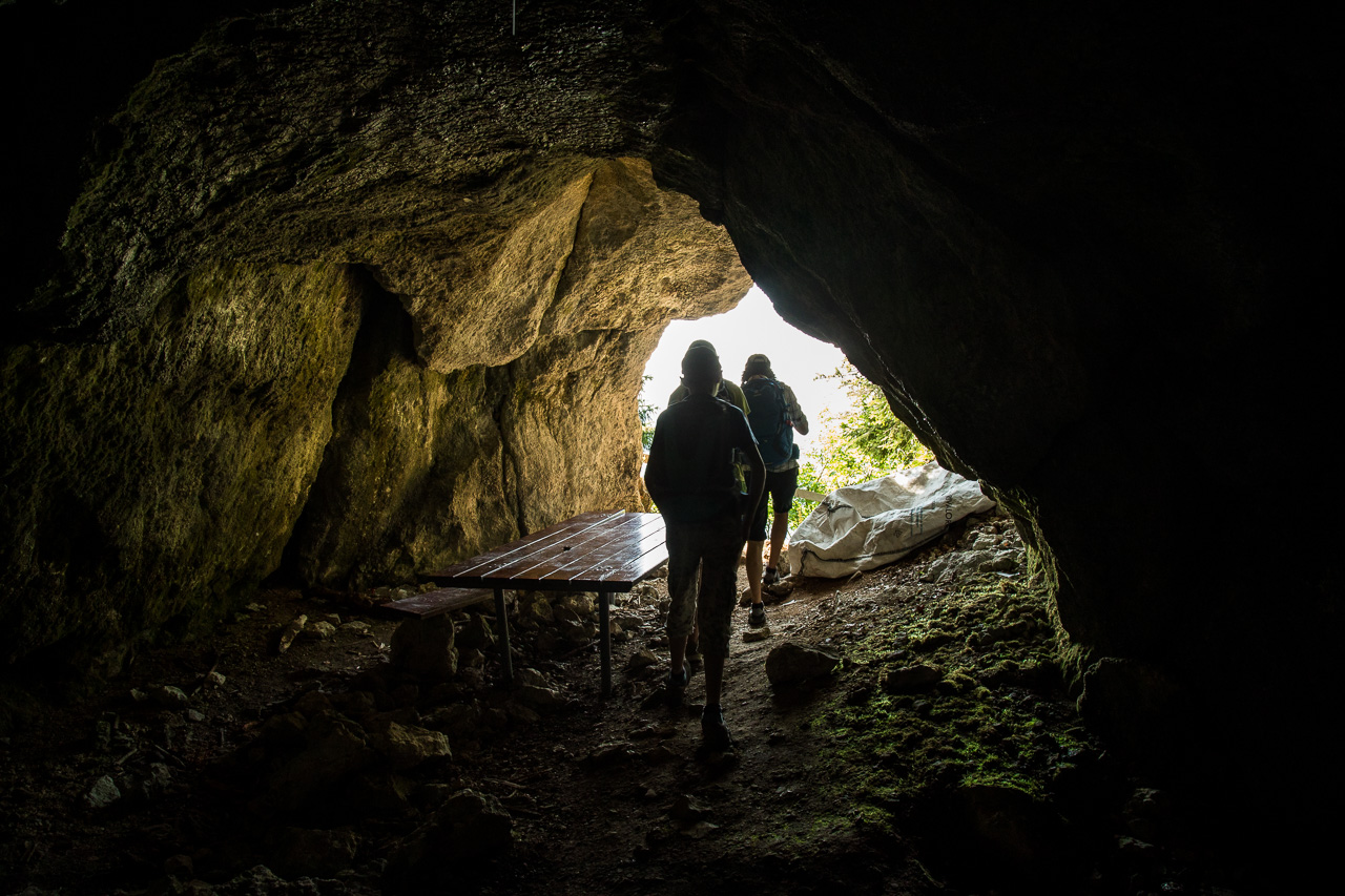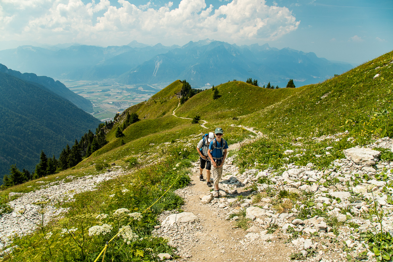 Nach dieser Stärkung läuft es bei Silvan besser, und auch die Aussicht wird besser. Wir blicken auf den oberen Genfersee und die Rhoneebene. Der Weg geht weiter durch den Wald, worüber wir noch froh sind. Wir kommen an einer Höhle vorbei, gehen ein paar Meter hinein. Ist das kalt hier! Und tut das gut bei der Hitze. Ewig währt der Schatten aber nicht, bald schon erreichen wir die Waldgrenze. Dafür scheint der Gipfel zum Greifen nah.