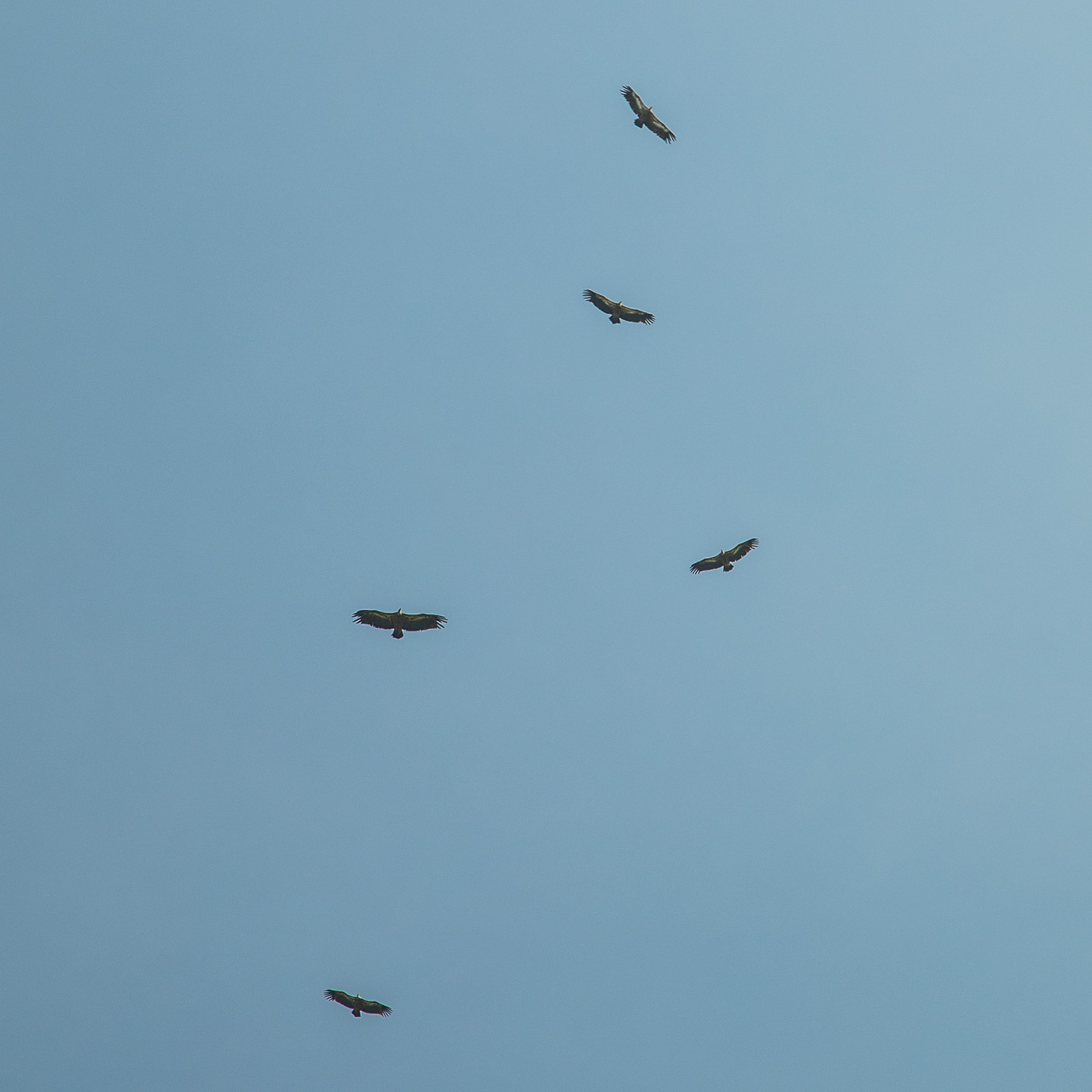 Plötzlich taucht am Horizont ein Flugzeug auf, dann noch eines und noch eines. Nein, halt, das sind ja gar keine Flugzeuge, das sind… Gänsegeier! Wie ein Geschwader WWII-Jagdflugzeuge kommen sie daher. Was für ein Anblick, was für ein Erlebnis! Zehn dieser riesigen Vögel fliegen über uns und Silvan hat wieder ein Strahlen im Gesicht. „Jetzt haben sich diese Ferien definitiv gelohnt!“ findet er. Ja, das finde ich auch.