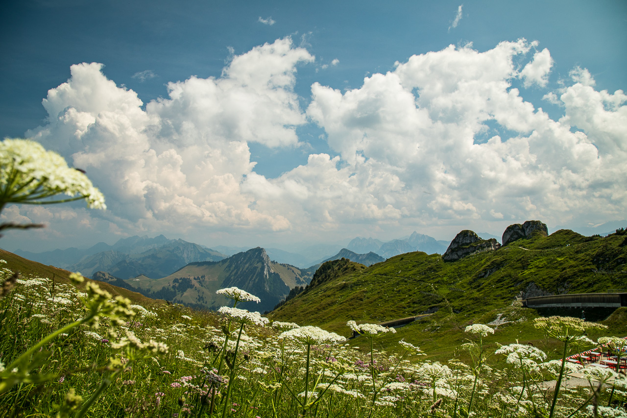 Die letzten Meter vergehen da wie von selber, wir merken die 1600 Höhenmeter gar nicht, die wir bis jetzt zurückgelegt haben. Kurz darauf erreichen wir das Bergrestaurant, wo Fabian zurückbleibt, ihm tun alle Gelenke weh. Wir wollen noch ganz auf den Gipfel und die Aussicht geniessen. Grossartig! Auch wenn wir es viel einfacher hätten haben können. Wenn wir aber andere sehen, wie die schnaufen, obwohl sie nur von der Bahnstation die nicht mal 60 Höhenmeter zum Gipfel zurückgelegt haben, fühlen wir uns noch ganz frisch.