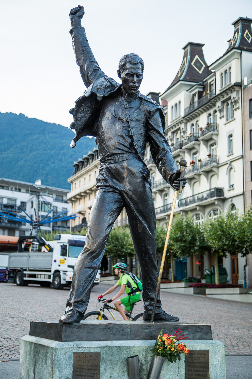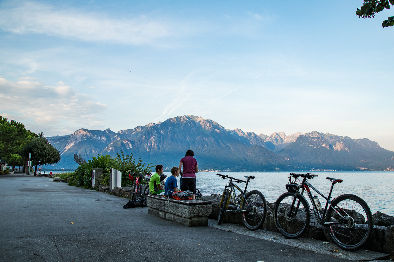 Die Lavaux, ein UNESCO Kulturerbe. Praktischerweise führt auch eine Veloroute durch die Rebhänge am Genfersee. Wir starten wieder sehr früh, noch vor Sonnenaufgang, fahren am Schloss Chillon vorbei und machen in Montreux eine erste Pause, um unser Frühstück nachzuholen.