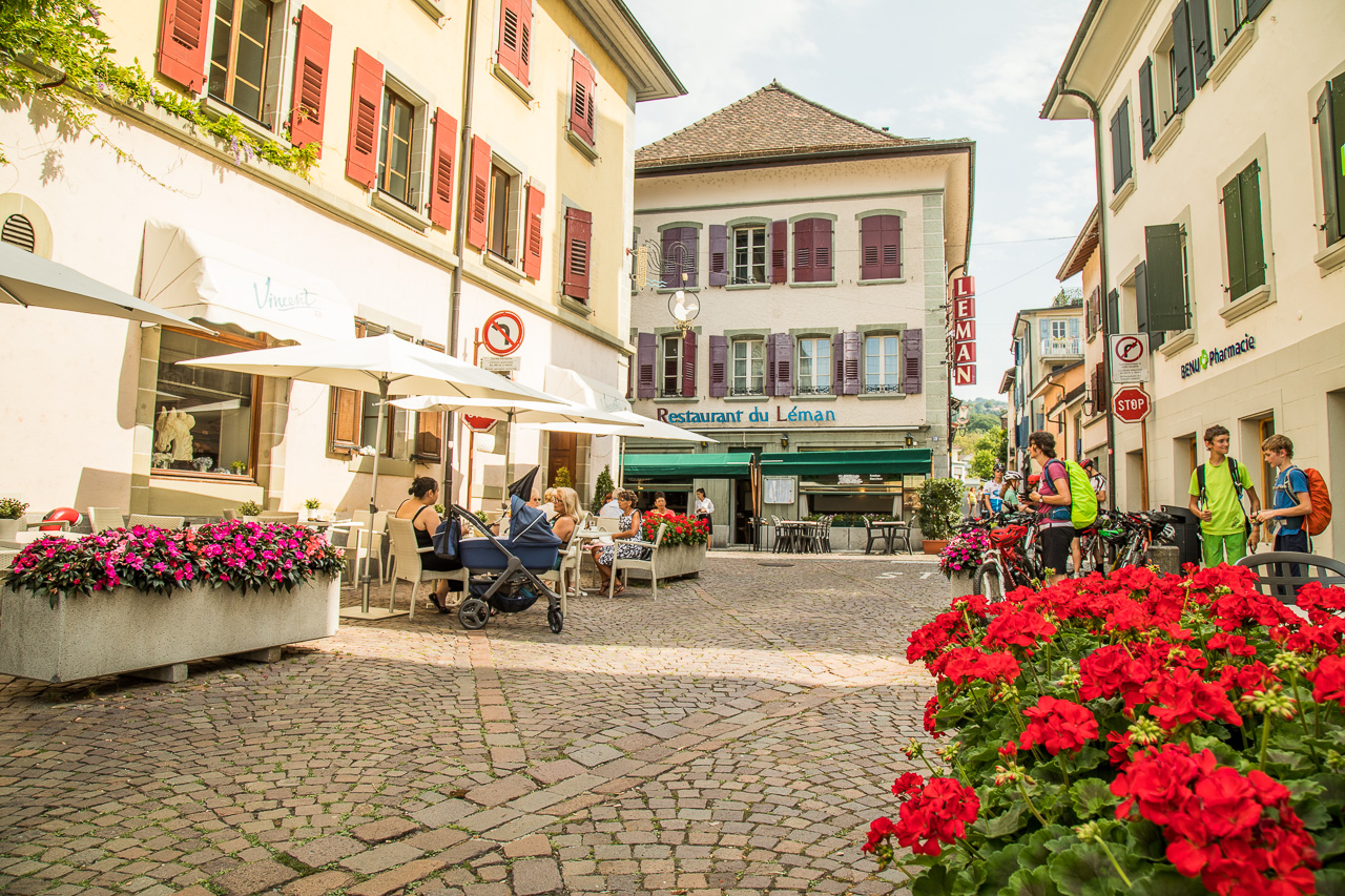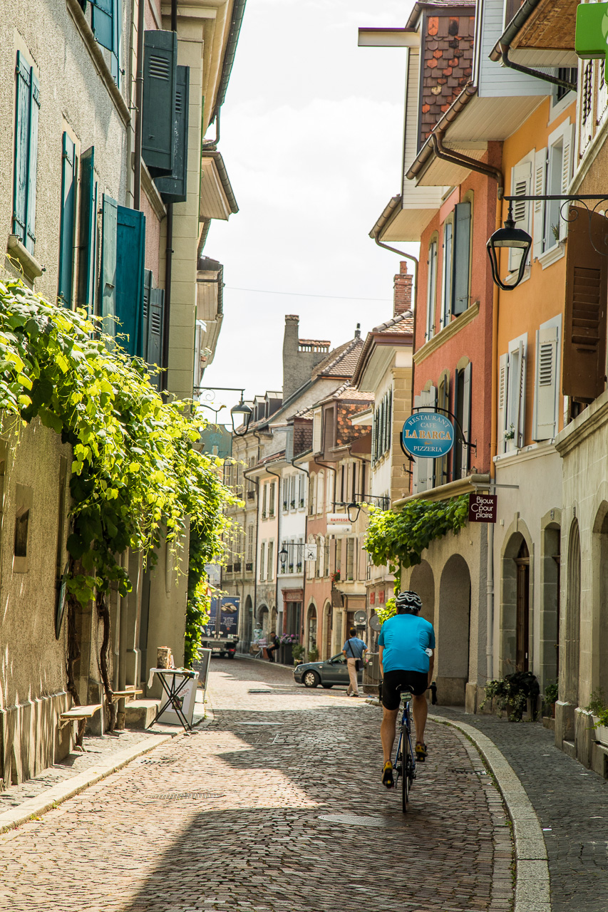 Wir fahren über dem bekannten Weindorf St-Saphorin vorbei, ständig geht es auf und ab, und das nicht zu knapp. Immer wieder gibt es knackige Anstiege. Wir durchqueren Epesses, nun wieder auf der offiziellen Strasse mit entsprechendem Autoverkehr. Weinkeller reiht sich an Weinkeller, in jedem Dorf. Touristen werden carweise hinchauffiert. Irgendwie ist es nicht ganz das, was ich erhofft hatte. Ungefähr ab Aran ist es nur noch Höhe vernichten, um den Genfersee zu erreichen. In Lutry erreichen wir wieder eine mehr oder weniger autofreie Zone und, noch besser, ein Café.