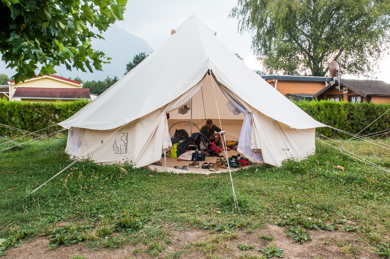 Der Zeltplatz liegt mitten im Naturschutzgebiet „Les Grangettes“, was wohl nur möglich ist, weil der Camping schon da war, bevor das Gebiet unter Schutz gestellt wurde. Wenn man nicht das eigene Zelt mitnehmen will oder kann, hat man die Möglichkeit, ein Zelt oder einen Pod zu mieten. Es gibt sie in verschiedenen Komfortkategorien, wir begnügten uns mit dem einfachsten, das immer noch sehr grosszügig war im Vergleich zu unseren Kuppelzelten. Man konnte aufrecht stehen und hatte viel Platz. Leider gibt es keine Einkaufsmöglichkeit, wo man die alltäglichsten Sachen einkaufen kann. Die nächste Gelegenheit ist der Coop in Villeneuve, mit dem Velo gut erreichbar.