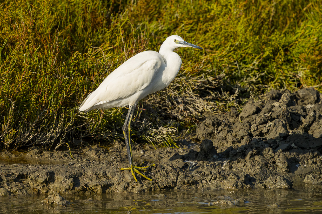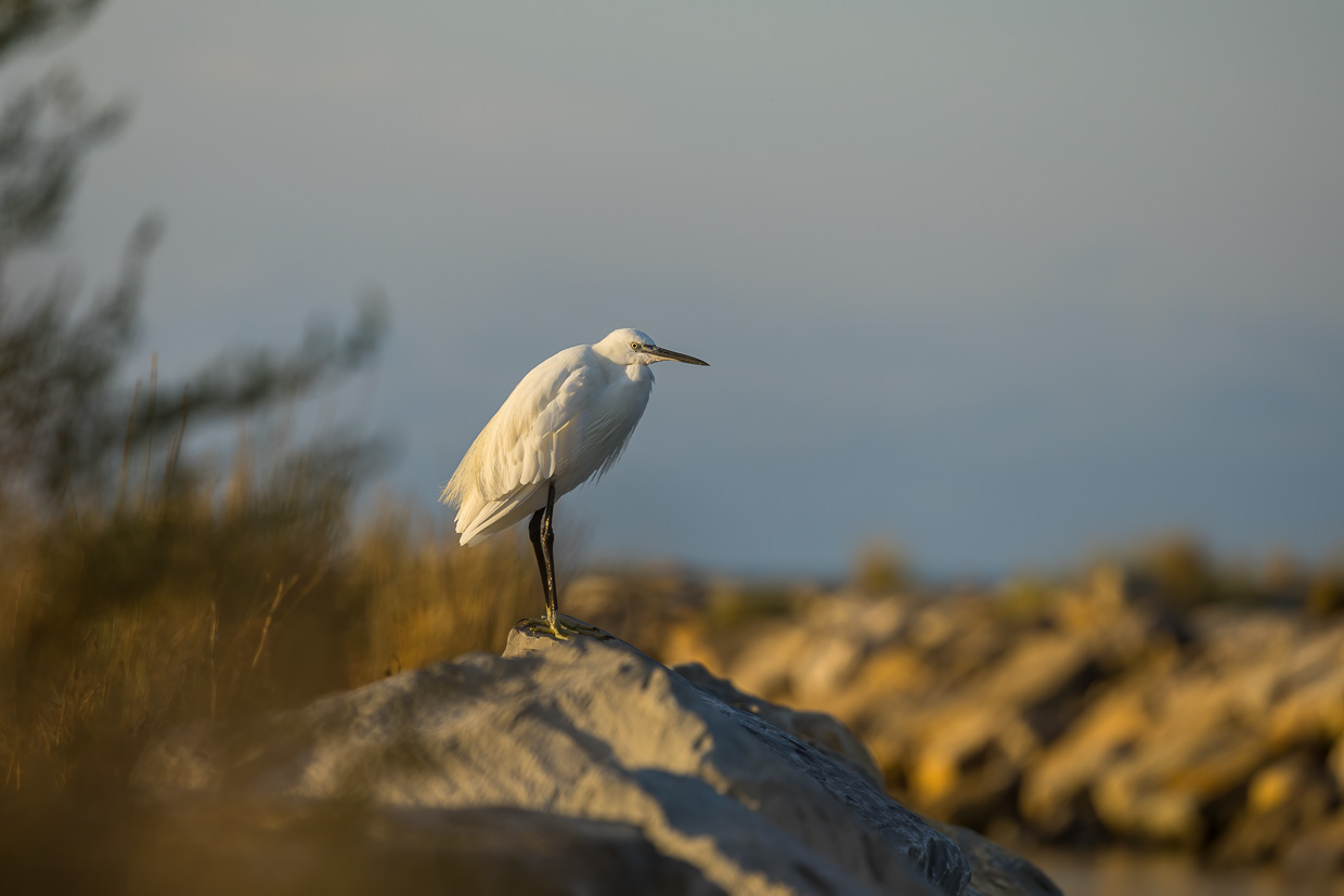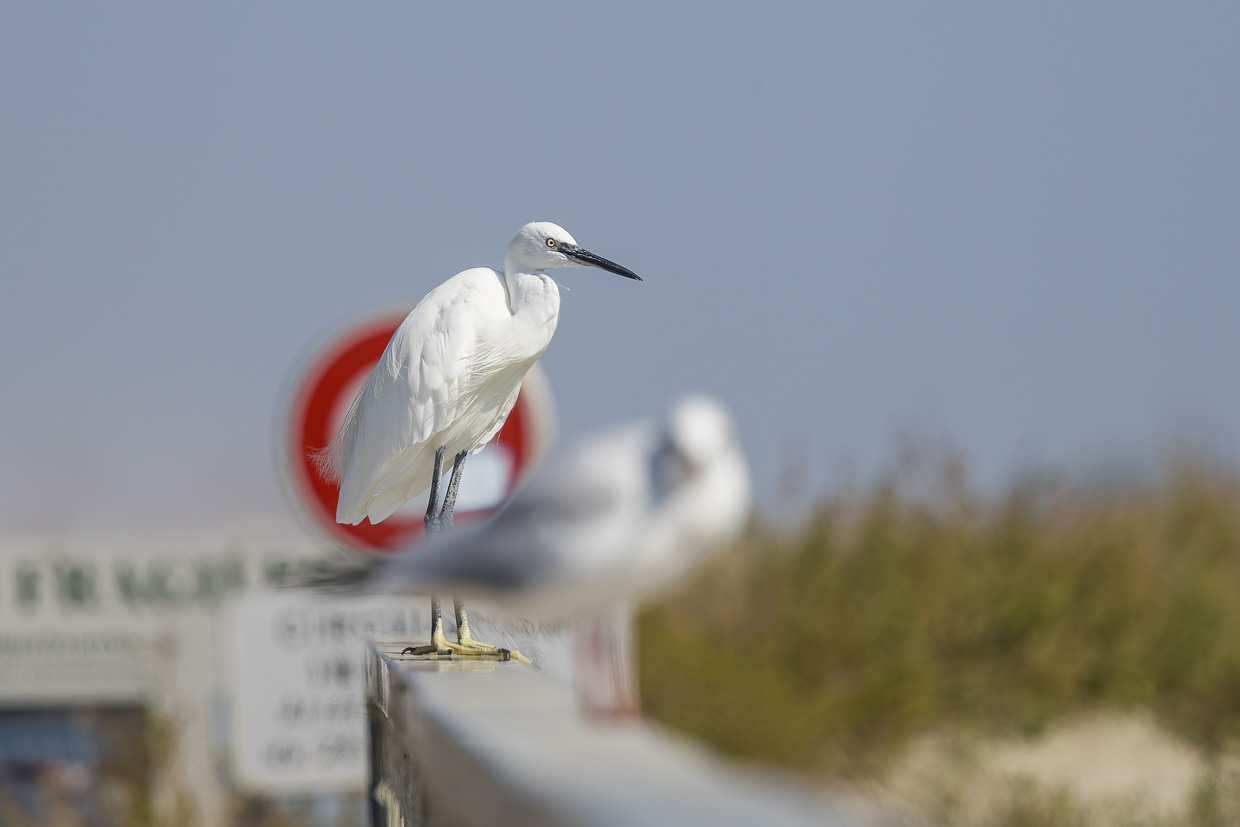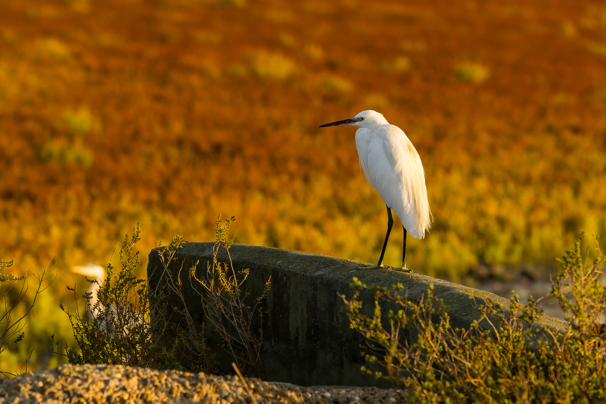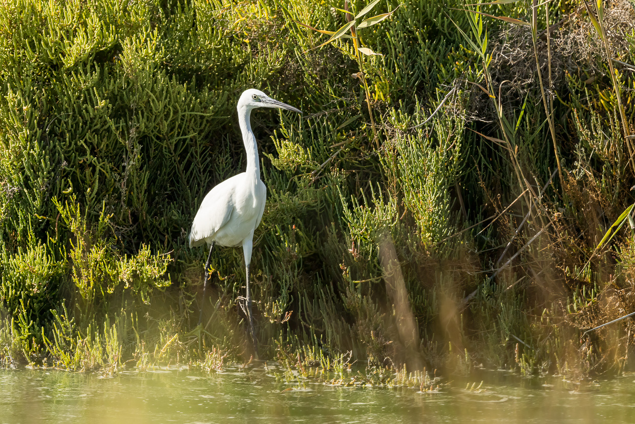 Wäre da nicht der andere Vogel, könnte man glatt sagen, er sei der Charaktervogel der Camargue: Der Seidenreiher. Überall sieht man ihn, den Reiher in seinem auffälligen weissen, seidenen Kleid.