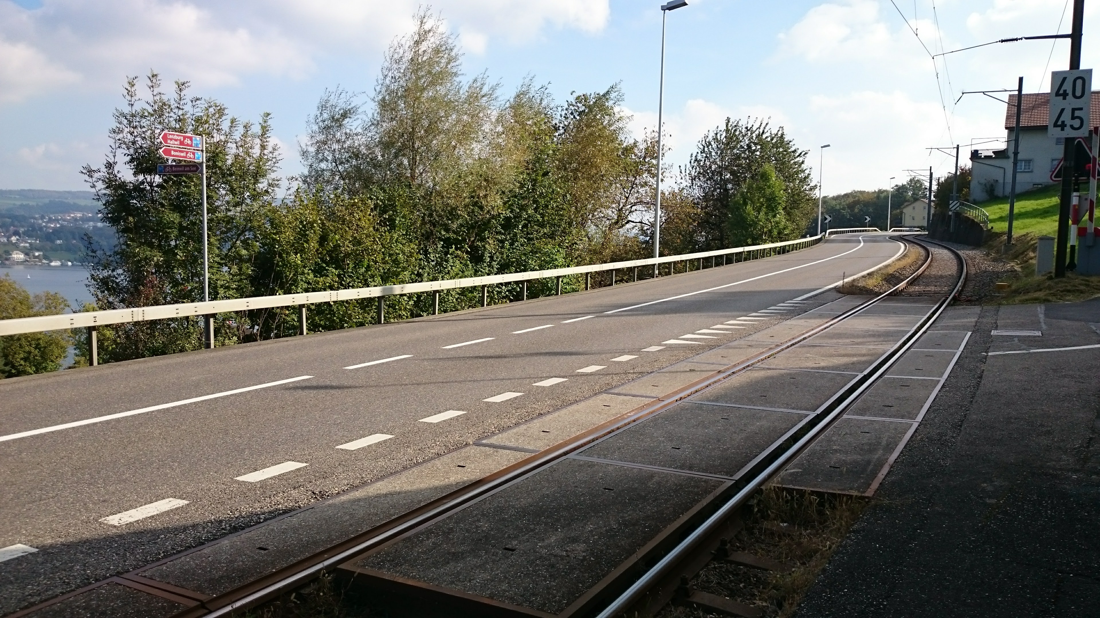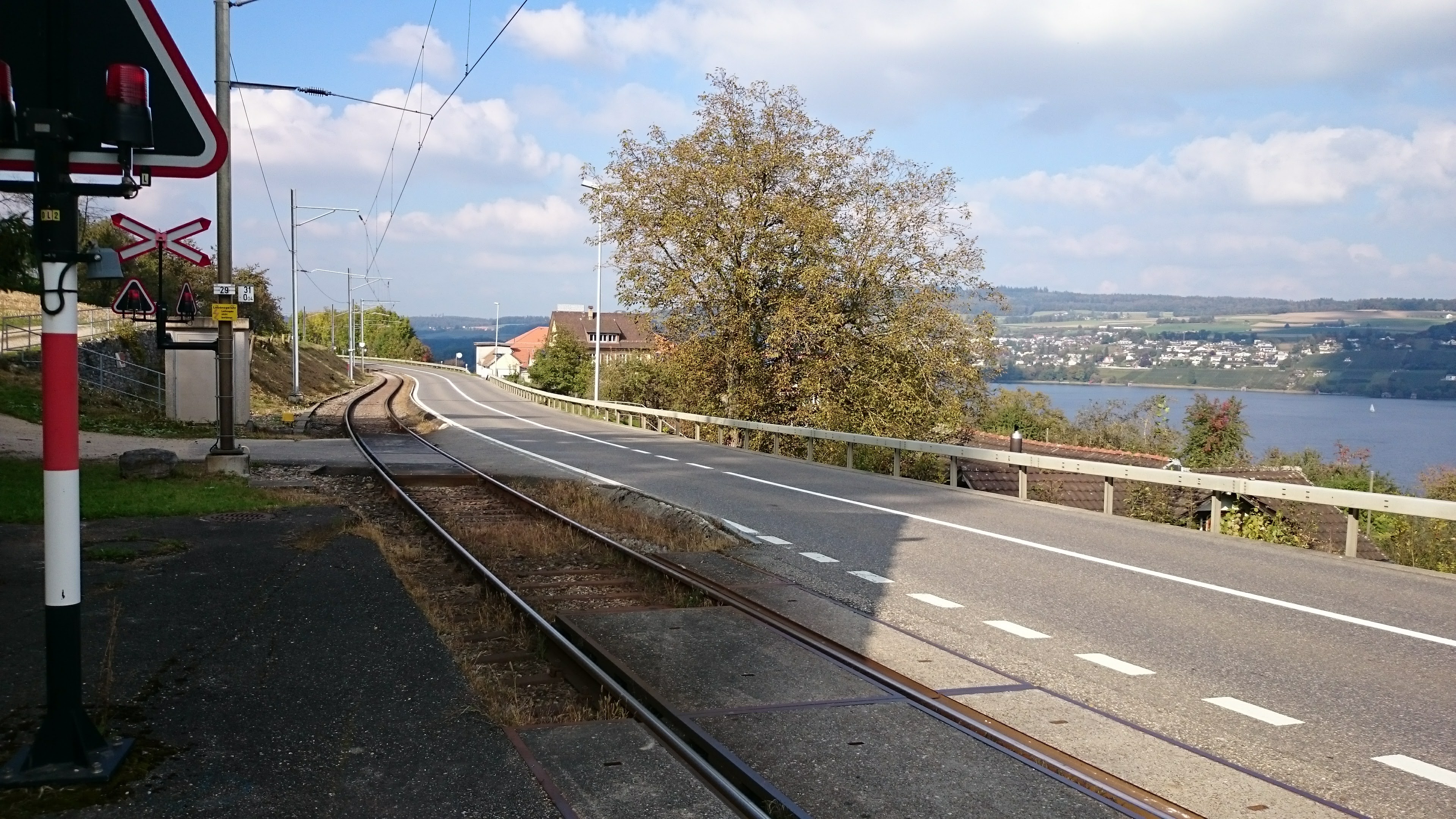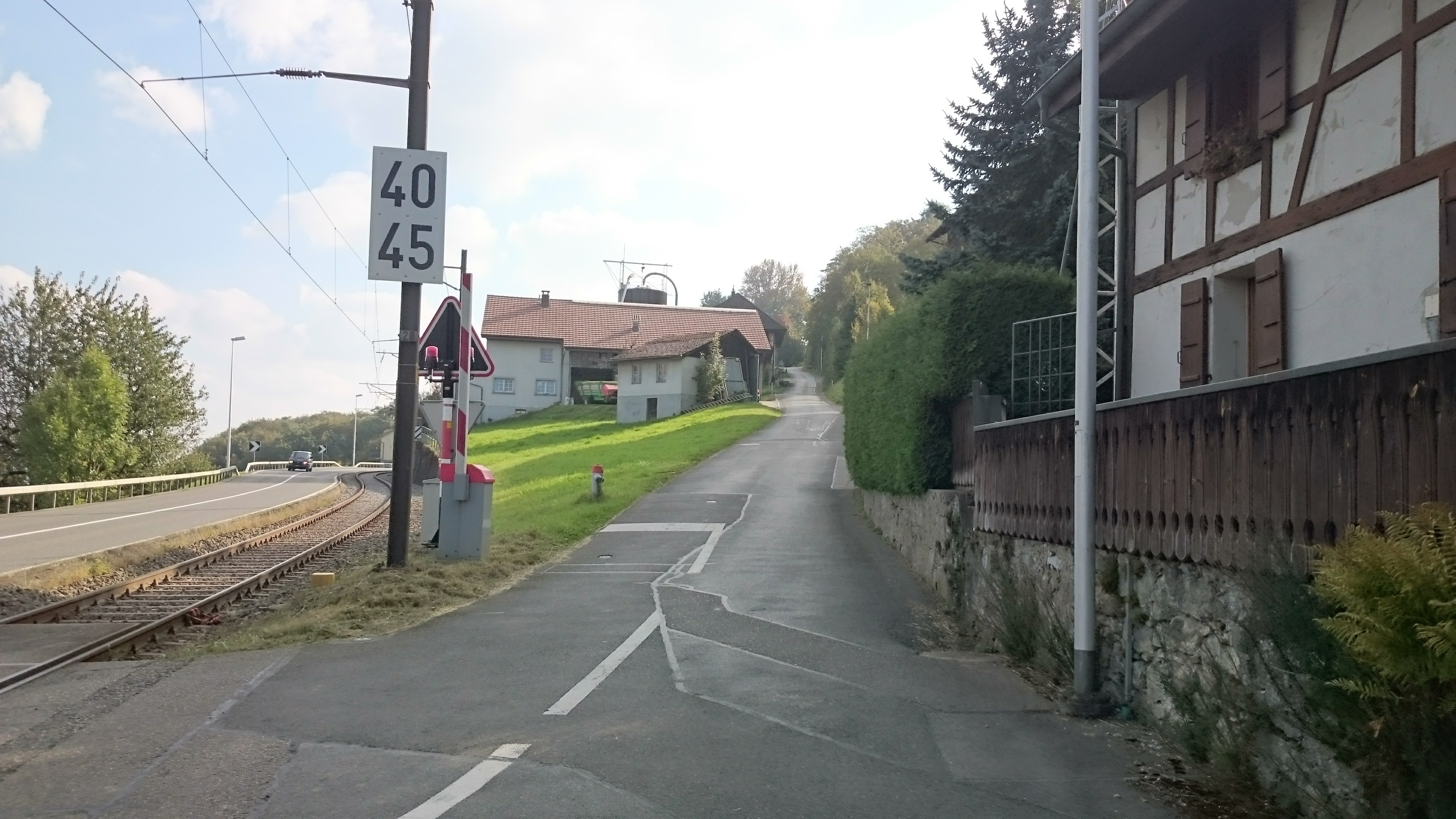 Dieser Abschnitt ist der gefährlichste. Zuerst einmal ist der Weg (Stand Oktober 2016) nicht ausgeschildert. Erst beim (unbewachten) Bahnübergang nach Birrwil hoch sind wieder Wegweiser angebracht. Und damit sind wir auch schon beim Kernproblem: Hier muss man im 80er-Bereich den Bahnübergang queren, der erst noch nach einer leichten Rechtskurve liegt. Kommt nun also ein Zug, muss man zwischen den Autos und dem Zug warten, was äusserst gefährlich ist. Mit einer Familie ist das unzumutbar.