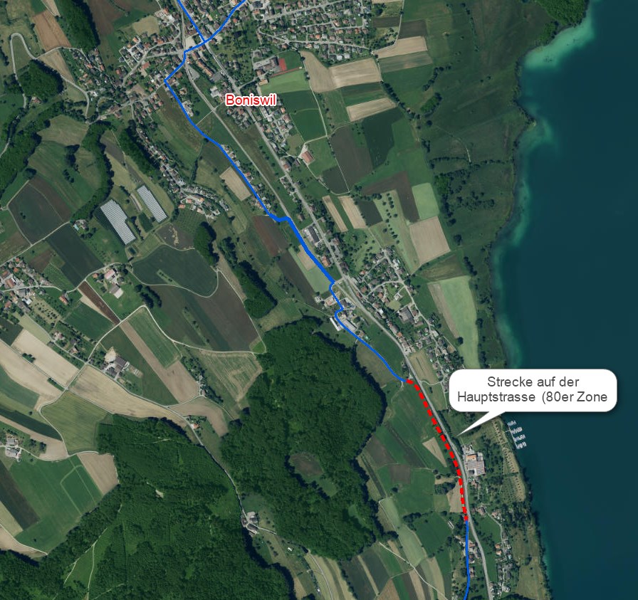 Von Meisterschwanden her wird der Radweg auf der Hauptstrasse geführt. Sehr idyllisch, wenn die Fahrzeuge mit 50 – 80 km/h an einem vorbeirasen.