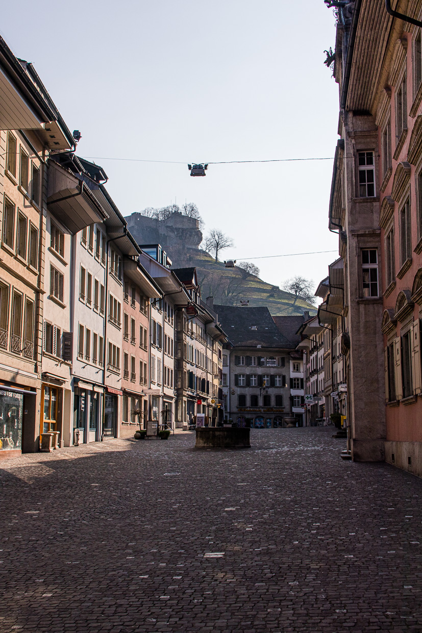Entgegen der früheren Bedeutung macht der Ort Habsburg einen beschaulichen Eindruck. Aber dafür haben sie eine nagelneue, enorm breite Strasse für die paar Leute, die hier wohnen, 423 genau Ende 2019. Gemütlich rolle ich abwärts, will nun, unten angekommen, auf meiner Route weiterfahren und rechts abbiegen.