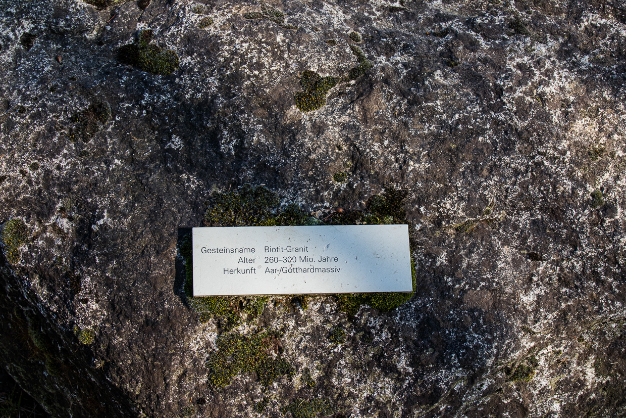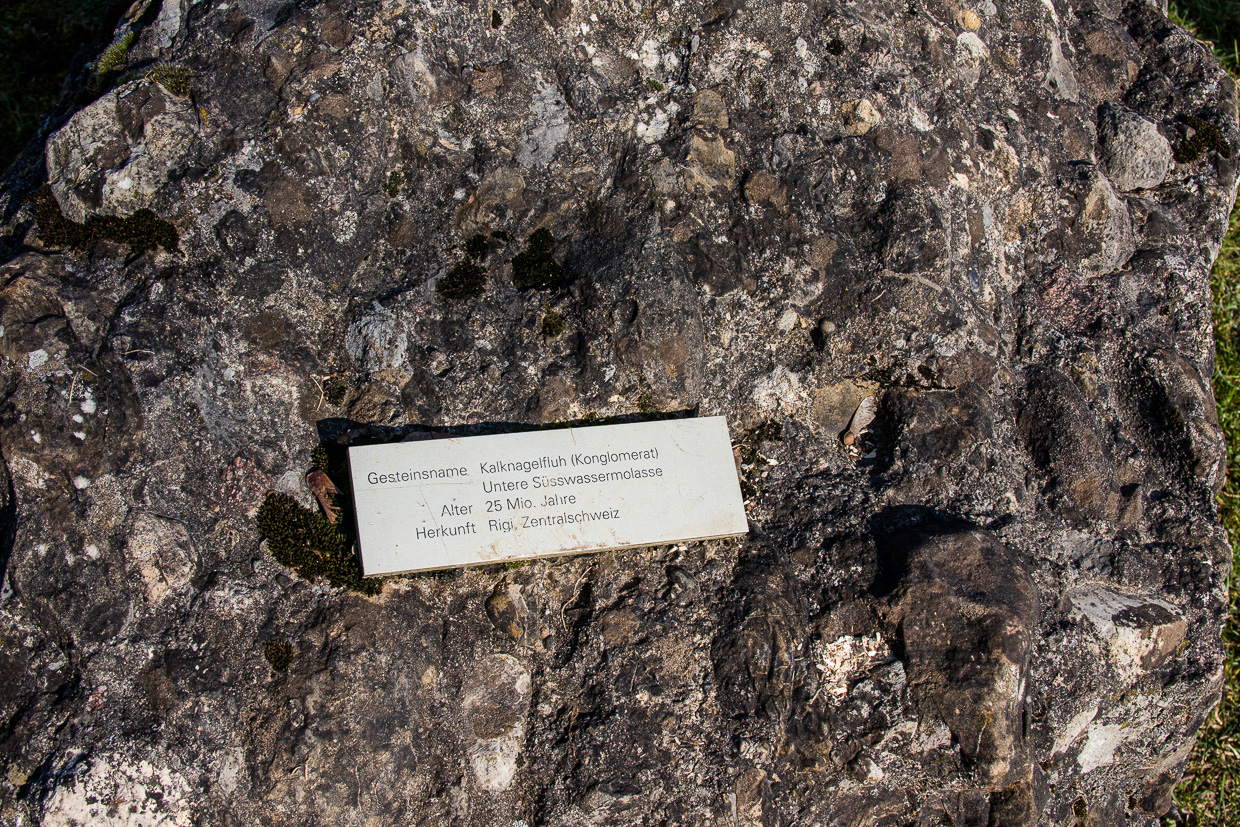 Ich fahre weiter der Aare entlang nach Schinznach Bad. Nun geht es aufwärts nach Habsburg. Ich finde einen Waldweg, der mich direkt auf die Hochebene führt. Schon von weitem erblicke ich das Schloss Habsburg, die Stammburg des einst mächtigsten europäischen Adelsgeschlechts. Wir waren bereits zweimal zu Fuss hier während einer Wanderung von Wildegg nach Habsburg und Brugg. Es ist jetzt aber auch Zeit für eine Pause, die ich am Geoweg auf Findlingen einlege. Da grüssen Brocken aus der Innerschweiz, die in der letzten Eiszeit ins Mittelland transportiert wurden.