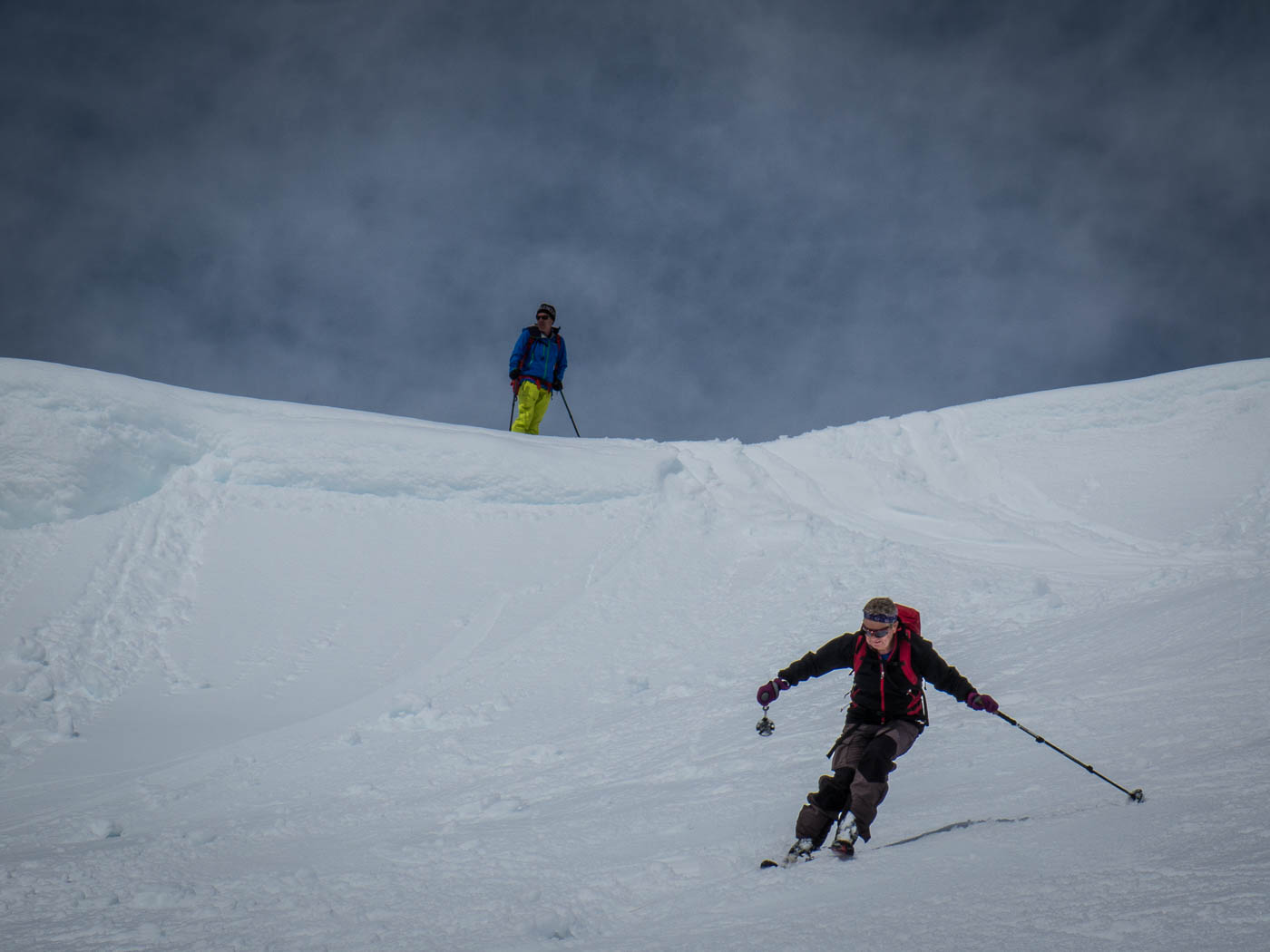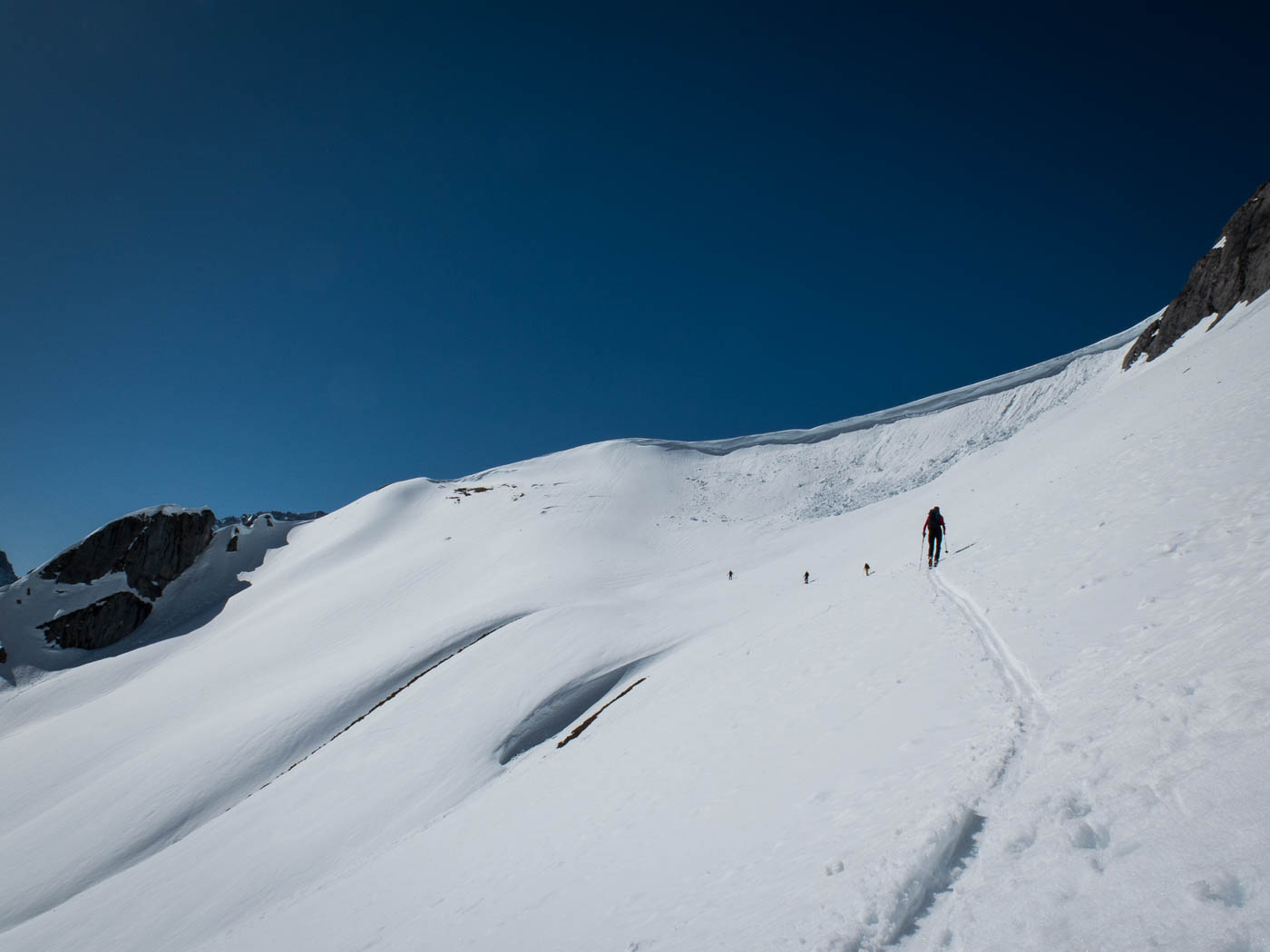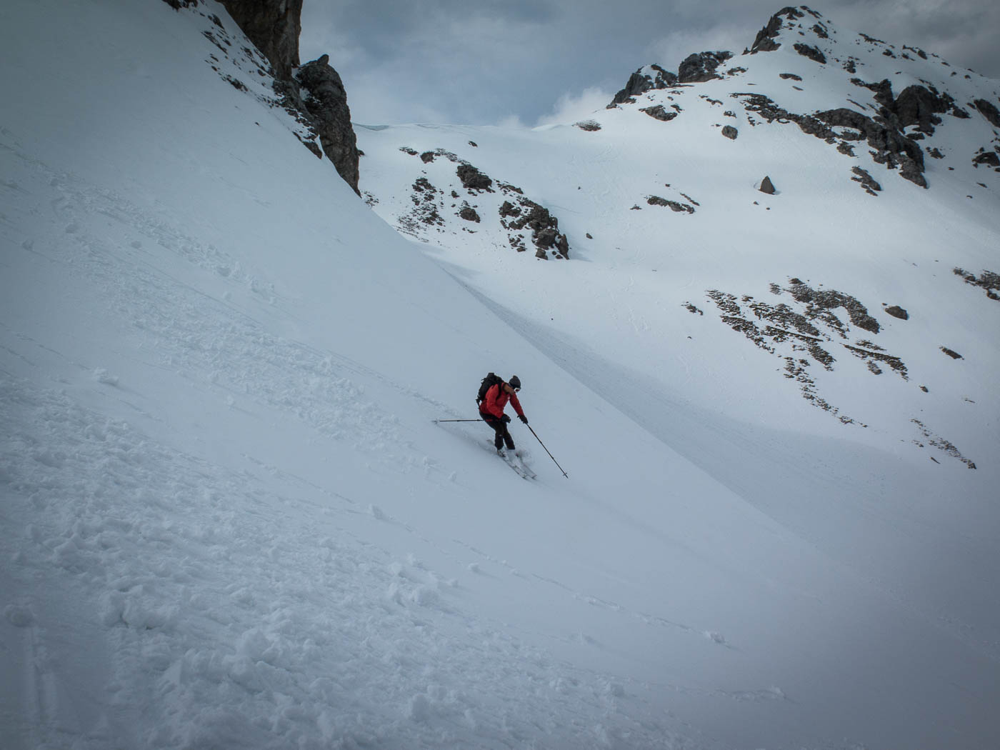 Die erste Abfahrt führte uns direkt in die Höll (es wurde immer schlimmer). Der riesige Lawinenkegel, der in der Ebene lag, sorgte wohl für ein Höllenspektakel, als sie abging. Durch das Höllreise genannte Kar stiegen wir zur Grünsteinscharte auf. Etwas verdutzt waren wir, als wir auf einem Felsturm ein Fahrrad entdeckten. Was den Leuten alles einfällt! Nach Verpflegung und Gesang machten wir uns bereit für die nächste Abfahrt. Im besten Schnee, den wir in dieser Woche bis jetzt hatten, sausten wir hinunter bis fast zum Drachensee, nur um abermals aufzusteigen, diesmal zum Tajatörl. Die Landschaft war eindrücklich, mächtige Felswände türmten sich über uns. Man kam sich so richtig klein vor.
