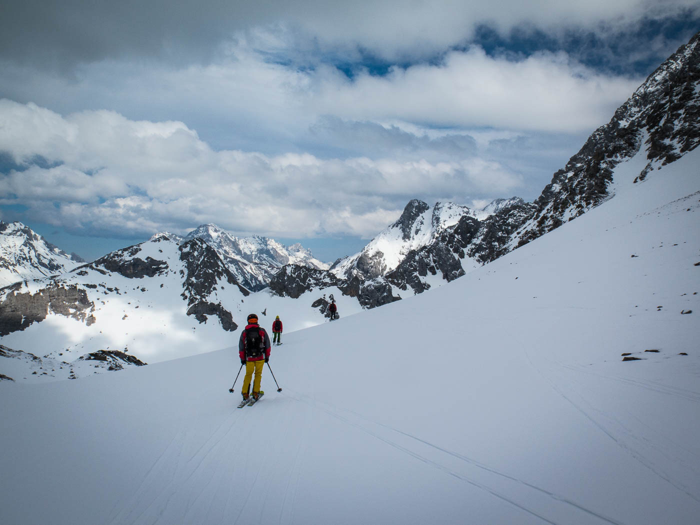 Wir machten uns nun aber auf den Weg. Durch einen langen Tunnel erreichten wir den Start zur Abfahrt. Diese war ziemlich steil. Ebenso steil waren die Wände, die sich links und rechts erhoben. Der Schnee war wie schon die ganz Woche von sehr unterschiedlicher Qualität, mal schön zu fahren, mal Edelpflotsch, wie man in der Schweiz sagt. Je weiter wir nach unten fuhren, desto dürftiger wurde die Schneedecke, man musste aufpassen, dass man nicht über einen Stein fuhr. Bei der Waldgrenze erreichten wir die Strasse, auf der wir noch ein Stück fahren konnten, bevor uns der Frühling einholte und wir die Skis zur Talstation tragen mussten.