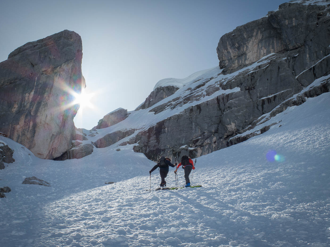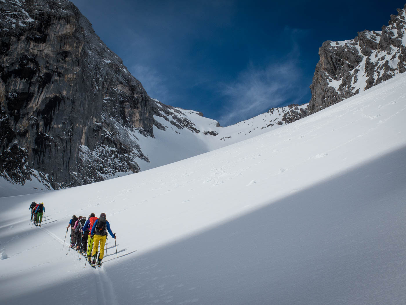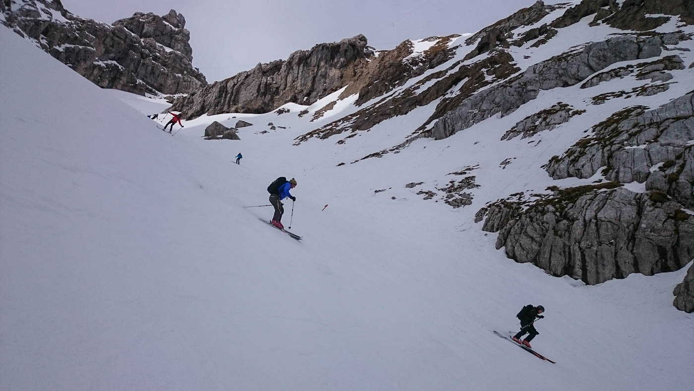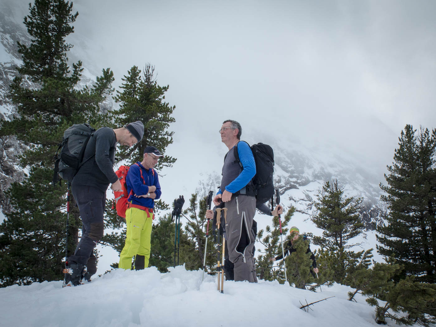 Irgendwann war aber auch hier Ende der Fahnenstange, wir mussten die Skier kurz ausziehen und uns durch die Latschen kämpfen. Danach wurde der Weg wieder breiter. Dann erblickte ich auf einer grossen Ebene drei Schneehütten. Von hier kamen die Leute also, nix Helikopter. Unsere Respekt für diese erhöhte sich schlagartig. Nun brach auch noch die Sonne durch den Nebel und löste diesen allmählich auf. Wir setzten unseren Aufstieg durch das baumlose Grieskar fort. Der Schnee fühlte sich gar nicht übel an, könnte eine gute Abfahrt geben. Gegen Schluss wurde es immer steiler, der oberste Hang war 45 Grad steil (Gattinen und Partnerinnen lesen hier bitte 30 Grad). Für mich stimmte es nicht mehr, der Hang war sonnenbeschienen, der Tournleiter trat grosse Schneemassen los. Ich tat kund, dass ich umkehre. Das kam einigen gerade gelegen, so dass die Hälfte der Gruppe vor dem steilsten Hang umkehrte. Vielleicht bin ich ein Angsthase, ein Feigling, aber wenn ich nicht zwingend hoch muss und mir mein Bauchgefühlt zur Umkehr rät, dann kehre ich halt um.