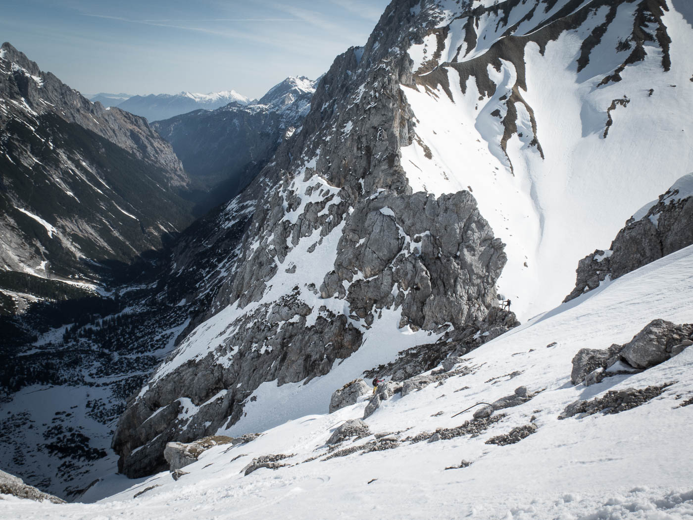 Unsere Basis war in Mittenwald, dem letzten Ort vor der Grenze zu Österreich (oder eben das erste nach der Grenze). Für Skitouren ist er nicht wirklich ideal gelegen, da man dazu immer das Auto braucht, für die gegebenen Umstände (wenig Schnee) aber ideal, weil man sich so alle Optionen offen hält. Der Ort selber liess keine Wünsche offen: Sehr schöne Hauptgasse, an der auch unser Hotel lag, und sehr ruhig – ausser Samstagnacht, wenn die Dorfjugend feiert und am Morgen stockbetrunken den Frühschoppen in unserem Hotel einnimmt… Mittenwald ist berühmt für die Geigenbauerkunst und beherbergt auch ein Museum zu diesem Thema. Mit der Karwendelbahn gelangt man zur zweithöchsten Bergstation von Deutschland, dem Ausgangspunkt der Dammkarskiroute.