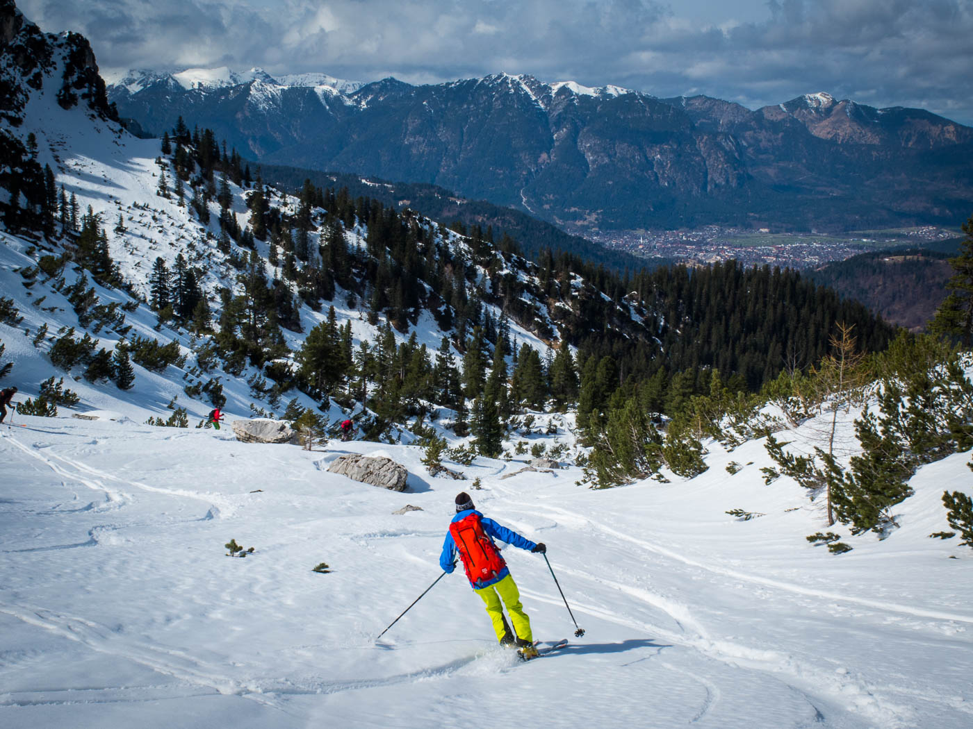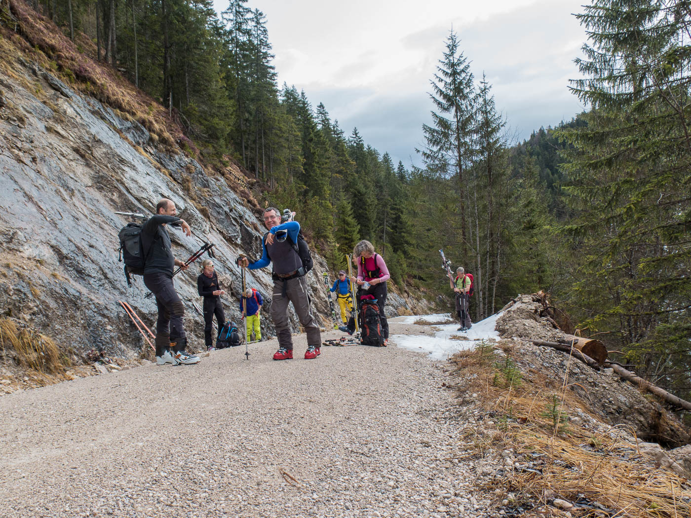 Der Sonntag war der erste Tourentag, allerdings liess der Morgen unsere Laune nicht jubilieren: Es regnete in Strömen. So liessen wir uns das Frühstücksbüffet im Hotel ausgiebig munden, bevor wir zur Tour aufbrachen. Zum Glück liess der Regen nach und wir starteten bei dezentem Sonnenschein nahe dem bekannten Hotel Elmau. Wir stiegen einem Bach entlang hoch, eine Wasseramsel pfeilte an uns vorbei. Nur langsam stieg der Weg an. Dann wurde die Schlucht weiter, der Weg stieg an. Und damit fielen die Probleme an, denn ab sofort absolvierten wir ein Intervalltraining: Skis abziehen – Skis tragen – Skis anziehen – gehen, immer so weiter. Der Wald wollte scheinbar nicht enden, aber irgendwann erreichten wir die Waldgrenze doch noch. Das heisst, die Bäume wurden einfach niedriger, Legföhren (hier Latschenkiefern genannt) bestimmten nun das Landschaftsbild. Der Vorteil war aber, dass wir über diese Bäume hinwegsehen konnten, wir blickten auf die anderen Berge, die zu unserem Leidwesen schneefrei waren, und auf Garmisch-Partenkirchen.