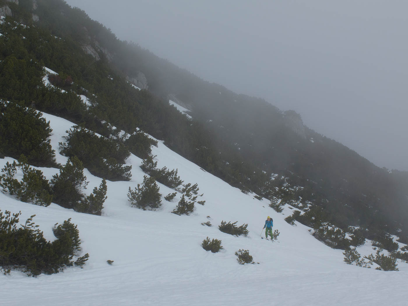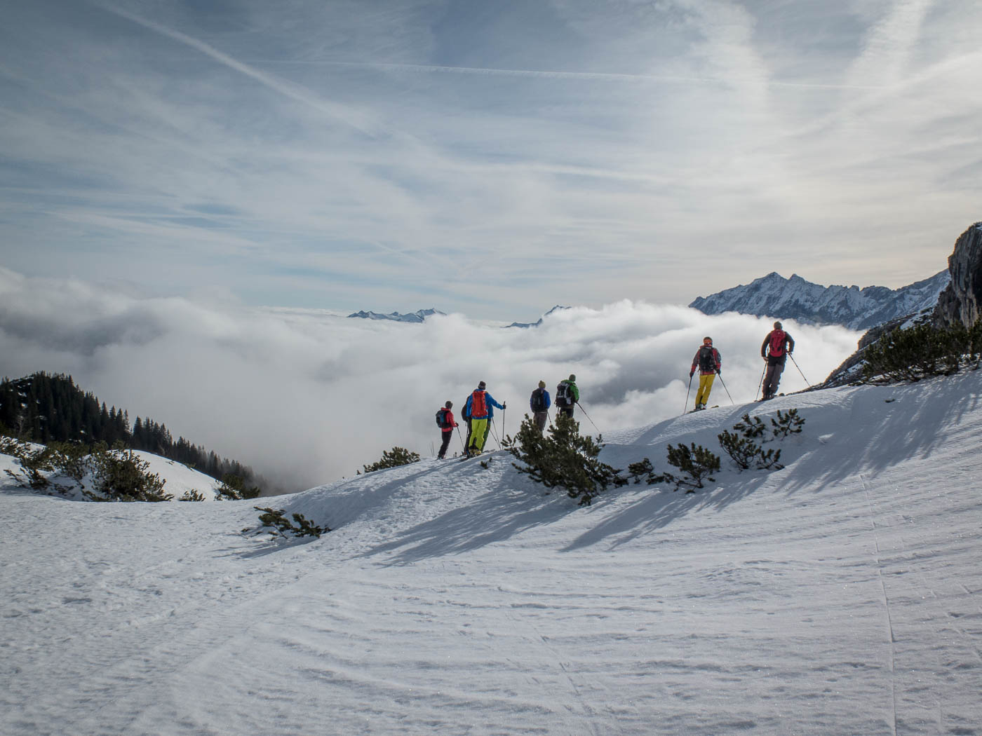 Eine schöne Bahnentour, dachten wir. Leider lief aber der eine Lift, der uns am Schluss der Tour wieder ins Skigebiet bringen sollte, nicht mehr. So lösten wir halt nur für die Alpspitze. Die Bahn startete im Nebel, aber kurz vor dem Gipfel tauchte die Gondel daraus hervor und die Sonne blendete uns. Das sollte aber nicht lange währen, wir fuhren hinunter in den Nebel, auch die gesperrte Piste, denn nur so konnten wir in unser Tourengebiet gelangen. Wir stiegen hoch, zuerst durch den Wald, dann auf einer vom DAV markierten Route, quer durch Legföhren. Plötzlich kamen uns mehrere Personen auf Skiern und Snowboards mit riesigen Rucksäcken entgegen. Da es Nebel hatte und wir vorher Helikoterlärm hörten, schlossen wir daraus, dass diese Leute hochgeflogen wurden und sie nun die Abfahrt genossen (so gut das überhaupt ging bei dem Schnee und den vielen Latschen). Irgendwann mussten wir vom Weg abgekommen sein, denn die Föhren wurden immer dichter, bis uns nur noch ein drei Meter breites Schneeband zur Verfügung Stand. Das bedeutete: Drei Schritte – Spitzkehre – drei Schritte – Spitzkehre und so weiter. Wenigstens beherrschten sie auch die Ungeübteren wieder.