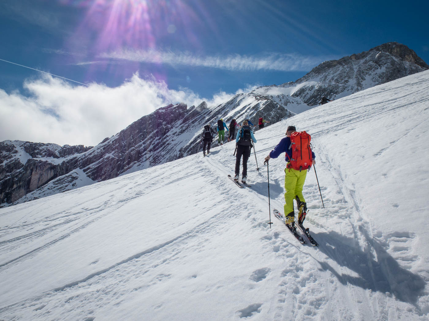 Viel Zeit hatten wir nicht, um den den Grenzübertritt zu feiern, wir mussten wegen der Wärme weiter. Prompt löste der Tourenleiter eine Nassschneelawine aus, aber zum Glück ohne Folgen. Wir fuhren in den Kessel hinunter. Und nun? Wir standen unten, rundum ging es steil hoch. Und das bei dieser Wärme! Aber der Tourenleiter legte eine sehr gute Spur durch das flachmöglichste Gelände. Oben angekommen, waren wir noch nicht aus dem Schneider. Wir mussten nochmals einen grossen Kessel queren, bis wir „Am Brand“ ankamen. Wächten bedrohten den Aufstieg, besonders steil war es nicht. Abermals legte der Tourenleiter eine perfekte Aufstiegsspur hin. Erst von der Scharte aus konnte man erkennen, dass über den Felsen nochmals ein grosses Schneefeld lag, das bei zunehmender Wärme hätte abrutschen können. Zum Glück passierte nichts. Nun mussten wir nur noch ins Skigebiet von Ehrwald hinunterfahren, was nicht ganz so einfach war bei diesem schweren Schnee. Aber wir schafften es doch noch, belohnten uns in der erstbesten Beiz mit einem Radler. In Ehrwald hiess es dann Abschied nehmen von der grossartigen Landschaft, eine lange Heimreise stand uns nun bevor. Aber wir hatten ja viele schöne Erinnerungen und Erlebnisse im Gepäck dabei.