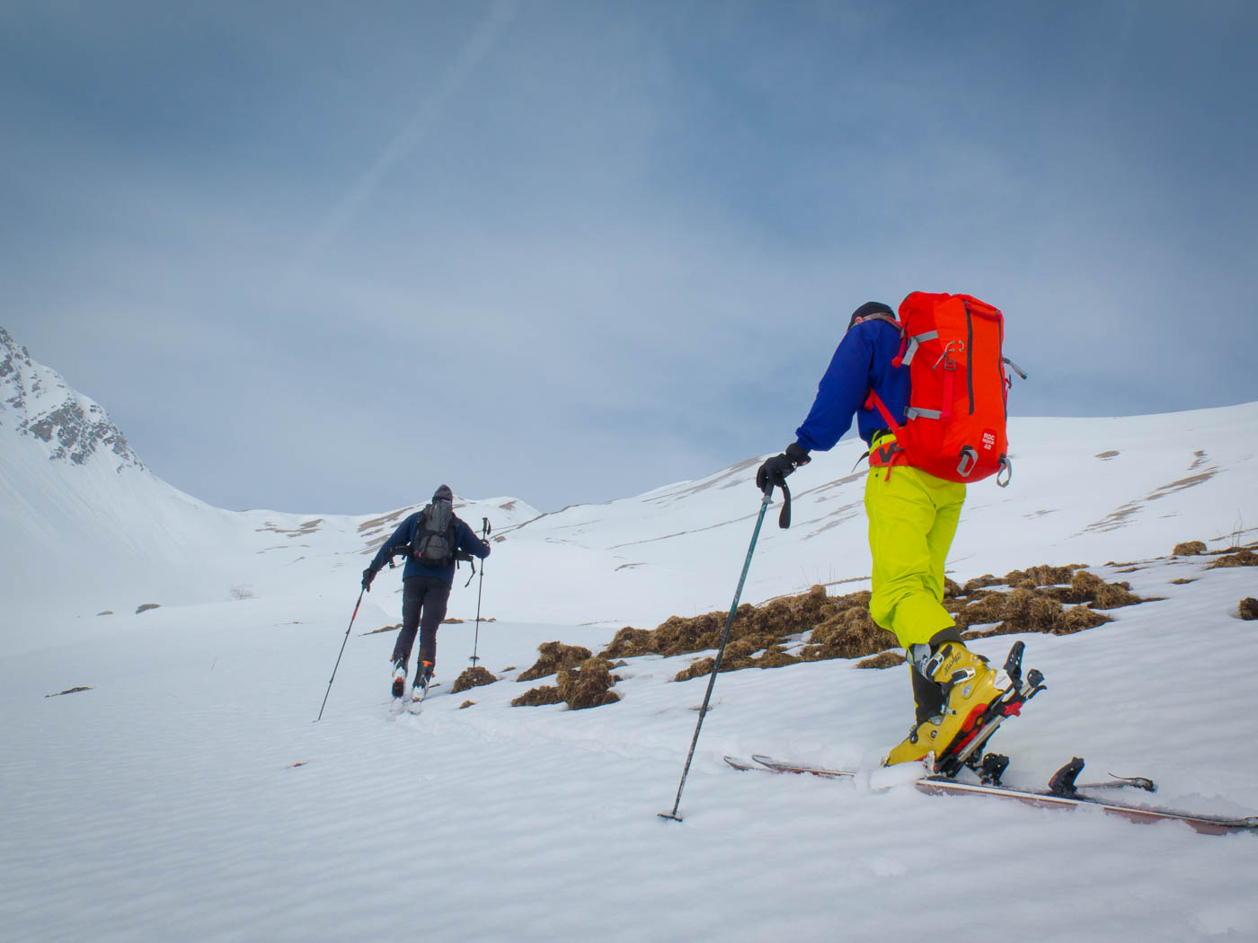 Das Wetter sollte am Morgen noch gut sein, erst am Nachmittag würde die Bewölkung zunehmen. Jedoch schmückten bereits bei der Anfahrt Regentropfen die Windschutzscheibe. Bis Lermoos in Österreich war aber der Spuck vorbei, wir entstiegen oberhalb des Ortes den Fahrzeugen. Rundum und soweit das Auge reicht war es grün, abgesehen von den Schneeresten gleich vor unseren Füssen. So banden wir die Skis auf die Rucksäcke und trugen sie rund eine Stunde, bis es endlich genug Schnee hatte, um sie dem eigentlichen Zweck zuzuführen.