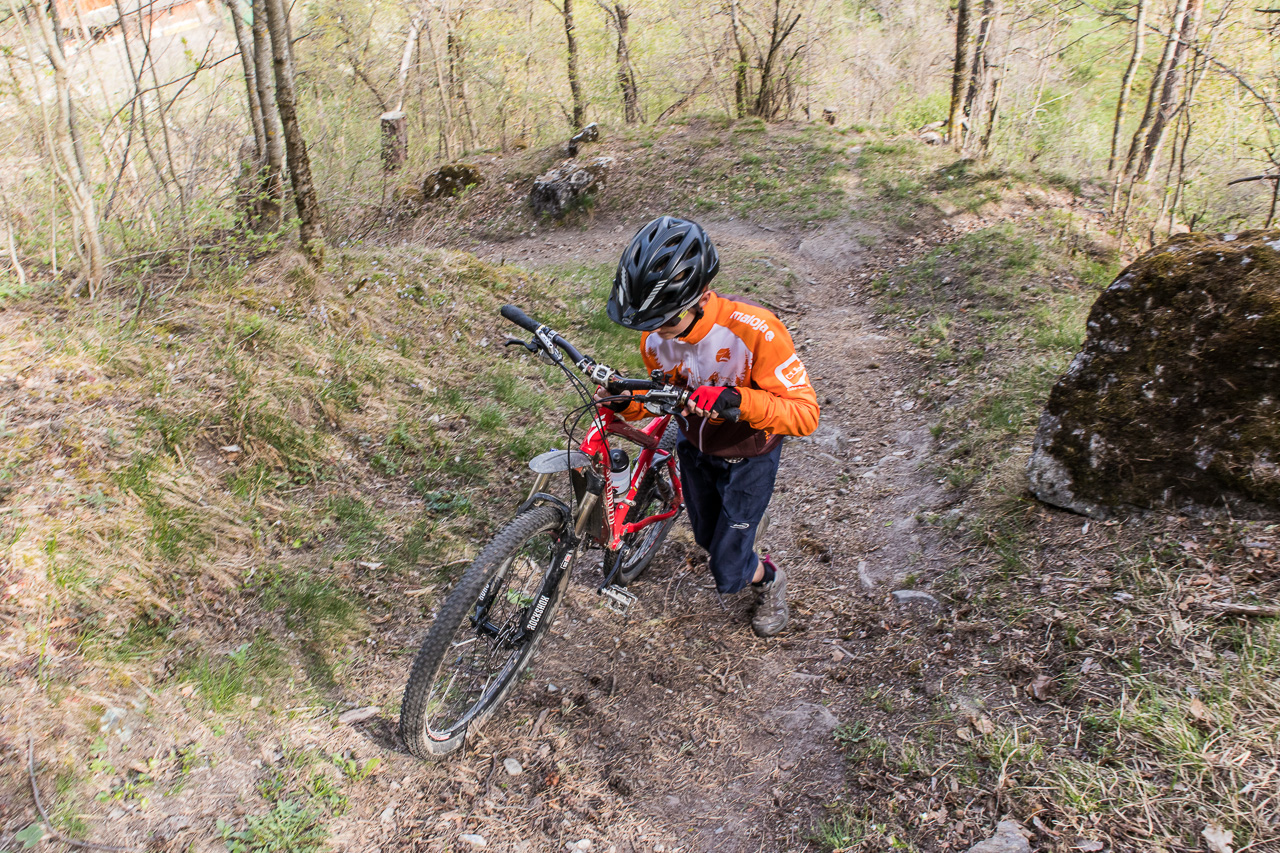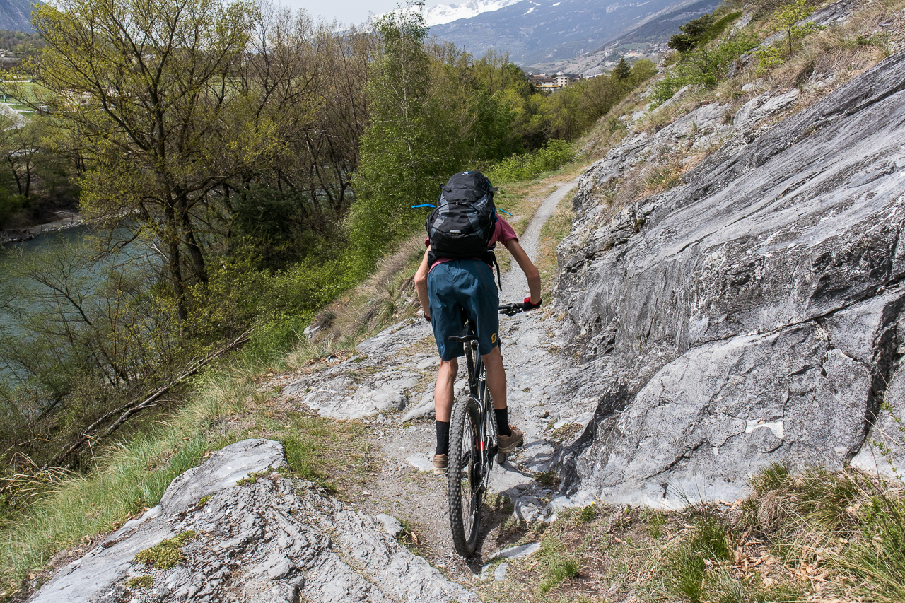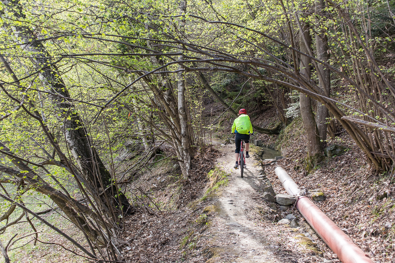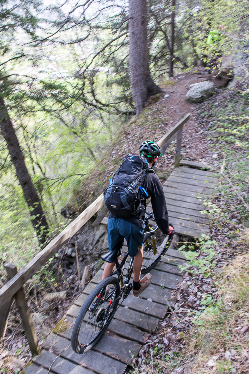Die Frau findet die Tour, die ich geplant habe, nicht besonders prickelnd und findet auf der Karte oberhalb Agarn eine Suone, eine dieser bekannten Wasserleitungen, die früher genutzt wurden, um die Felder zu bewässern. Also beginnen wir die Tour erst mal mit dieser Zusatzschlaufe. Zuerst geht es so steil bergan, dass wir schieben müssen. Dann aber erreichen wir die Suone, nun sollte es mehr oder weniger ebenaus gehen. Der Weg scheint aber kaum mehr begangen geschweige denn unterhalten zu werden, schon beim Start müssen wir eine kleine Brücke überqueren, die eine ziemliche Lücke hat. Das hindert die Jungs nicht daran, darüber hinweg zu fahren. Auch sonst ist der Weg herausfordernd, auch weil es links senkrecht abwärts geht und er ist stellenweise abgerutscht, so dass nur noch ein sehr schmales Band begehbar ist. Nicht gerade mein Fall, ich schiebe lieber mal. Müssen die Jungs halt wieder auf uns Alte warten, denn sie finden es spannend. Am Schluss meint Fabian, „ich bin auch einmal abgestiegen.“ Nun gut, ich und die Frau etwas mehr.