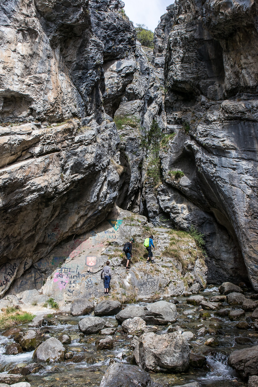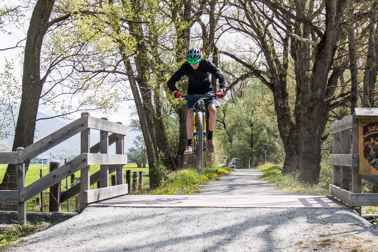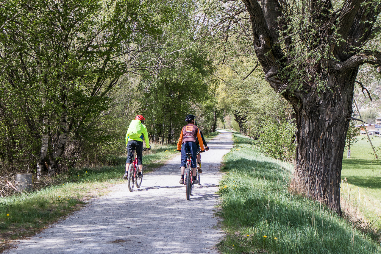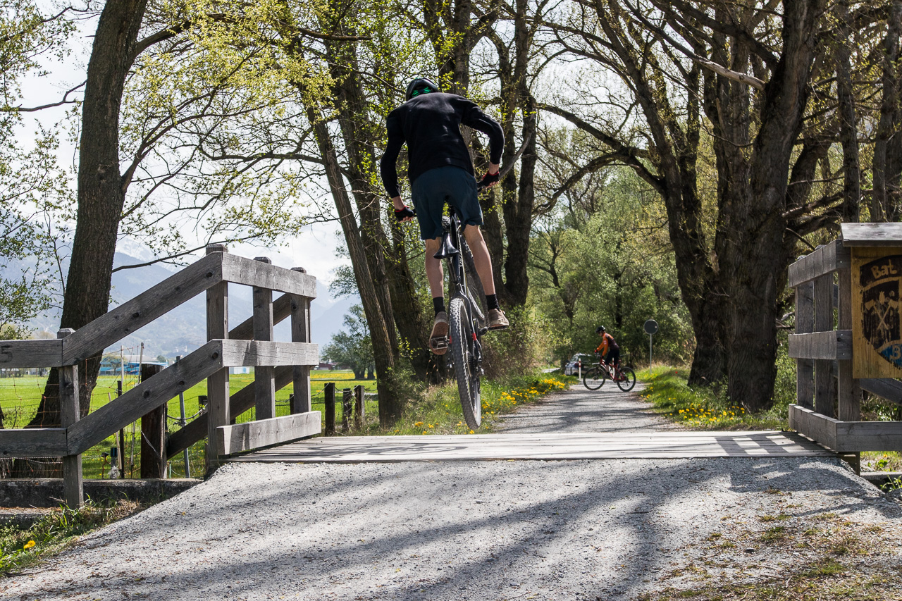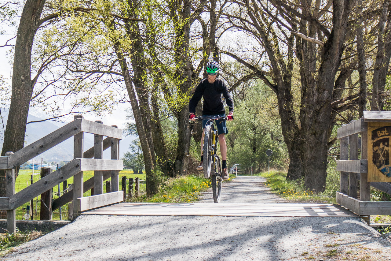 Wir überqueren den Rotten, wie der Fluss im Oberwallis heisst, und fahren auf der Rhoneroute 1 Richtung Gampel. Der Föhn bläst heftig, es ist mühsam zum Vorwärtskommen. Die Familie fährt, so gut es geht, in meinem Windschatten. Bei einem Rastplatz legen wir eine Pause ein, die die Jungs zum Springen nutzen.