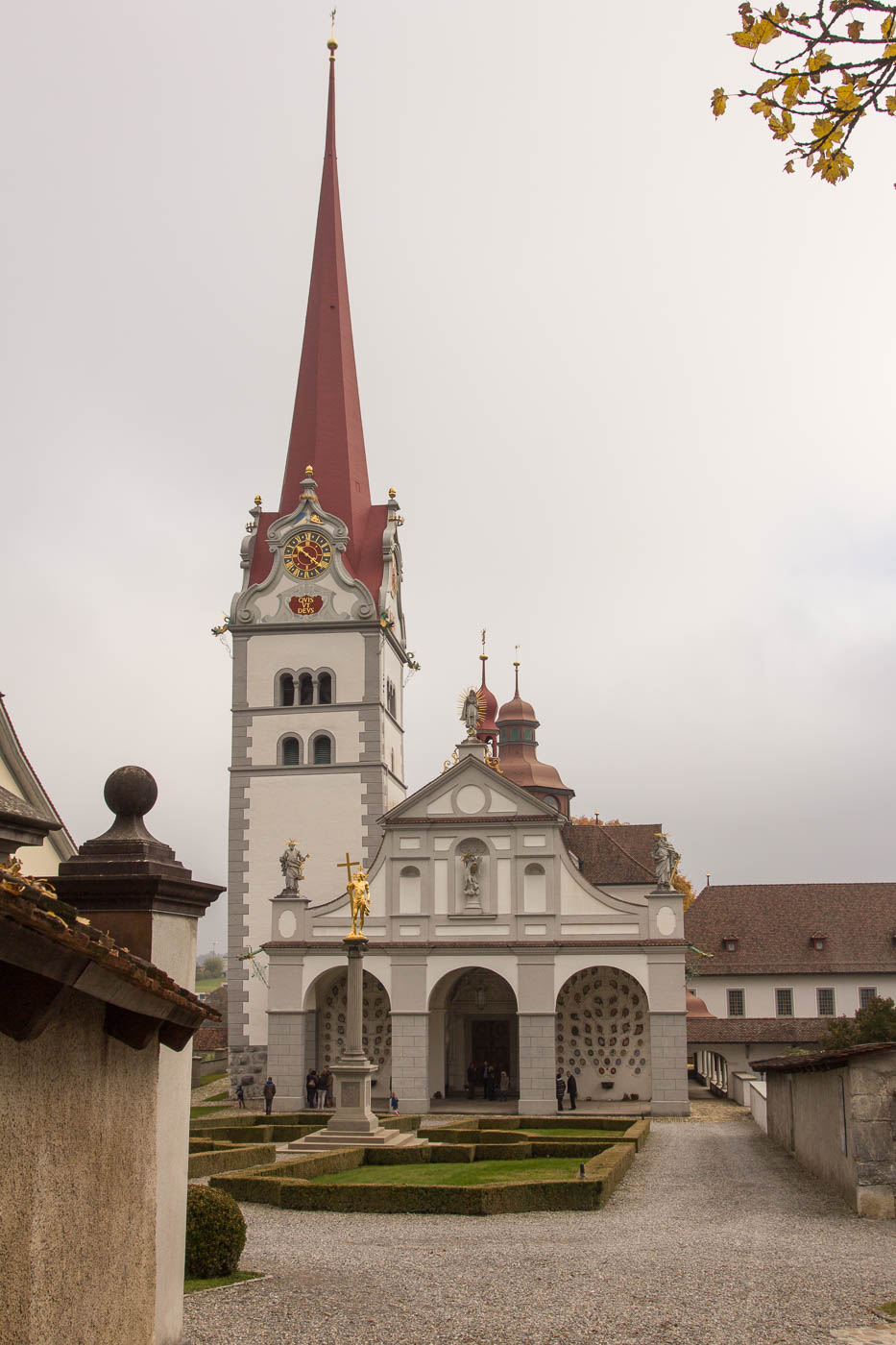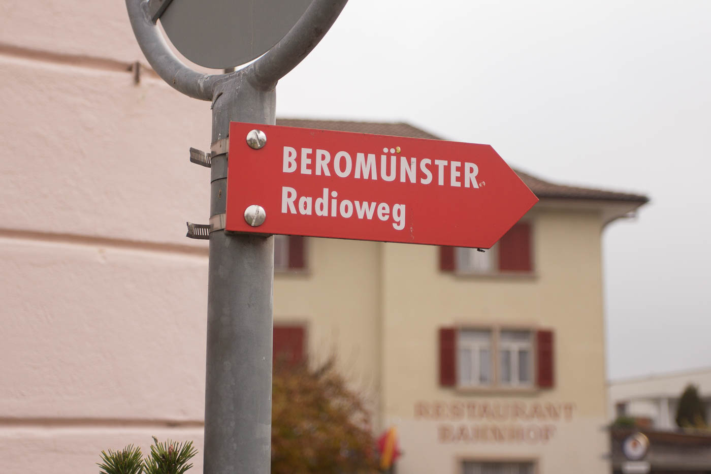 Der Radioweg startet beim Busbahnhof in Beromünster. Wir folgen den roten Schildern, die direkt in den Flecken hinein führen. Eigentlich gäbe es einen kürzeren Weg zur ersten Hörstation, aber Beromünster und das Stift muss man einfach gesehen haben, der Umweg ist sozusagen ein „Amuse Bouche“, um sich den Ort nach der Wanderung noch genauer anzusehen. Wir wandern also vorbei am imposanten Stift und erreichen die erste Hörstation. Wir erfahren hier etwas zur Entstehung und Geschichte des Mittelwellensenders.