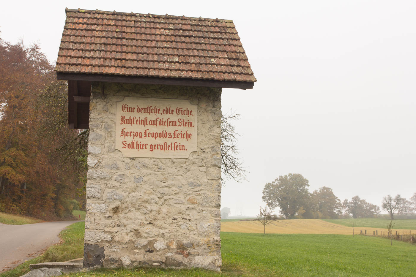 Wir gehen weiter zu Posten 2, von wo man Beromünster überblickt. Jede Station ist einem Thema gewidmet, zum Beispiel dem Cabaret, Radiopannen, der Musik oder dem Sport. Unser Weg führt an der St. Theobalds-Kapelle vorbei. Hier soll die Leiche von Herzog Leopold III von Habsburg geruht haben, der 1386 in der Schlacht von Sempach gefallen war. Man fragte im Stift an, ob die Leiche dort beigesetzt werden dürfte, doch die Chorherren fürchteten die Rache der Eidgenossen und hielten den Leichenzug an eben dieser Stelle an.