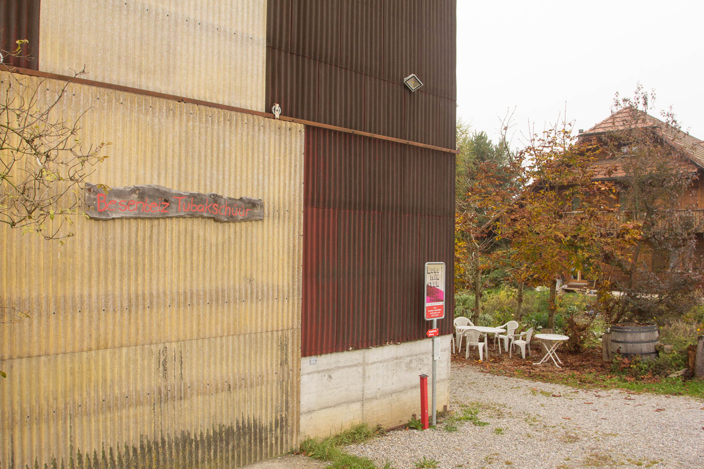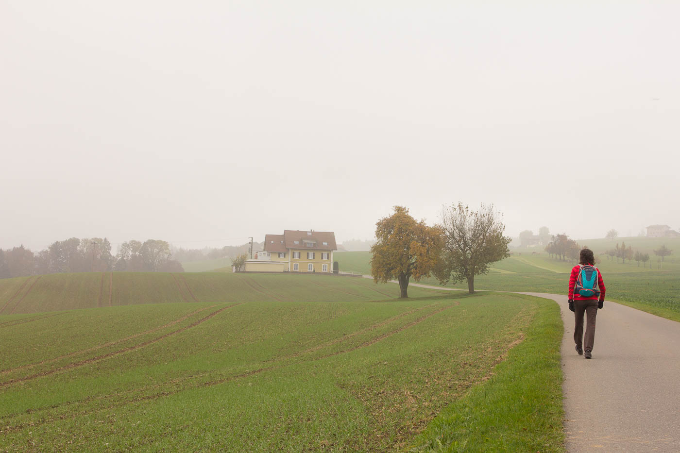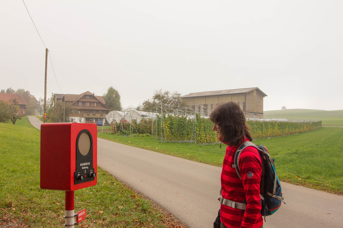 Nach der dritten Hörstation hätte man die Möglichkeit, in der Besenbeiz „Tubakschüür“ einen Kaffee zu trinken. Bei diesem Nebel lohnt sich das aber scheinbar nicht für die Bauernfamilie, jedenfalls müssen wir ohne Kaffee weiter. Der Weg verläuft nun bis zur letzten Station auf Asphalt. Positiv ausgedrückt: Man kann den Weg auch machen, wenn es ziemlich dreckig ist auf Naturstrassen.