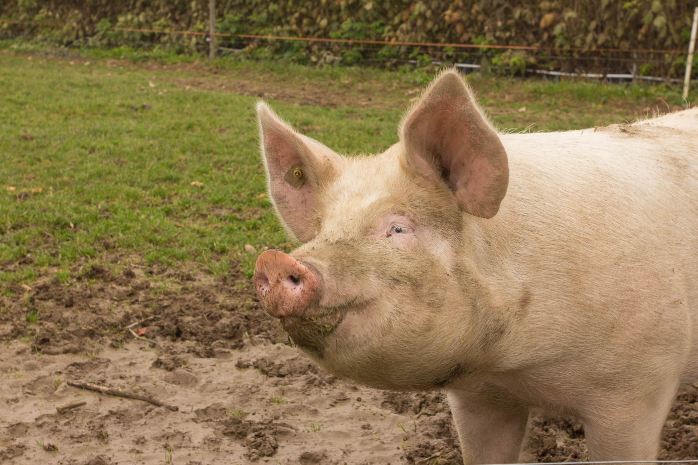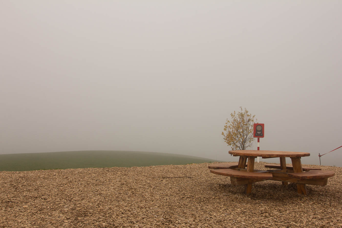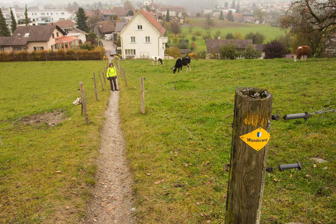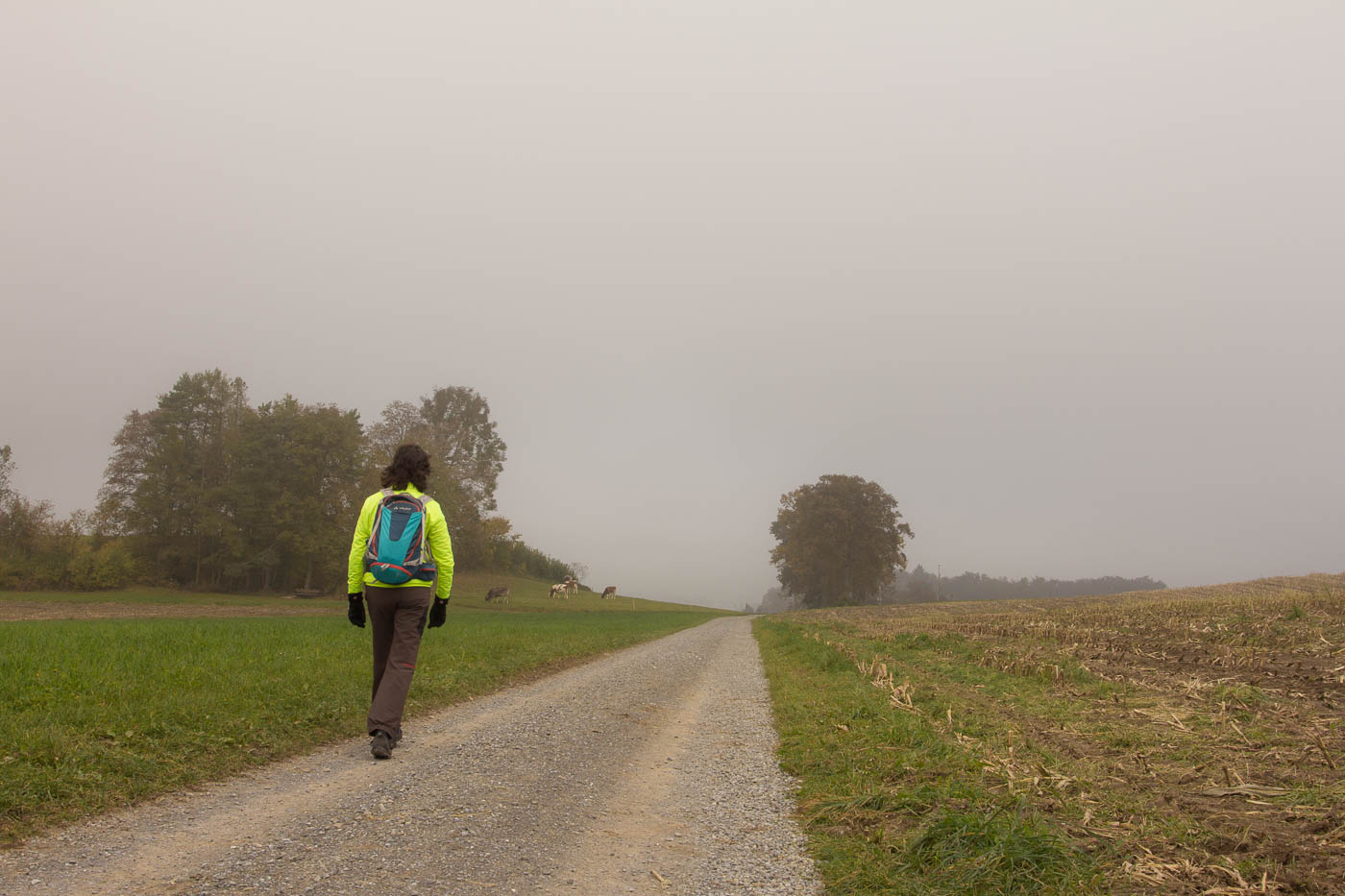 Nach der dritten Hörstation hätte man die Möglichkeit, in der Besenbeiz „Tubakschüür“ einen Kaffee zu trinken. Bei diesem Nebel lohnt sich das aber scheinbar nicht für die Bauernfamilie, jedenfalls müssen wir ohne Kaffee weiter. Der Weg verläuft nun bis zur letzten Station auf Asphalt. Positiv ausgedrückt: Man kann den Weg auch machen, wenn es ziemlich dreckig ist auf Naturstrassen.