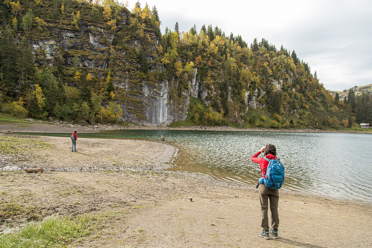 Wir wandern abwärts zum Lac de l’Entonnoir, einem kleinen Seelein, das allmählich verlandet. Aber in der Moorlandschaft wirkt es ganz romantisch – wären da nicht die Autos, die ständig hinten durch fahren. Ich muss eine Weile warten, bis ich endlich ein Bild ohne Auto im Hintergrund machen kann. Leider ist auch das Waadtland: Überall kommt man mit dem Auto hin. Beim Lac des Chavonnes ist zum Glück fertig damit. Das Restaurant direkt am See ist verführerisch, aber für eine Pause ist es noch zu früh.
